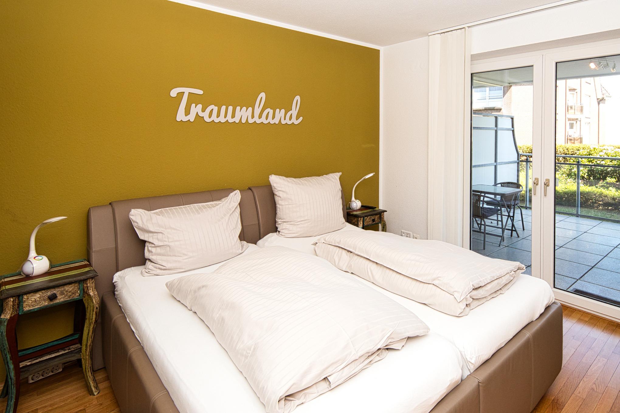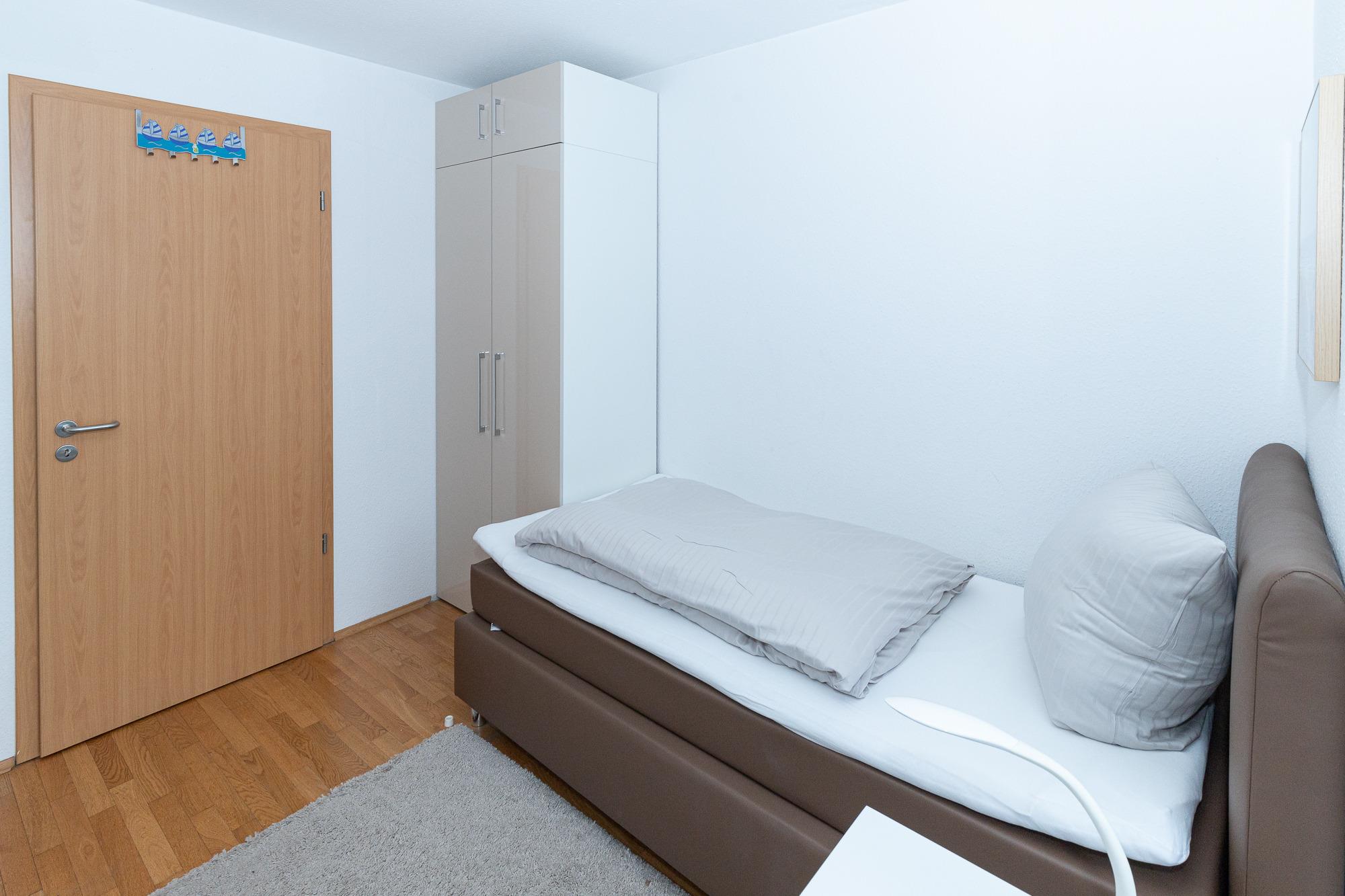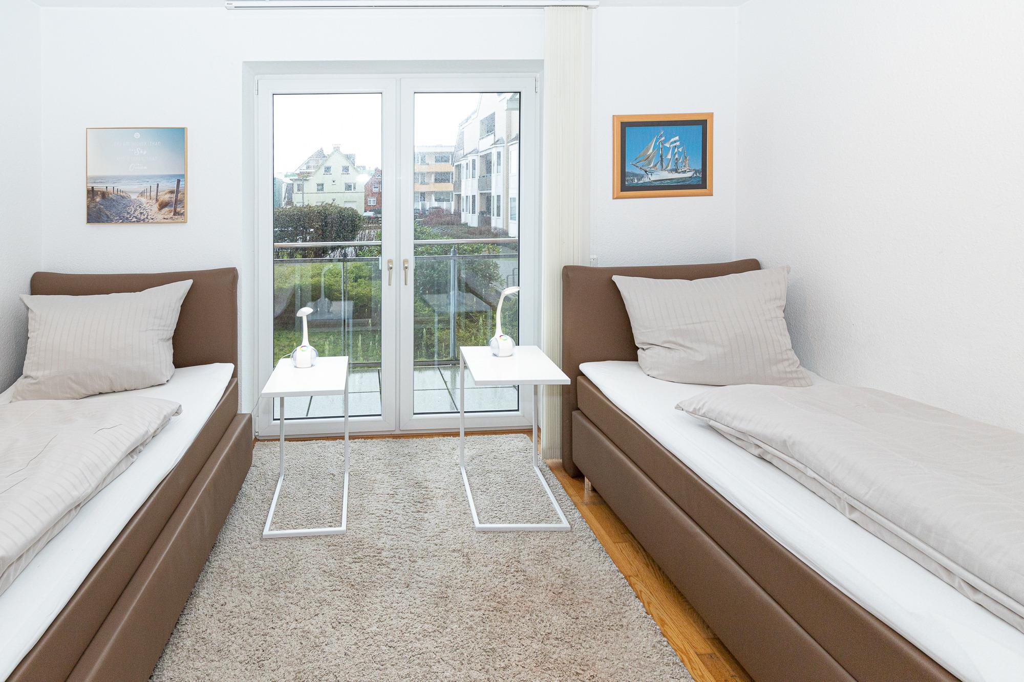 Vom Eingangsbereich, der mit Garderobe und einer Sitzmöglichkeit ausgestattet ist, gelangen Sie in die beiden gemütlichen Schlafzimmer – eines mit einem Boxspring-Doppelbett und das andere mit zwei Boxspring-Einzelbetten. Beide Schlafzimmer haben Zugang zu einem Balkon mit Seesicht, der sich wunderbar für entspannte Momente eignet. Die Wohnung verfügt über zwei moderne Bäder, eines mit Dusche und WC und das andere mit Badewanne und WC, sodass Komfort und Privatsphäre für alle Gäste gewährleistet sind.