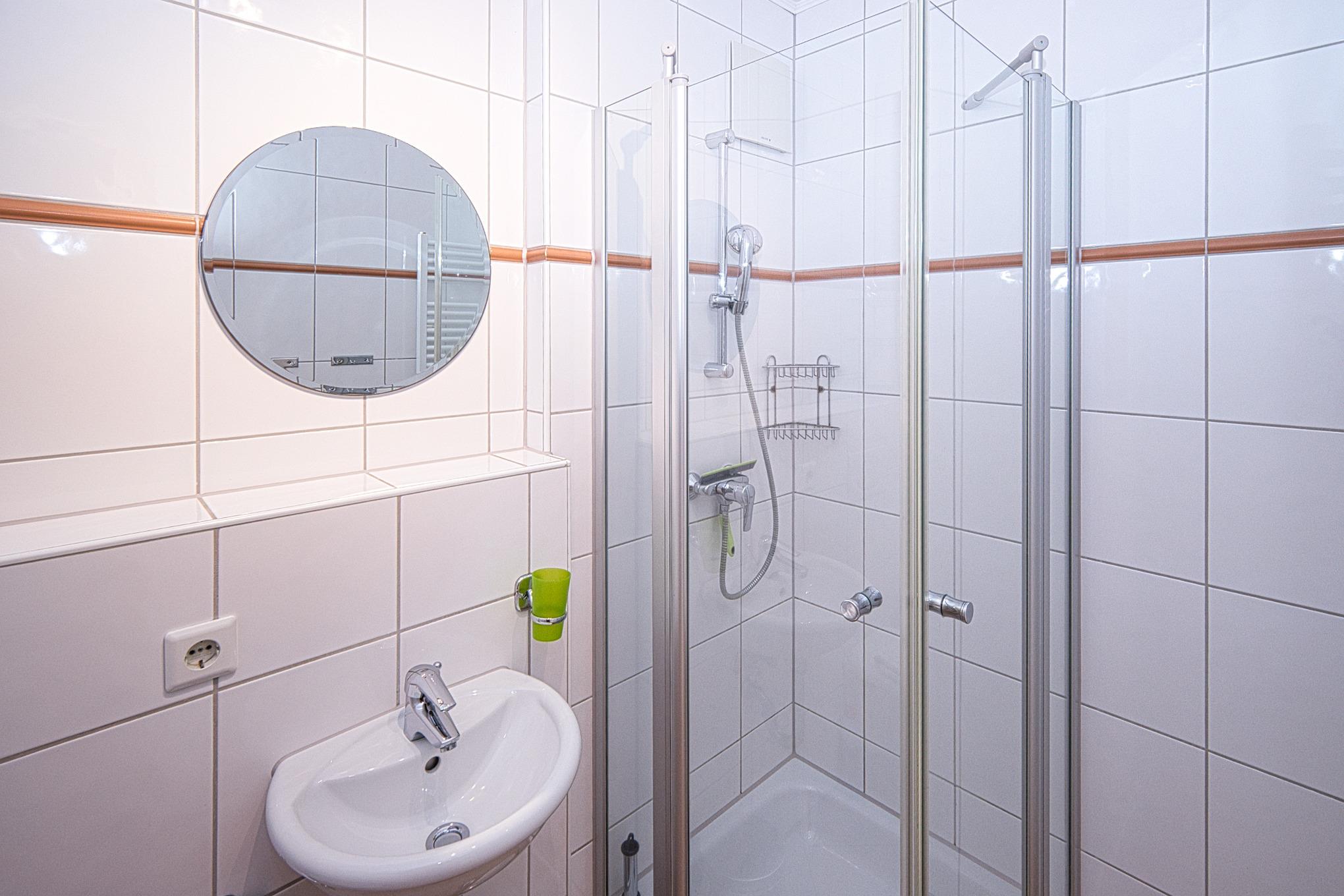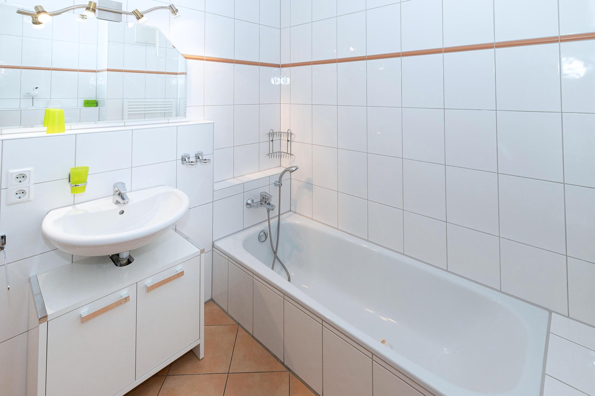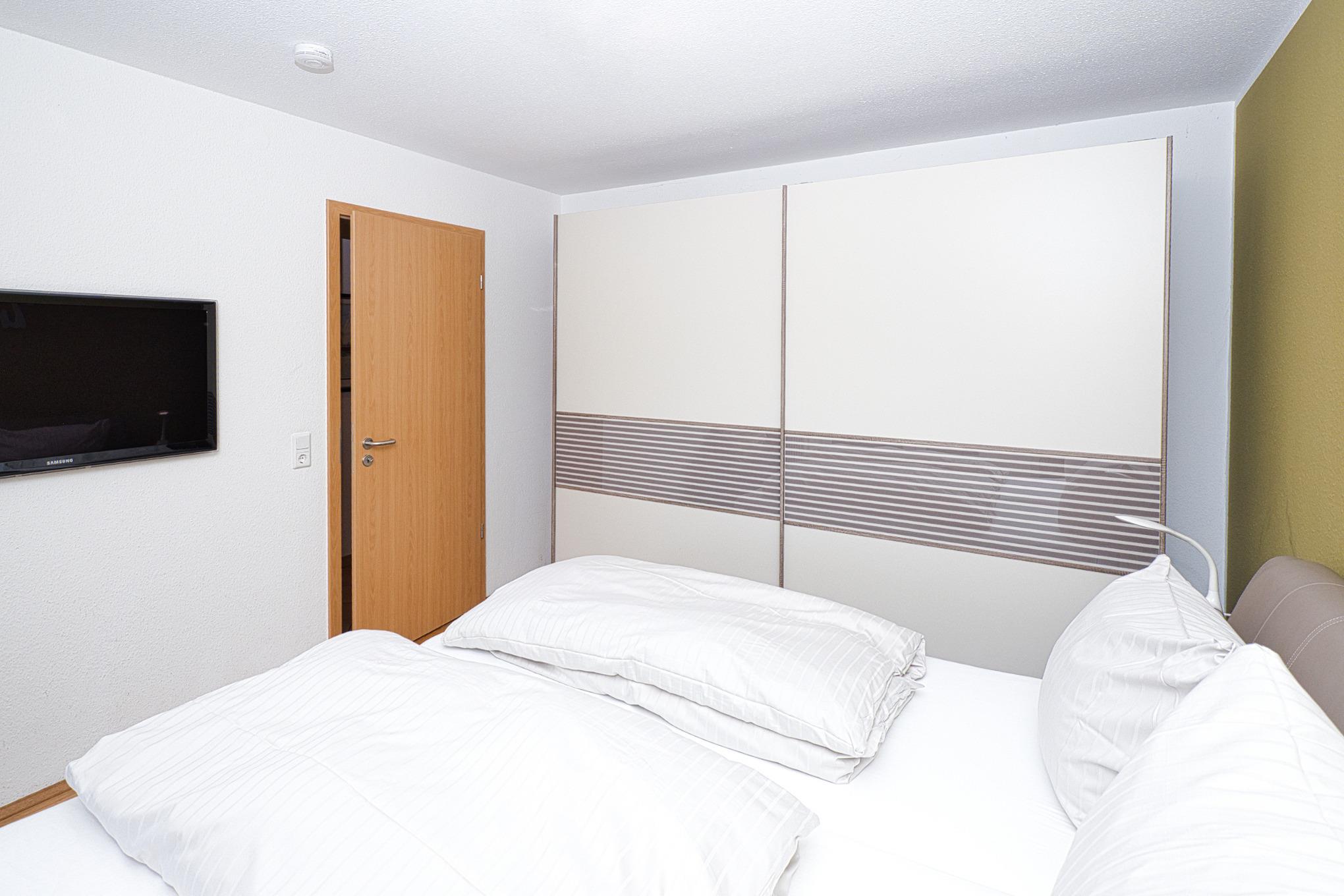 Vom Eingangsbereich, der mit Garderobe und einer Sitzmöglichkeit ausgestattet ist, gelangen Sie in die beiden gemütlichen Schlafzimmer – eines mit einem Boxspring-Doppelbett und das andere mit zwei Boxspring-Einzelbetten. Beide Schlafzimmer haben Zugang zu einem Balkon mit Seesicht, der sich wunderbar für entspannte Momente eignet. Die Wohnung verfügt über zwei moderne Bäder, eines mit Dusche und WC und das andere mit Badewanne und WC, sodass Komfort und Privatsphäre für alle Gäste gewährleistet sind.