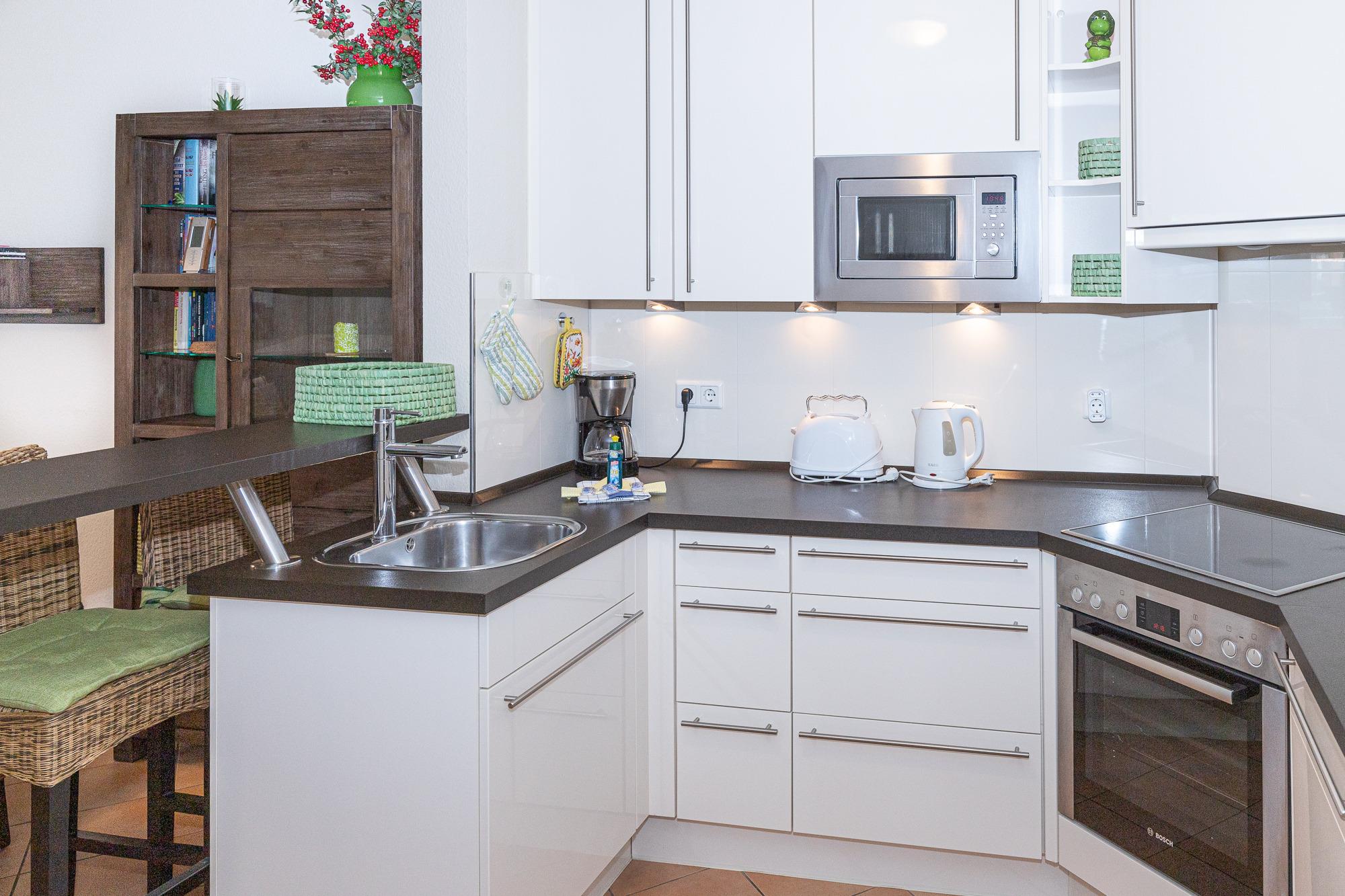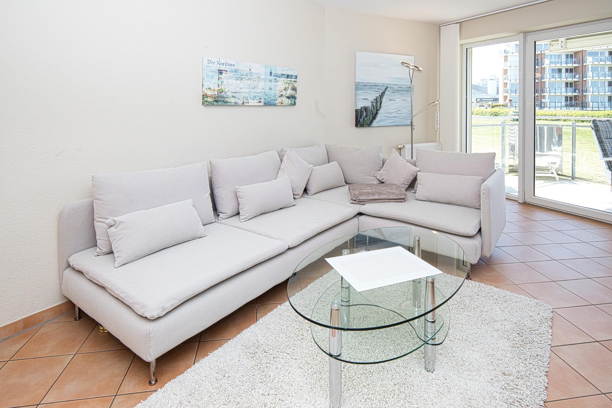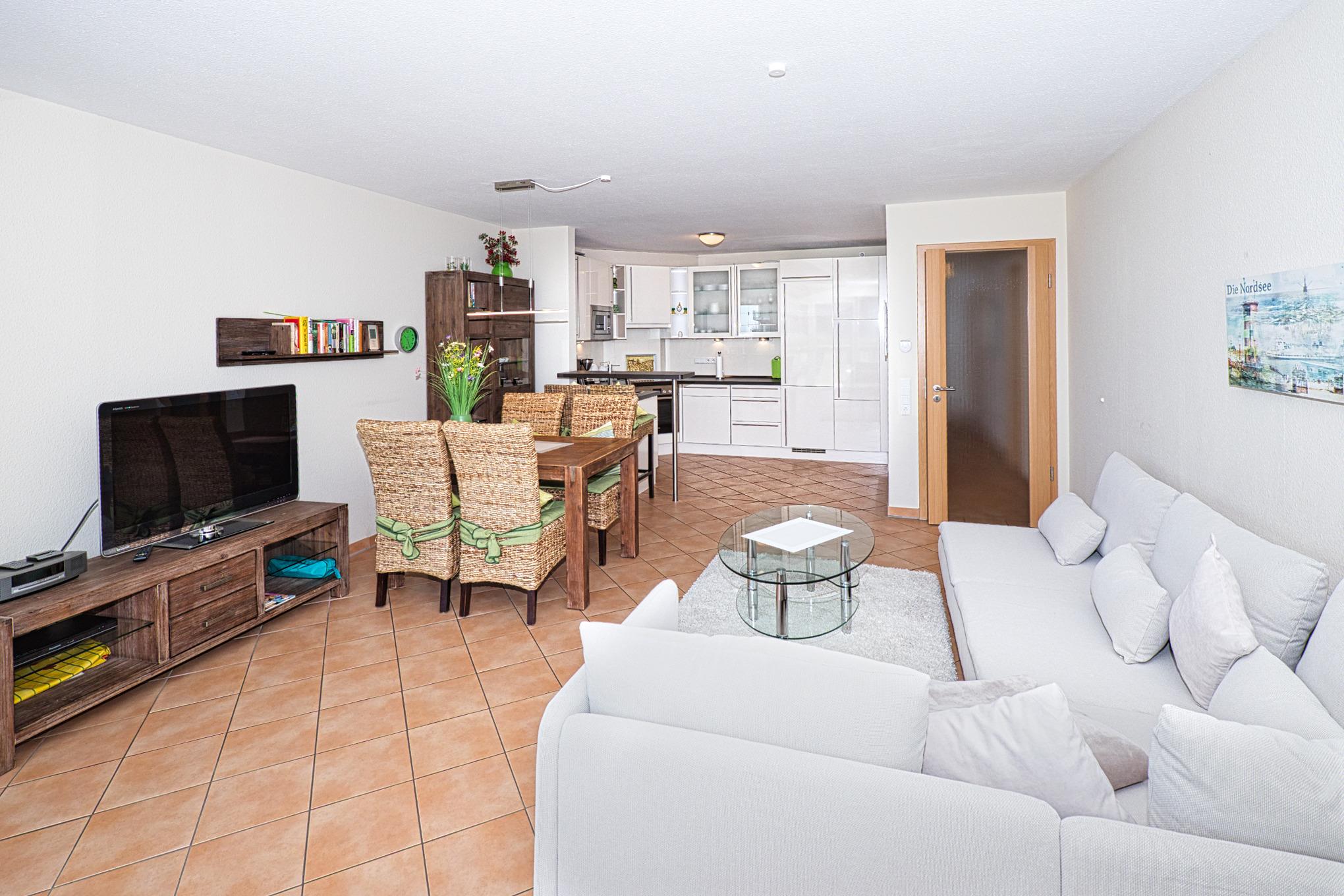 Der großzügige Wohn- und Essbereich lädt mit seiner hochwertigen Einrichtung und Fußbodenheizung zum Wohlfühlen ein. Die offene, komplett ausgestattete Einbauküche mit Tresen ist ideal, um einen Espresso zwischendurch zu genießen. Am Esstisch oder auf der gemütlichen Sofaecke lässt es sich entspannt frühstücken oder den Tag bei einem Gesellschaftsspiel ausklingen – stets mit herrlichem Blick auf die Nordsee. Der Wohnbereich bietet direkten Zugang zum Balkon, auf dem Sie die frische Meeresbrise und den Blick auf die Strandpromenade genießen können.