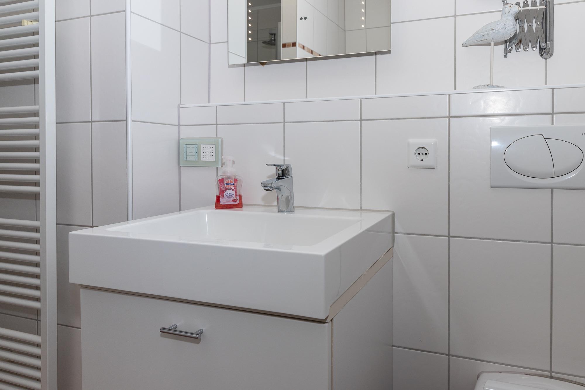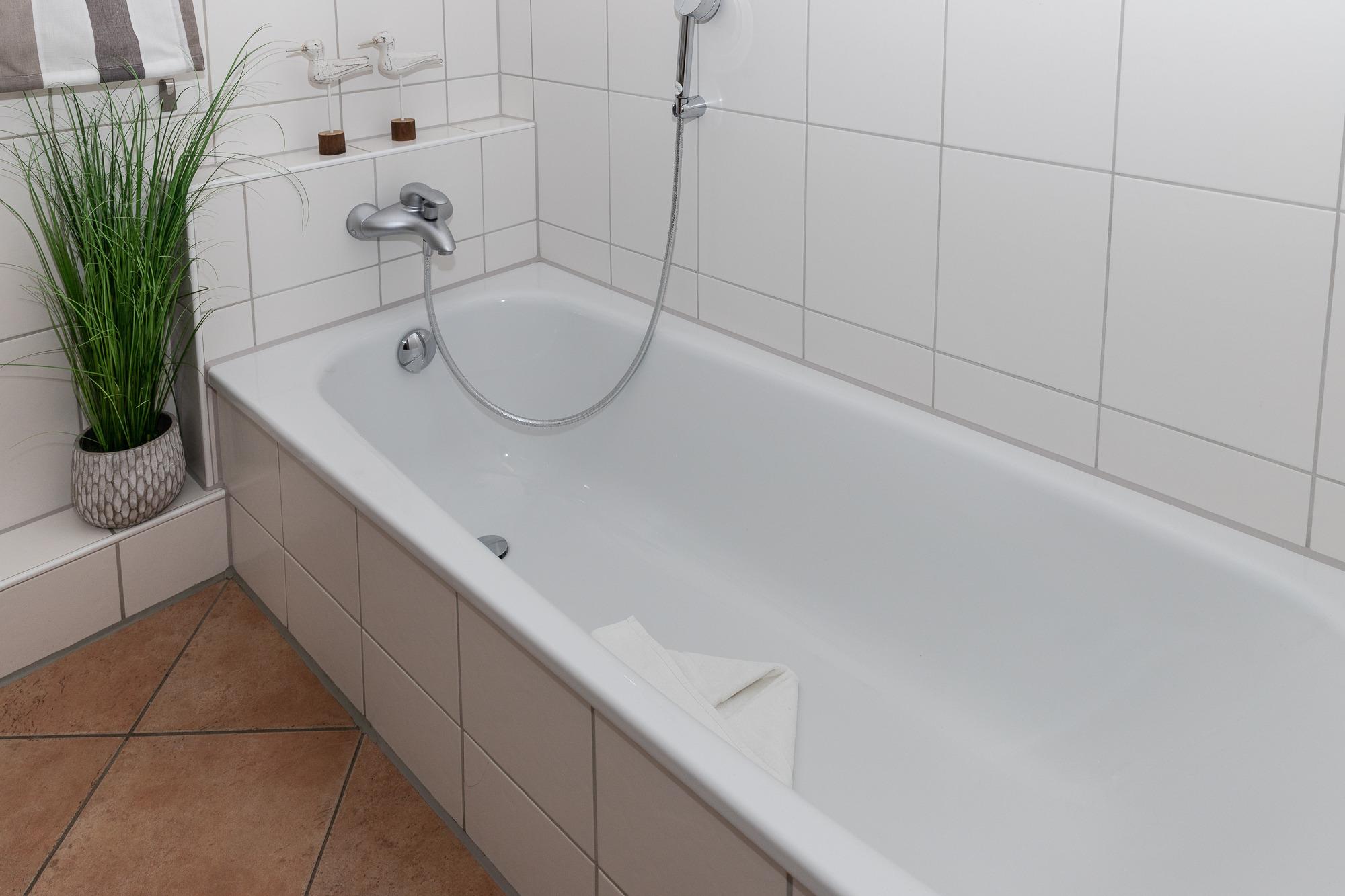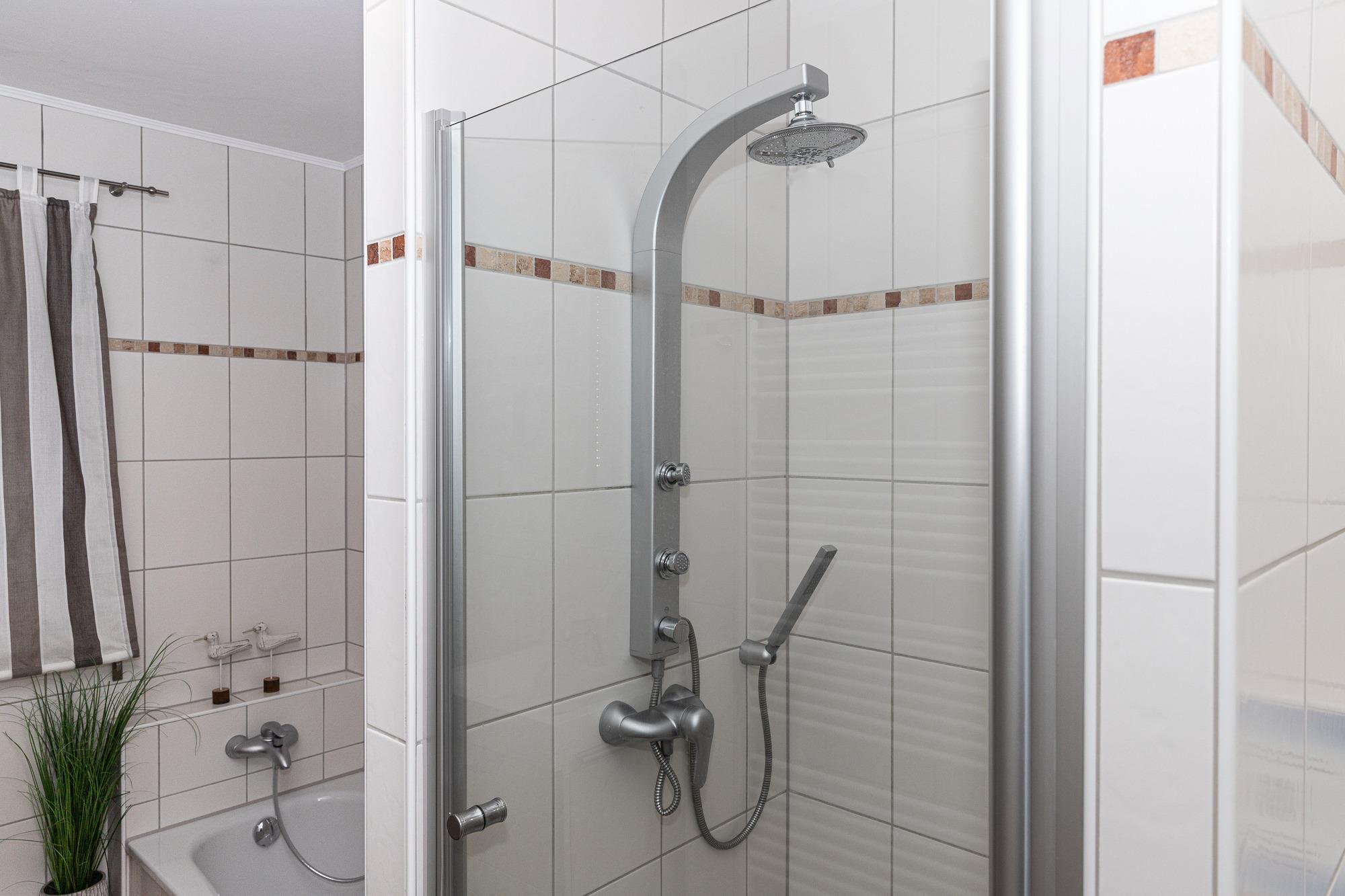 Das helle Badezimmer verfügt über Dusche, Badewanne, WC und Waschmaschine.