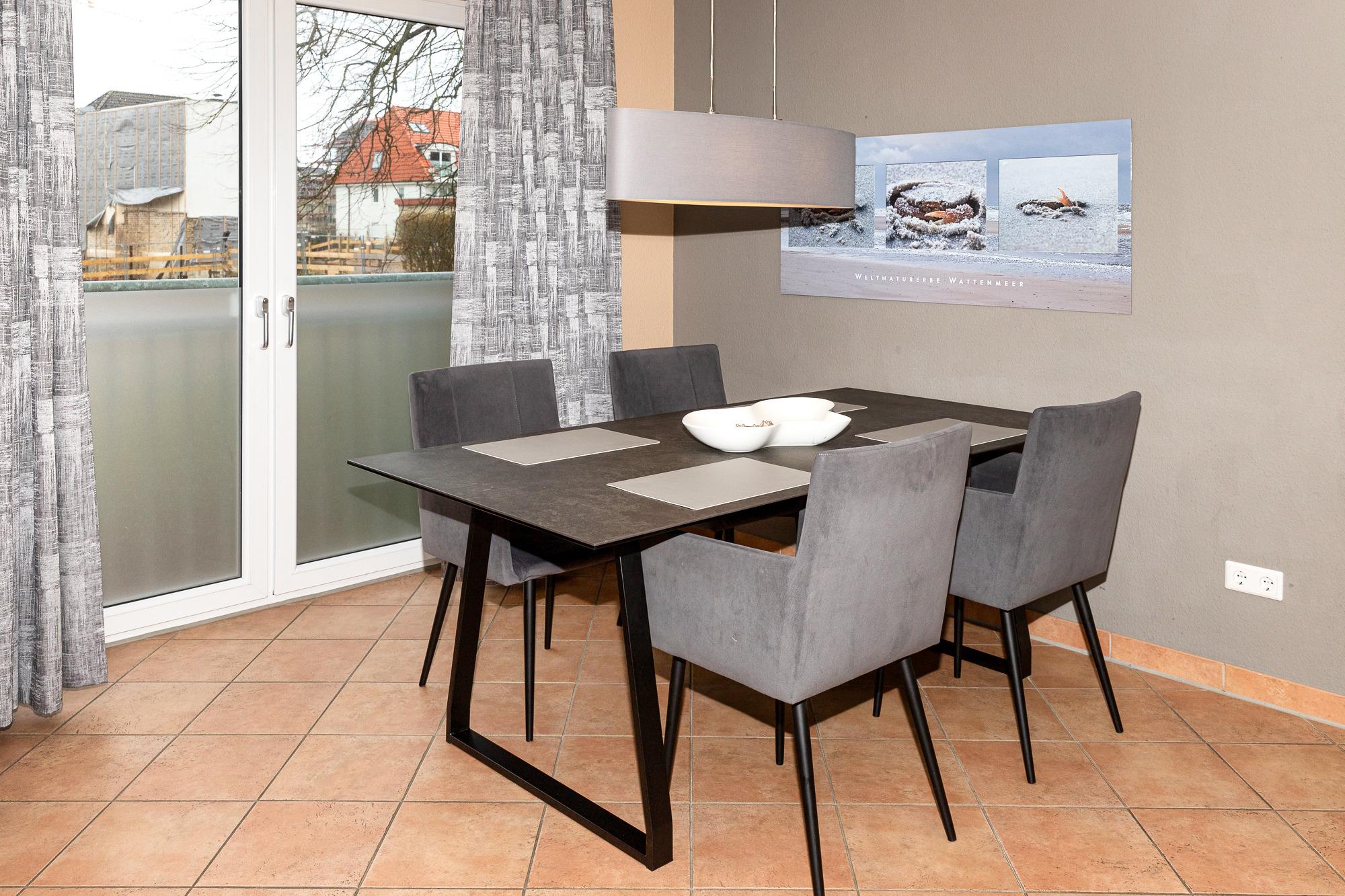 Der lichtdurchflutete Wohn- und Essbereich mit Fußbodenheizung, großem Esstisch und gemütlicher Sitzgruppe lädt zum Verweilen ein. Vom Wohnraum gelangen Sie auf den Balkon mit Seesicht und Balkonmöbeln.