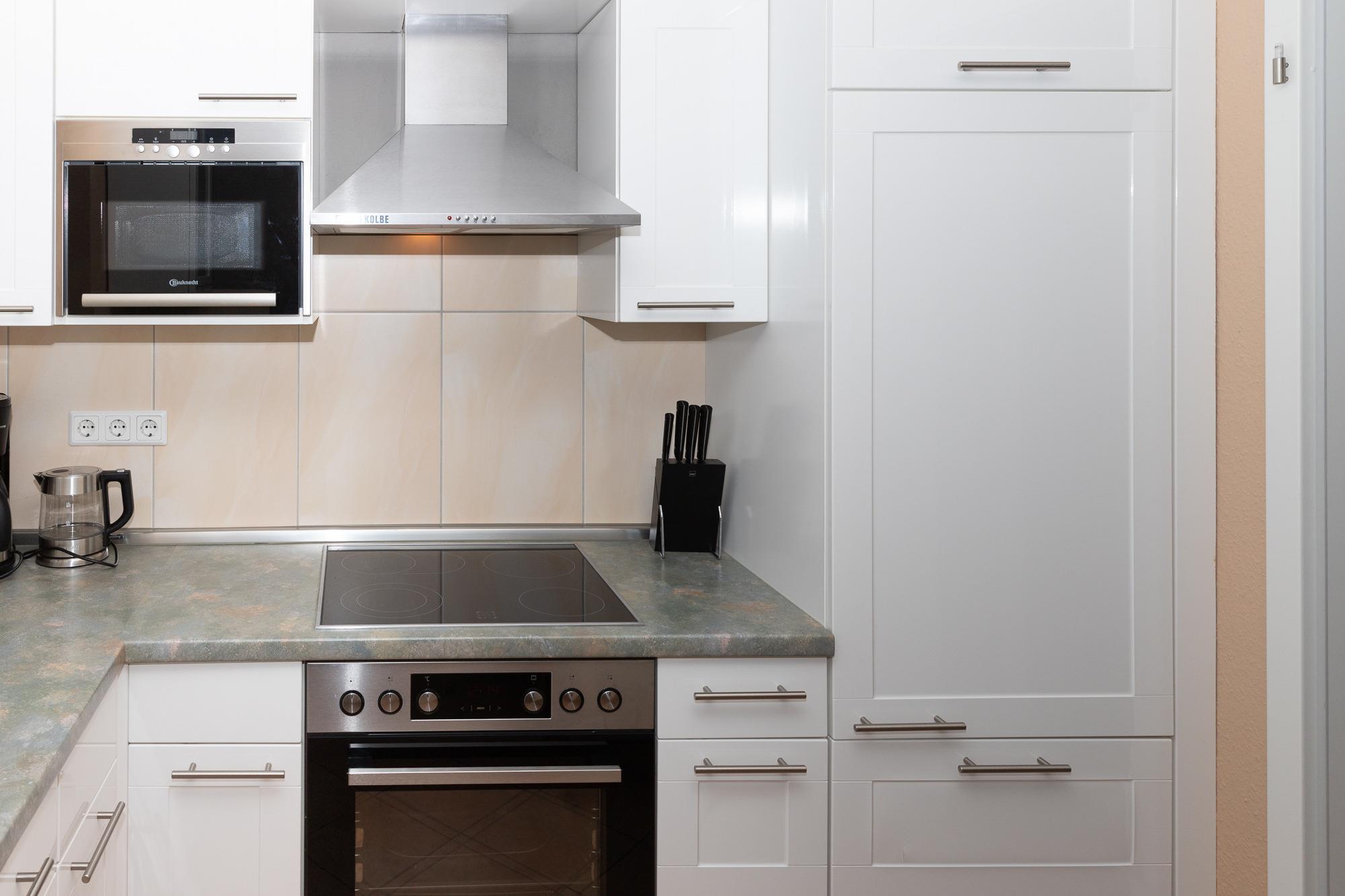 Die separate Küche ist voll ausgestattet – mit Geschirrspüler, Backofen, Kaffeemaschine, Toaster und zusätzlicher Senseo-Pad-Maschine.