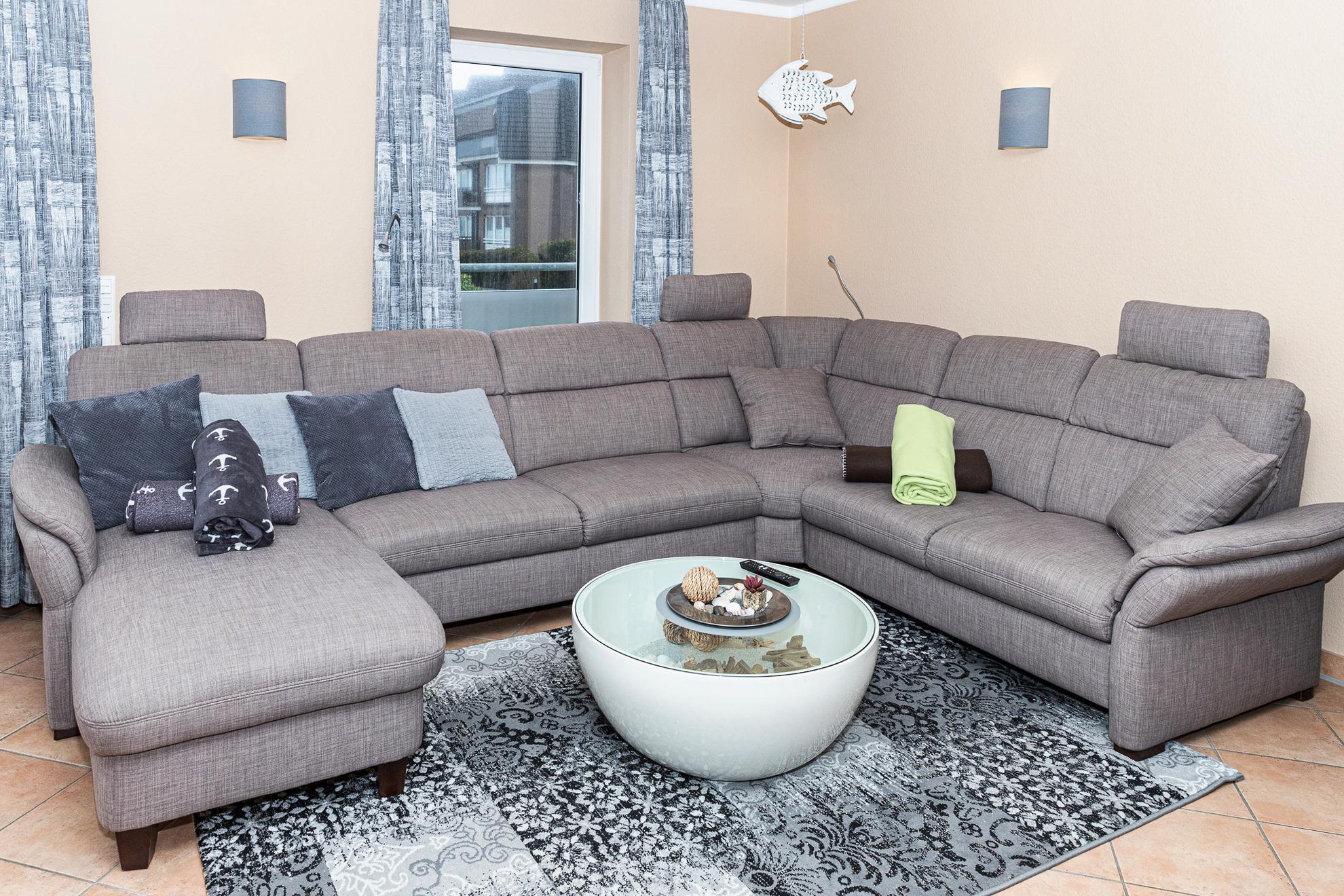 Für eine fünfte Person steht ein komfortabler Schlafplatz auf dem großen Sofa mit Auszug und Topper bereit.