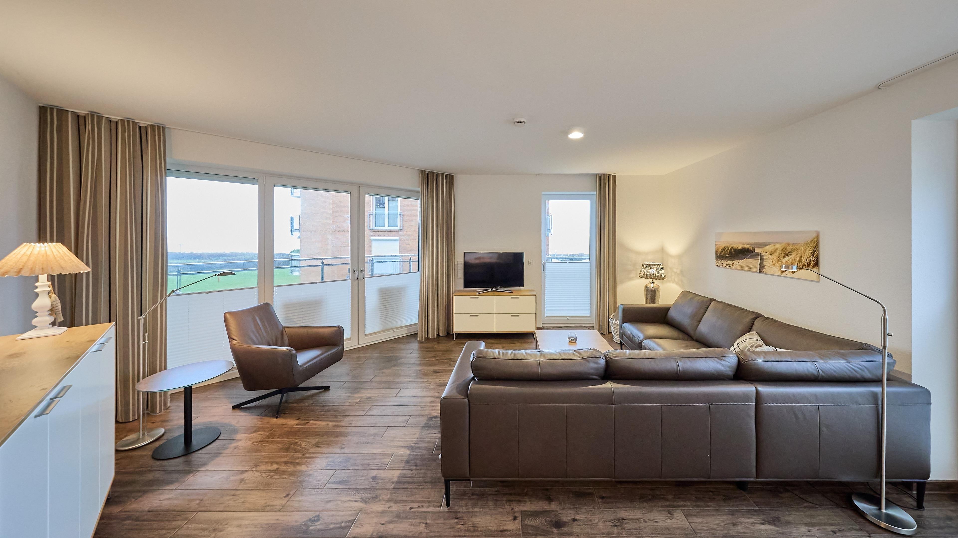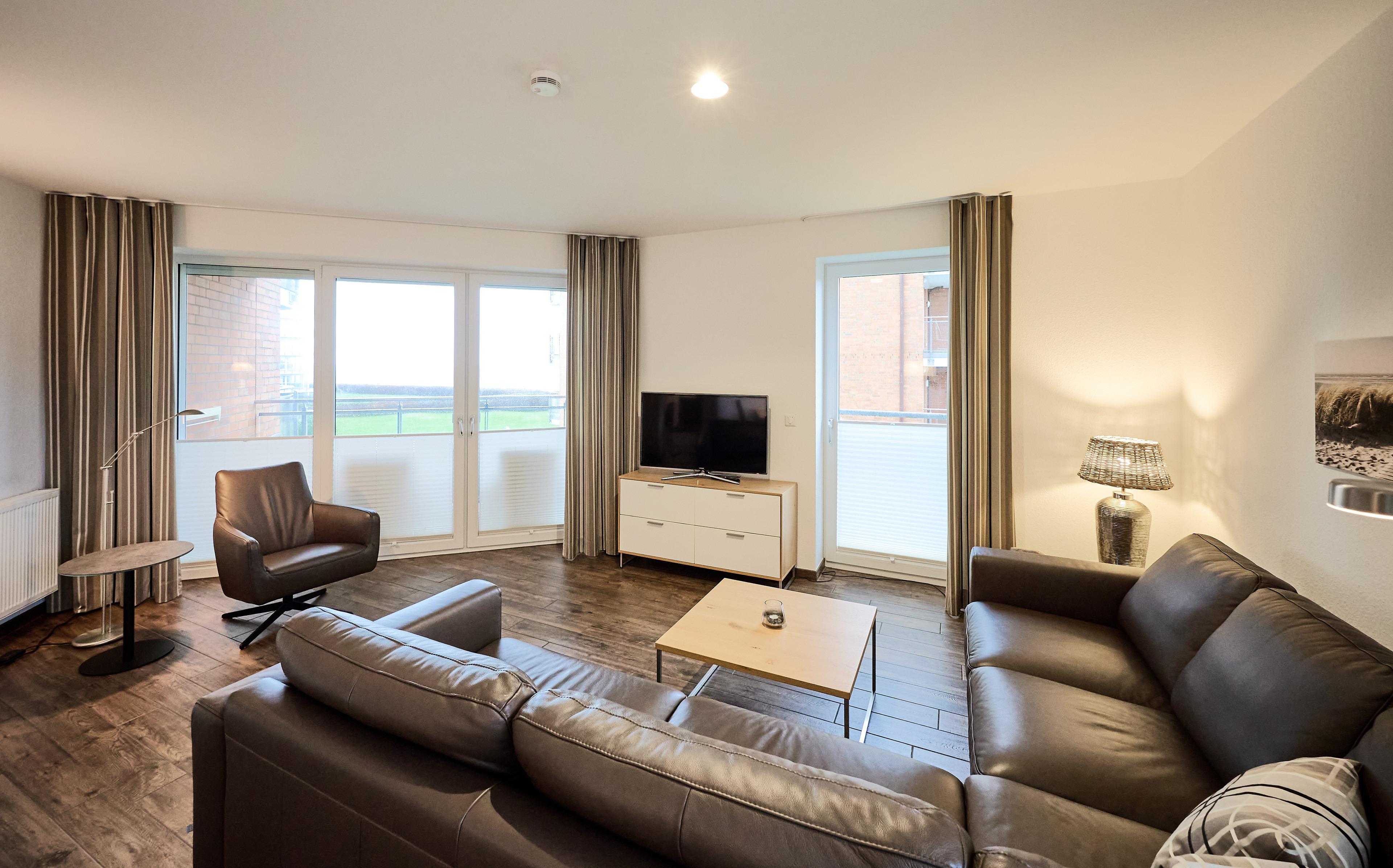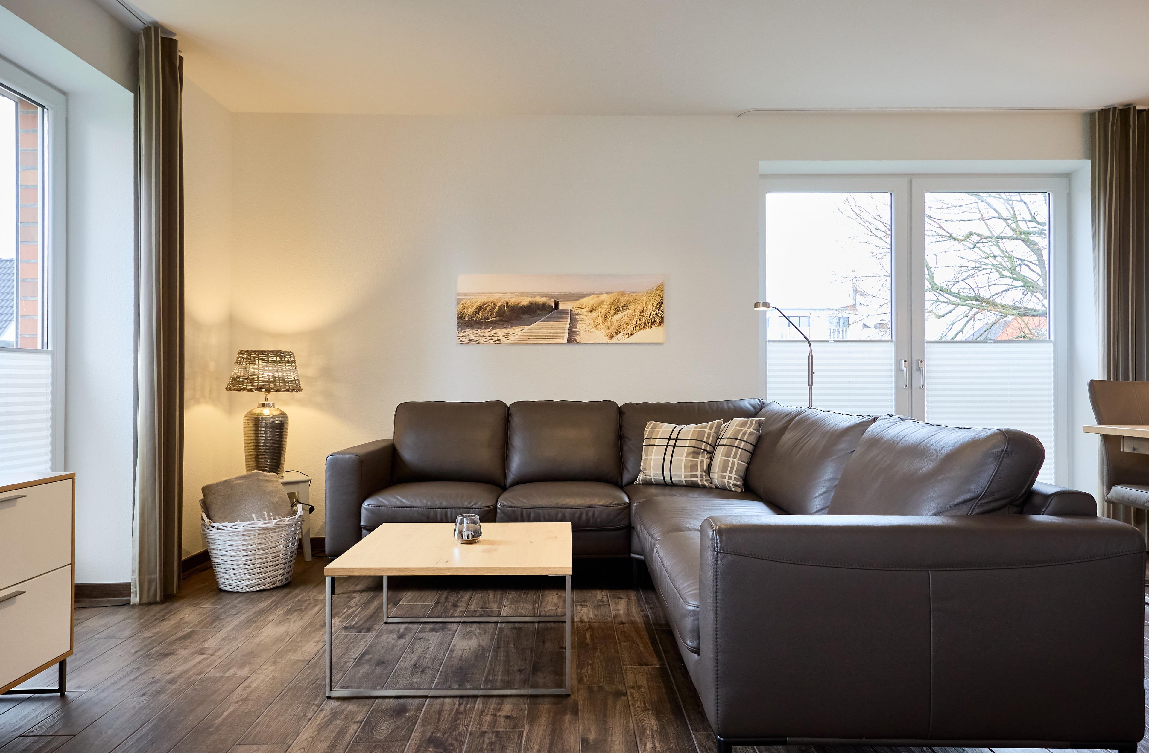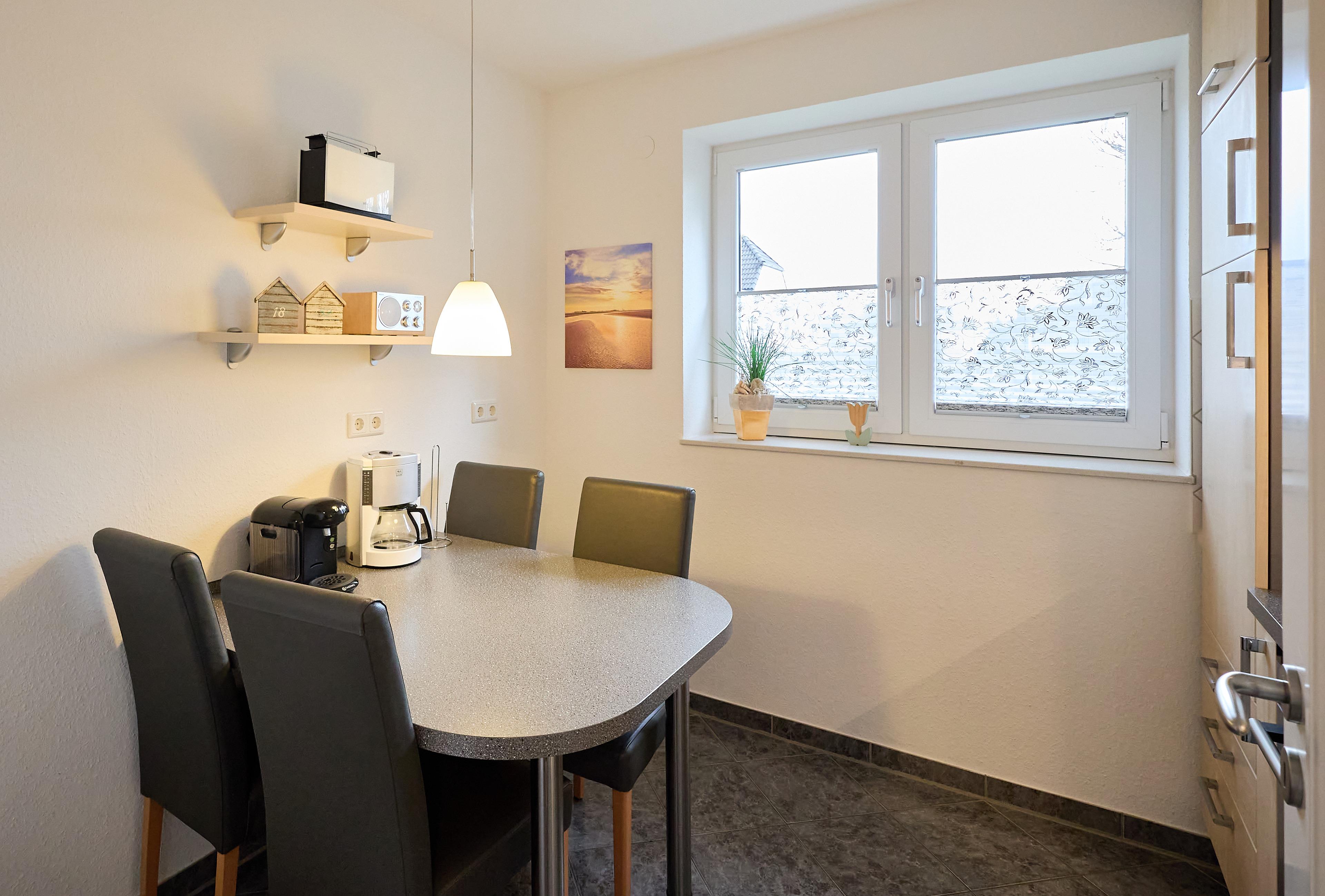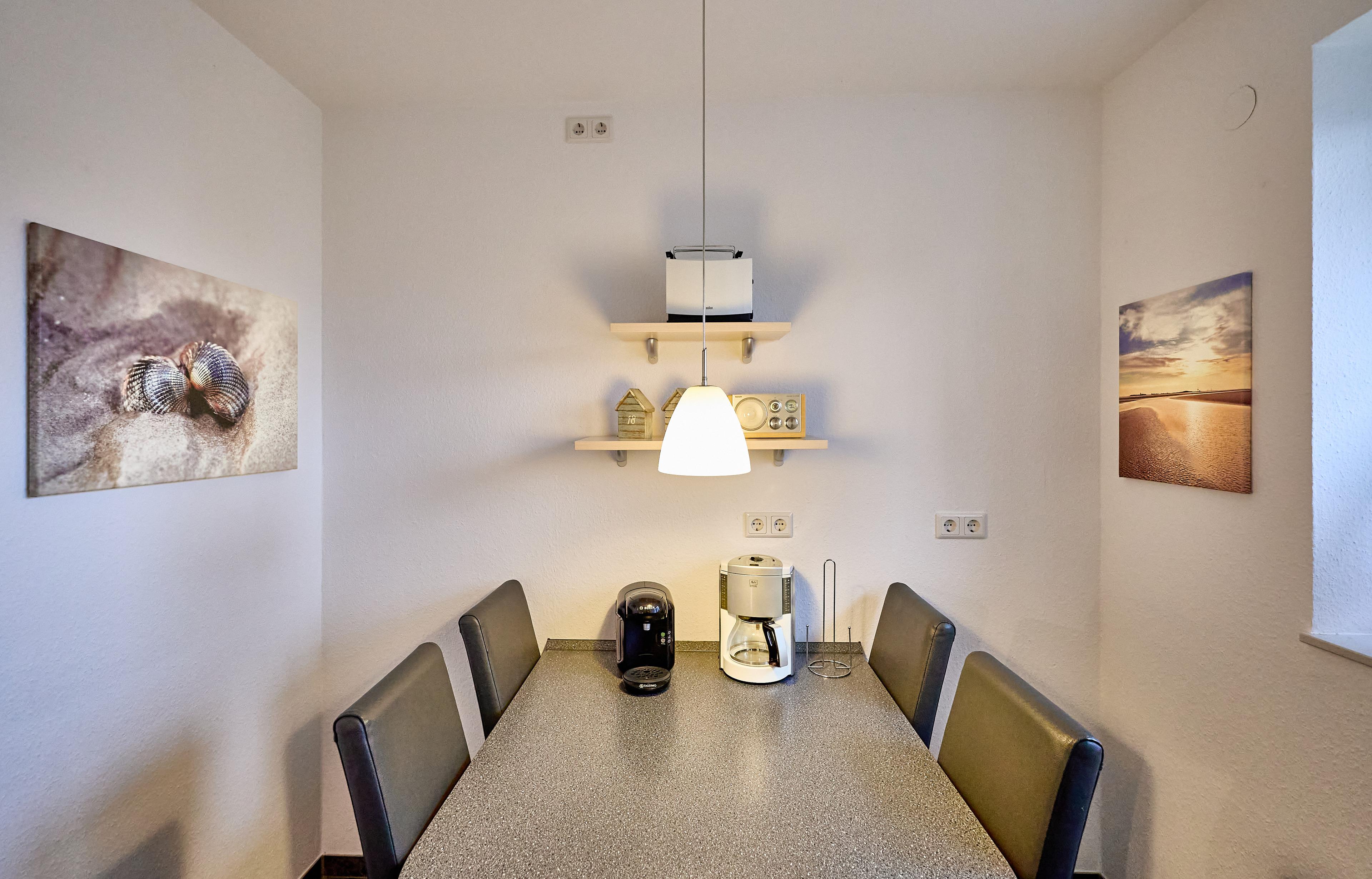 Angrenzend an die Küche lädt der helle Wohn- und Essbereich mit seinem Blick auf die Nordsee zum Verweilen ein. Ob bei einem Filmabend mit dem Fernseher und DVD-Player oder beim entspannten Surfen über das kostenfreie WLAN – hier lässt sich der Urlaub in vollen Zügen genießen.