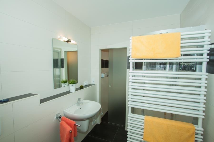 Das Badezimmer verfügt über Tageslicht und Fußbodenheizung. Durch eine Milchglastür kann es in zwei Bereiche unterteilt werden.
