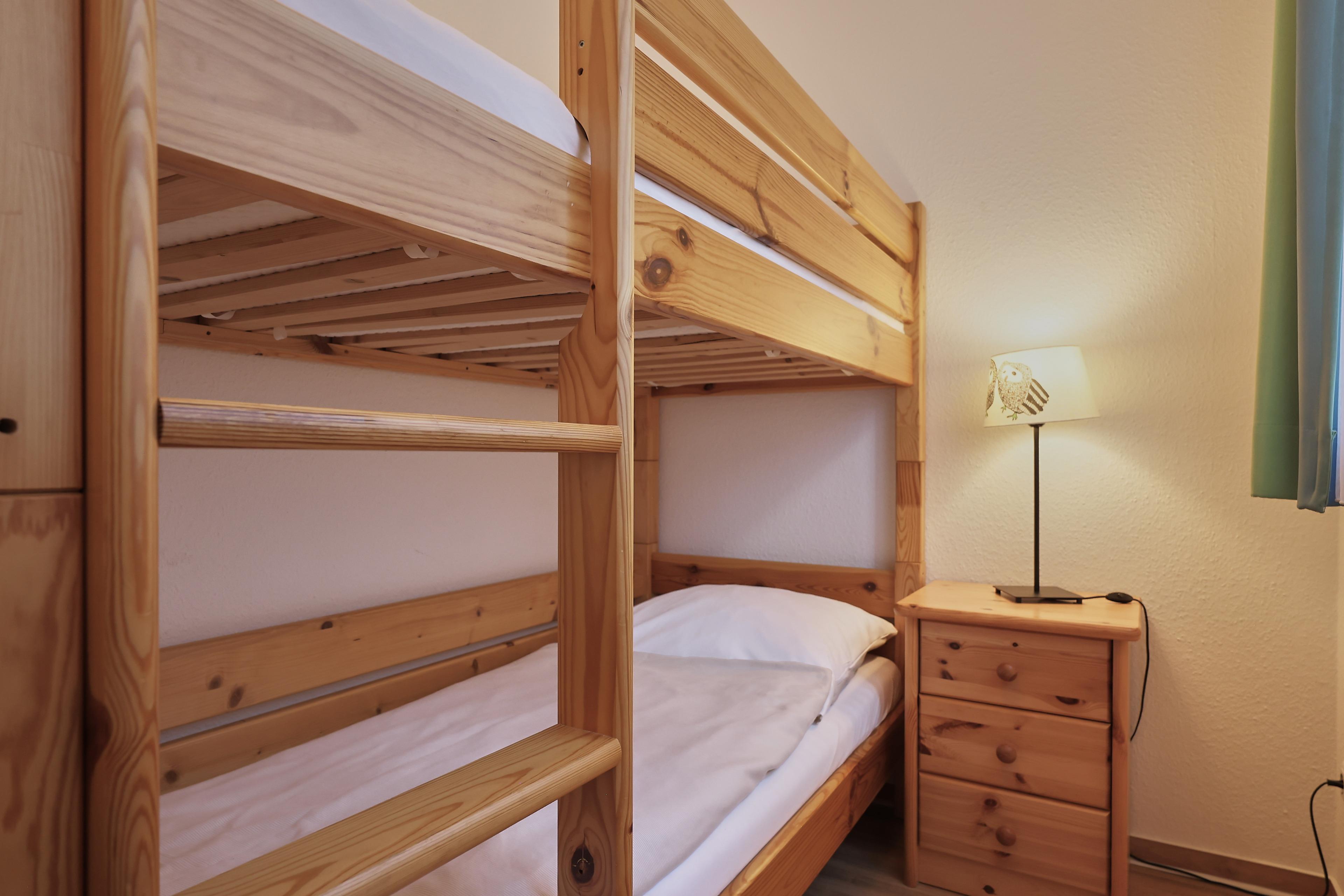 Im Erdgeschoss befindet sich ein Schlafbereich mit Etagenbett – besonders geeignet für Kinder. Das Elternschlafzimmer mit Doppelbett liegt im Untergeschoss und bietet Ruhe und Privatsphäre. In beiden Schlafbereichen stehen Ablage- und Staumöglichkeiten zur Verfügung. Zusätzlich gibt es im unteren Flur Platz für Schuhe und Garderobe.