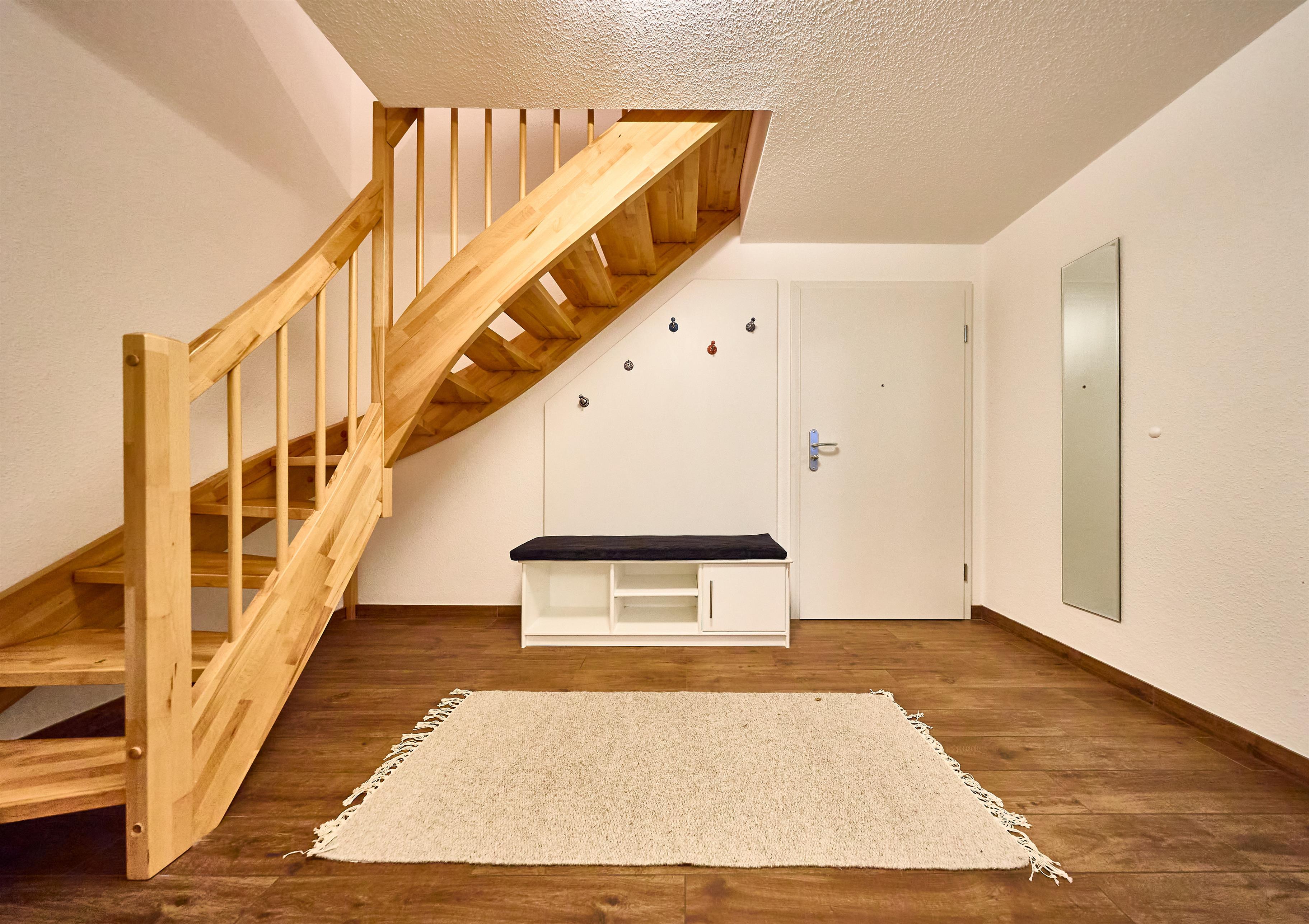Die interne Treppe ist im oberen Bereich mit einem Treppenschutzrollo gesichert. Alternativ kann das Untergeschoss bequem über den hauseigenen Fahrstuhl erreicht werden. Beide Ebenen verfügen über jeweils eine gesicherte Wohnungseingangstür.