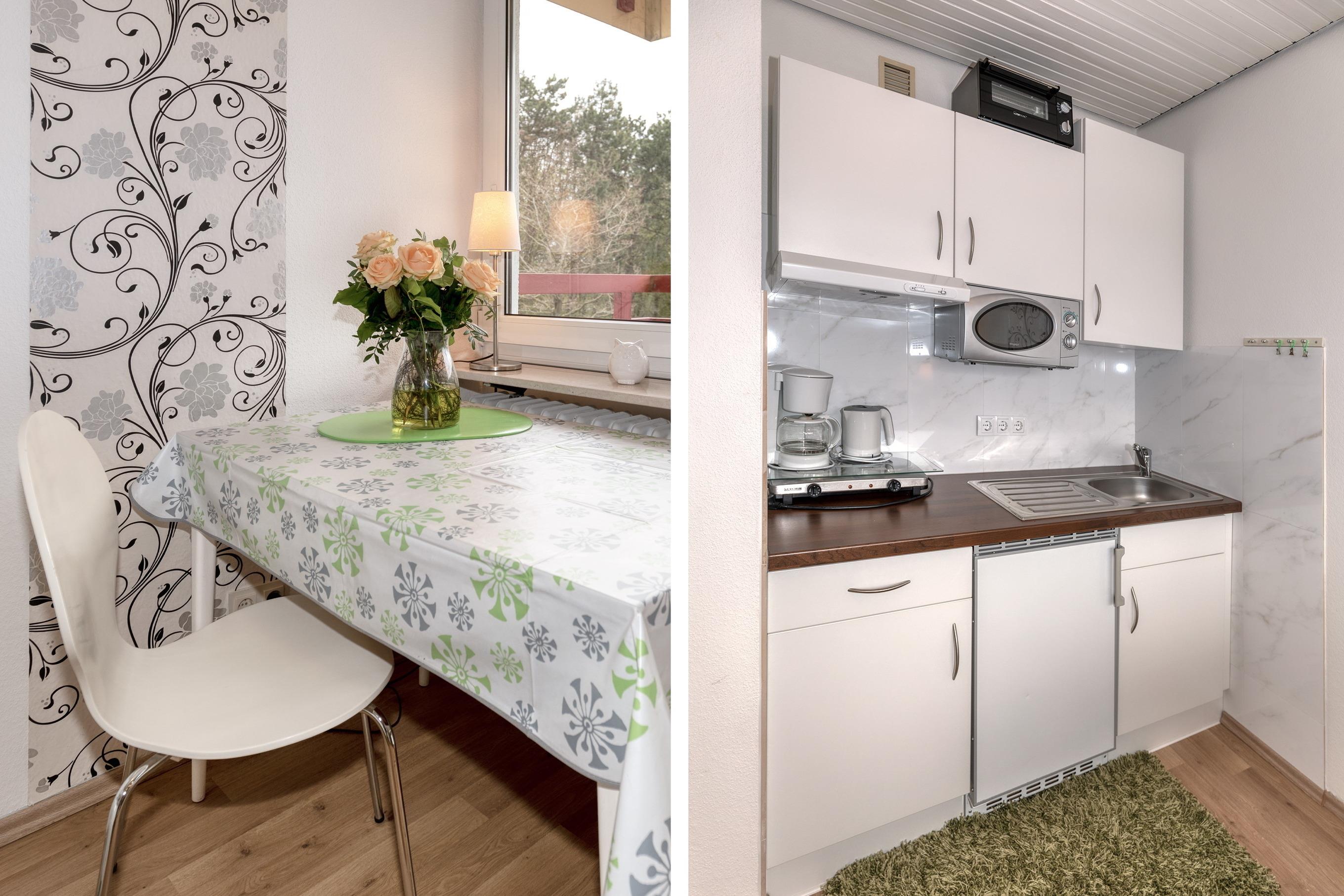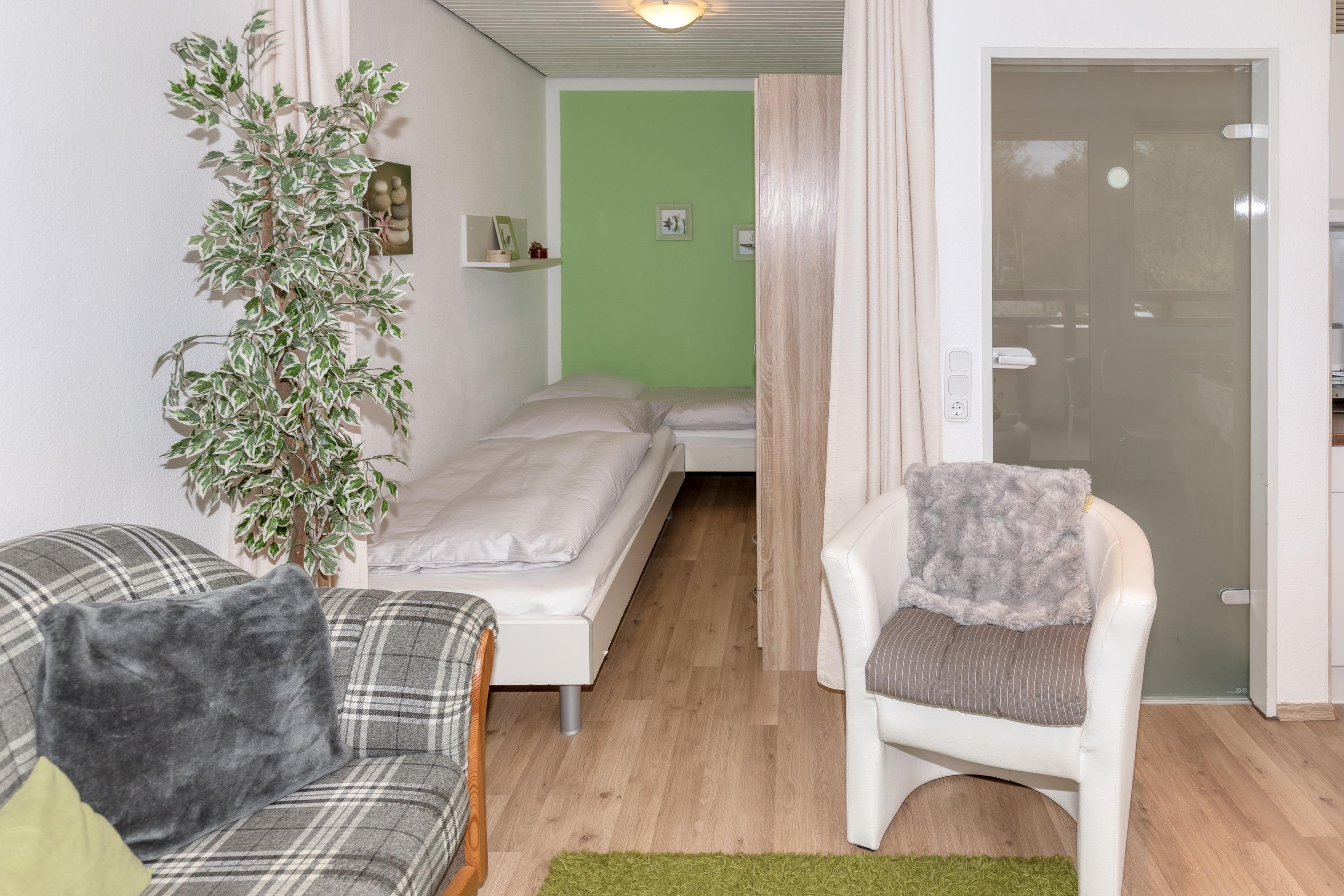 Das Appartement besteht aus einem Wohnbereich und eine Schlafnische mit zwei Einzelbetten für 2 Personen, eine voll ausgestattete integrierter Küche, einem Badezimmer mit Dusche sowie WC.