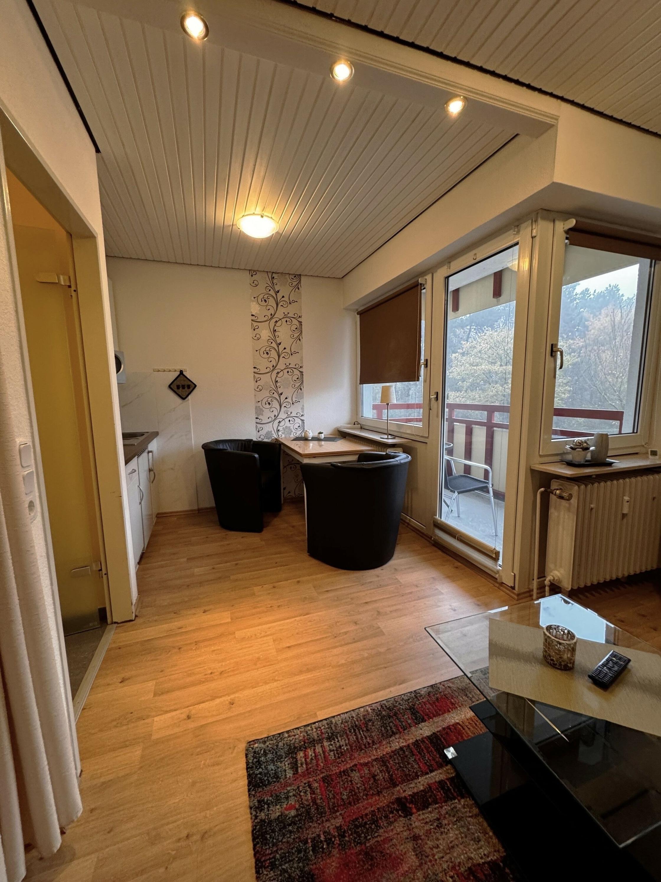 Das Appartement 22 ist ein 1-Raum-Appartement im 2. Obergeschoss für bis zu 2 Personen mit 26 qm. Der möblierte Ostbalkon bietet morgens Sonne und nachmittags Schatten.