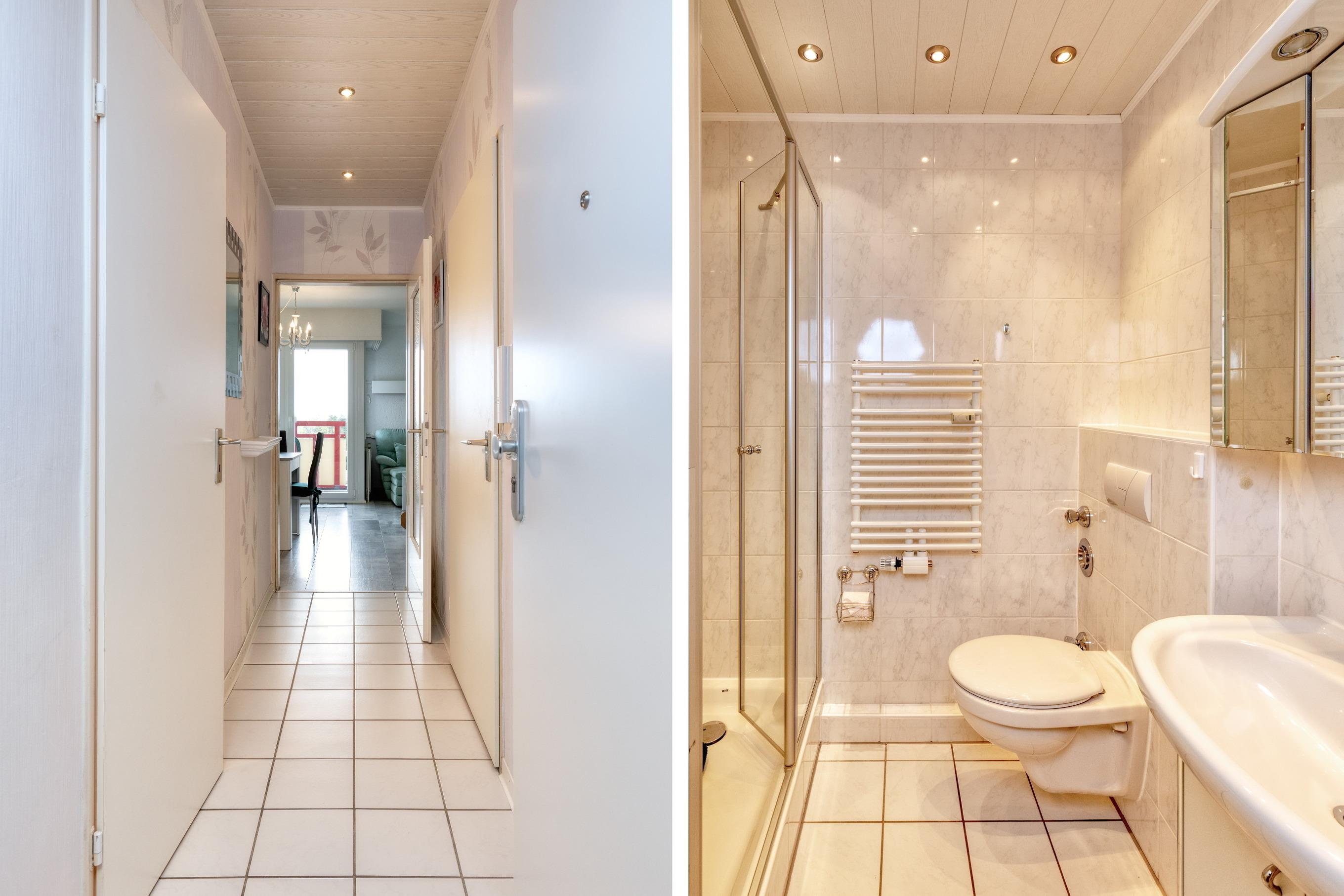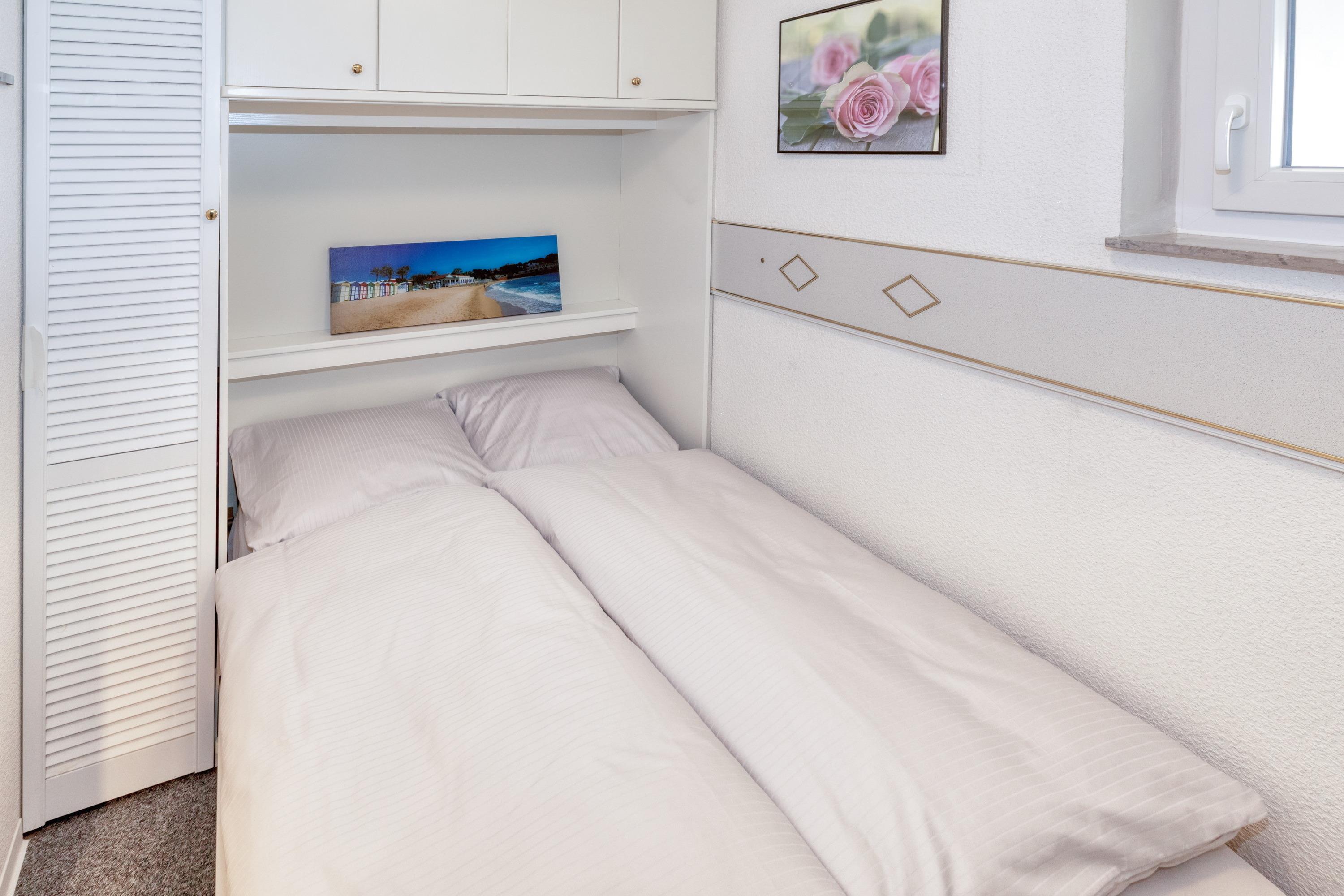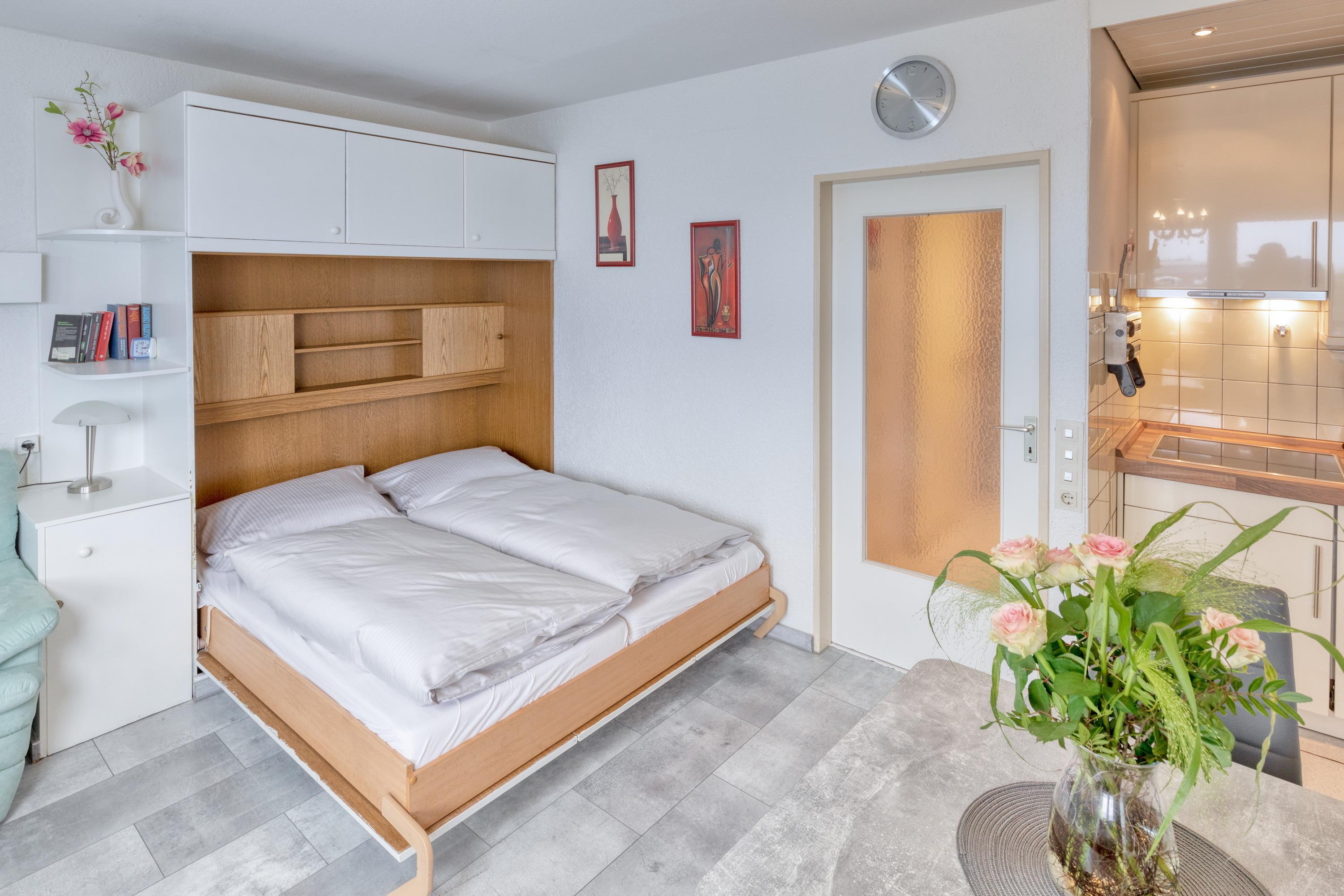 Das Apartment besteht aus einem Schlafzimmer mit Schrankbett, einem Wohnbereich mit Schrankbett, eine voll ausgestattete integrierter Küche, einem Badezimmer mit Dusche sowie WC.