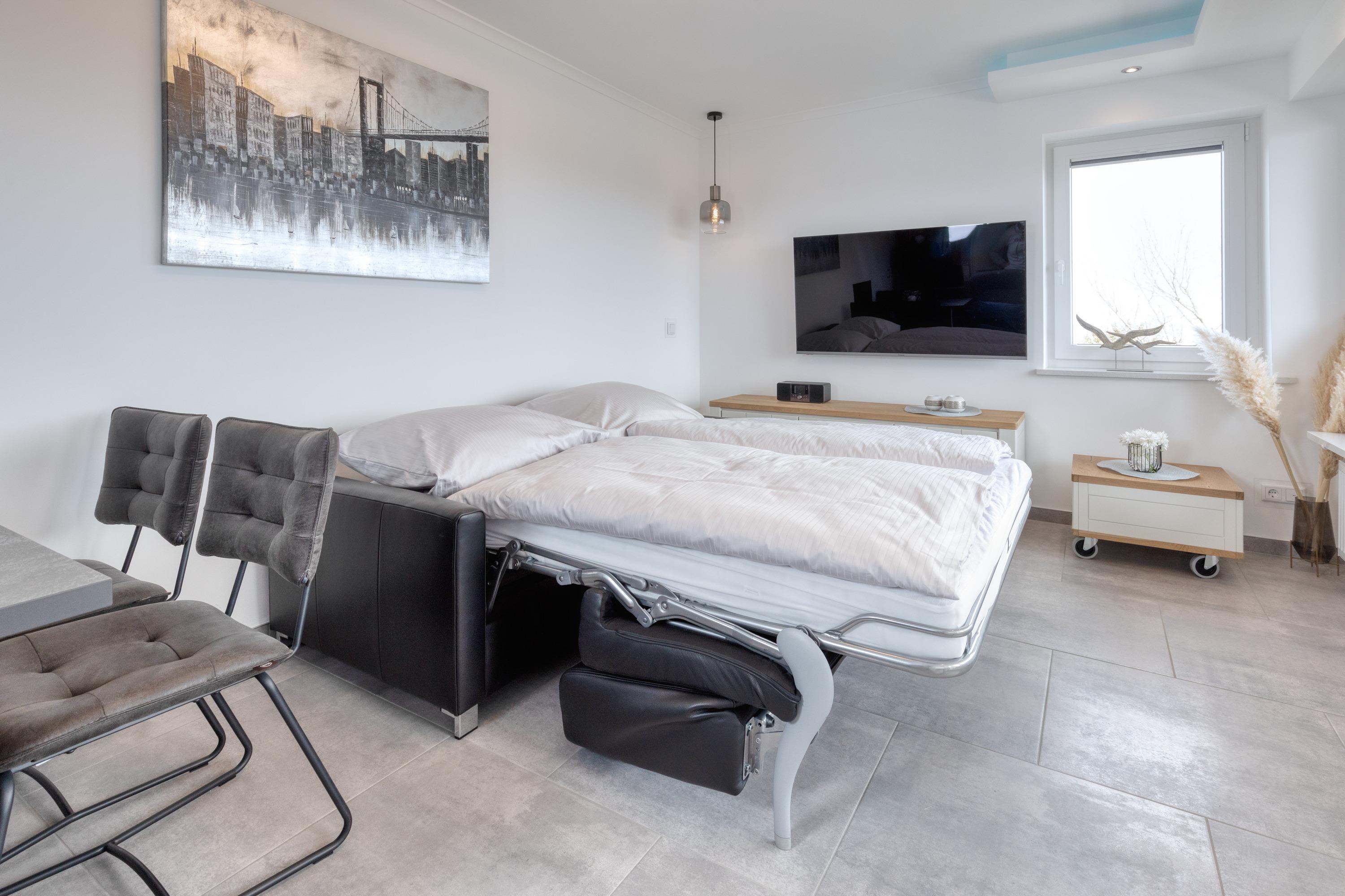 Das Appartement besteht aus einem Schlafzimmer mit Doppelbett, einem Wohnbereich mit ausziehbarem Schlafsofa, eine voll ausgestattete integrierter Küche, einem Badezimmer mit Dusche sowie WC.