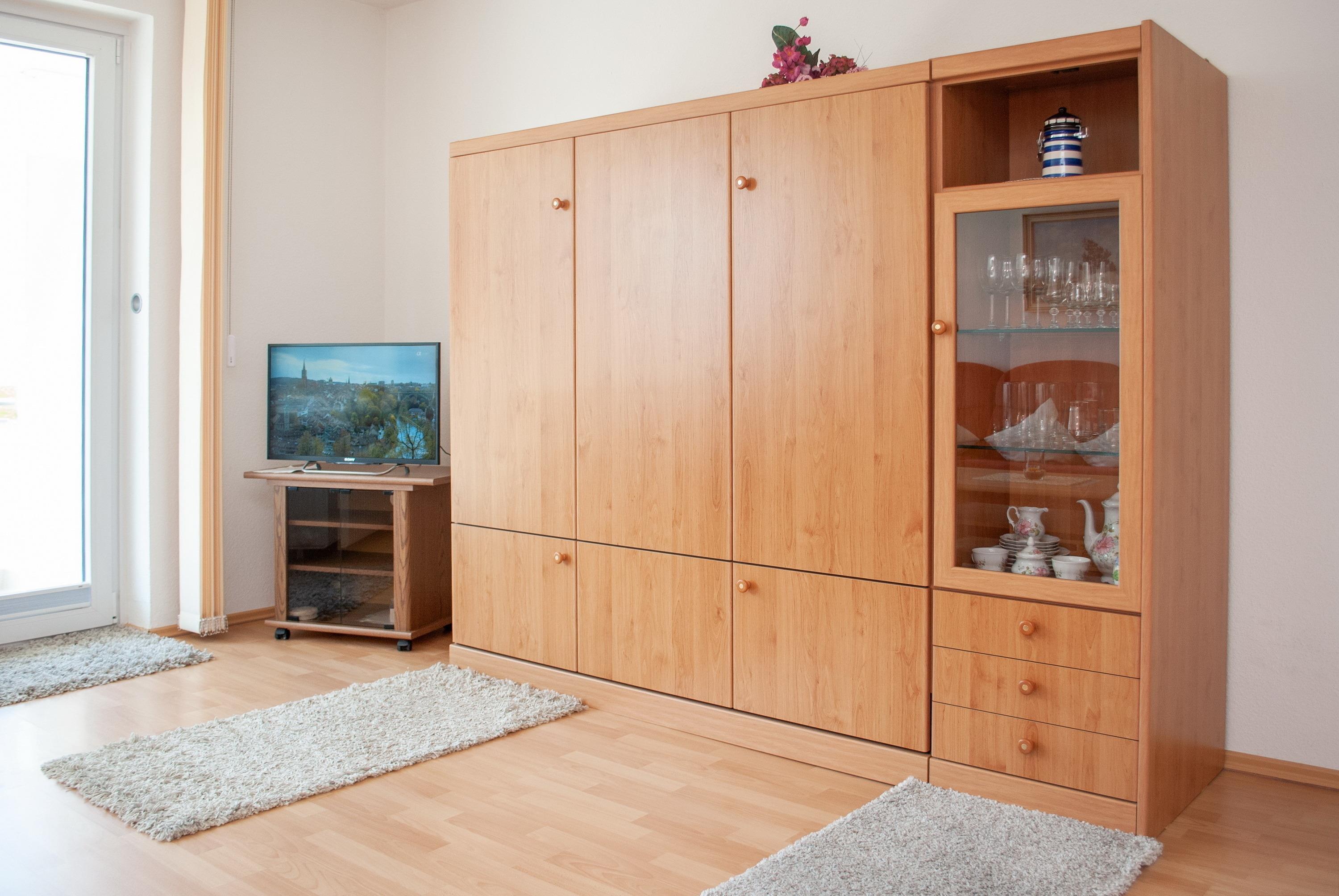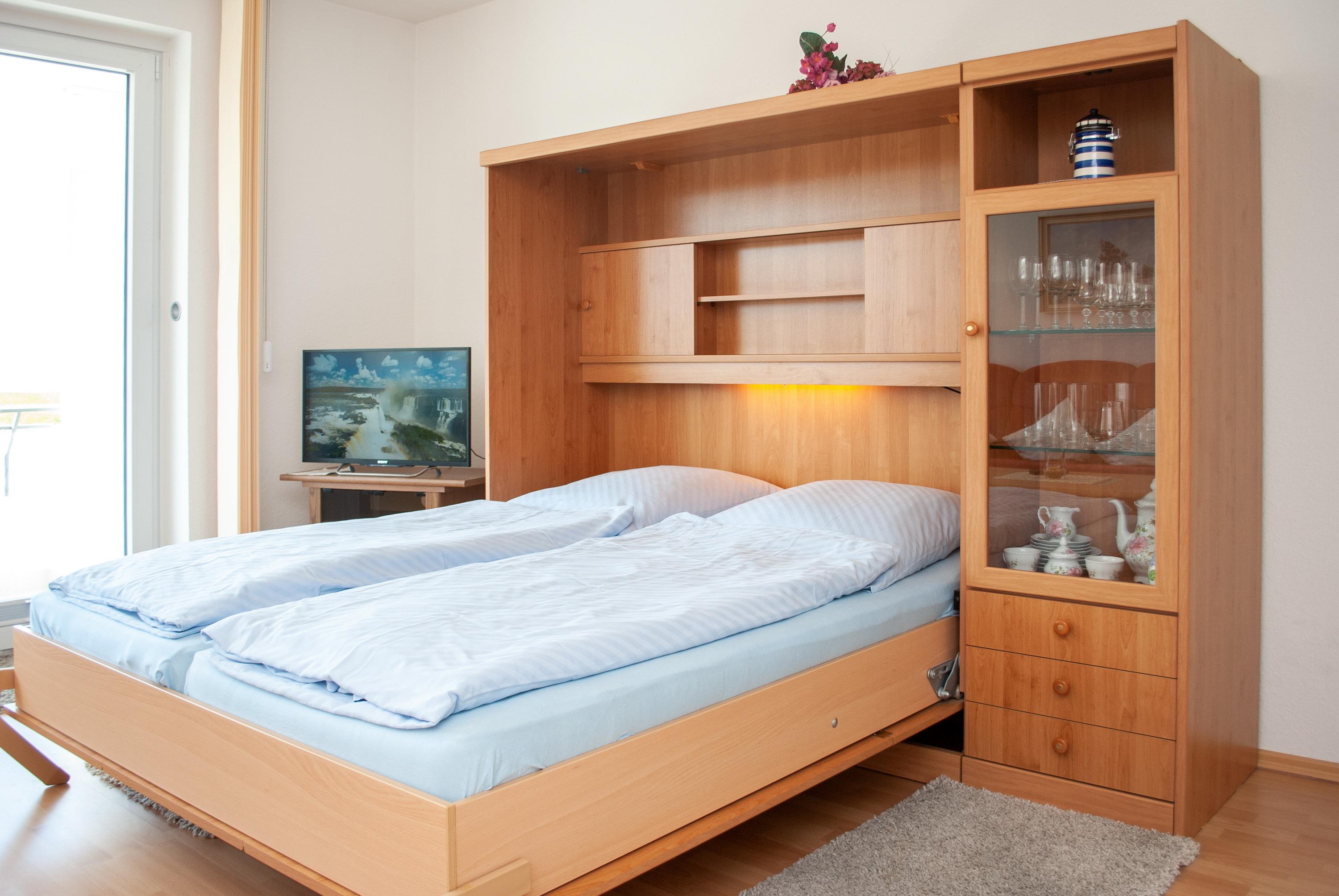 Das Apartment besteht aus einem Wohnbereich mit Schrankbett für 2 Personen und einem Badezimmer mit Dusche sowie WC. Die Ferienwohnung beinhaltet eine gut ausgestattete offene Küche.