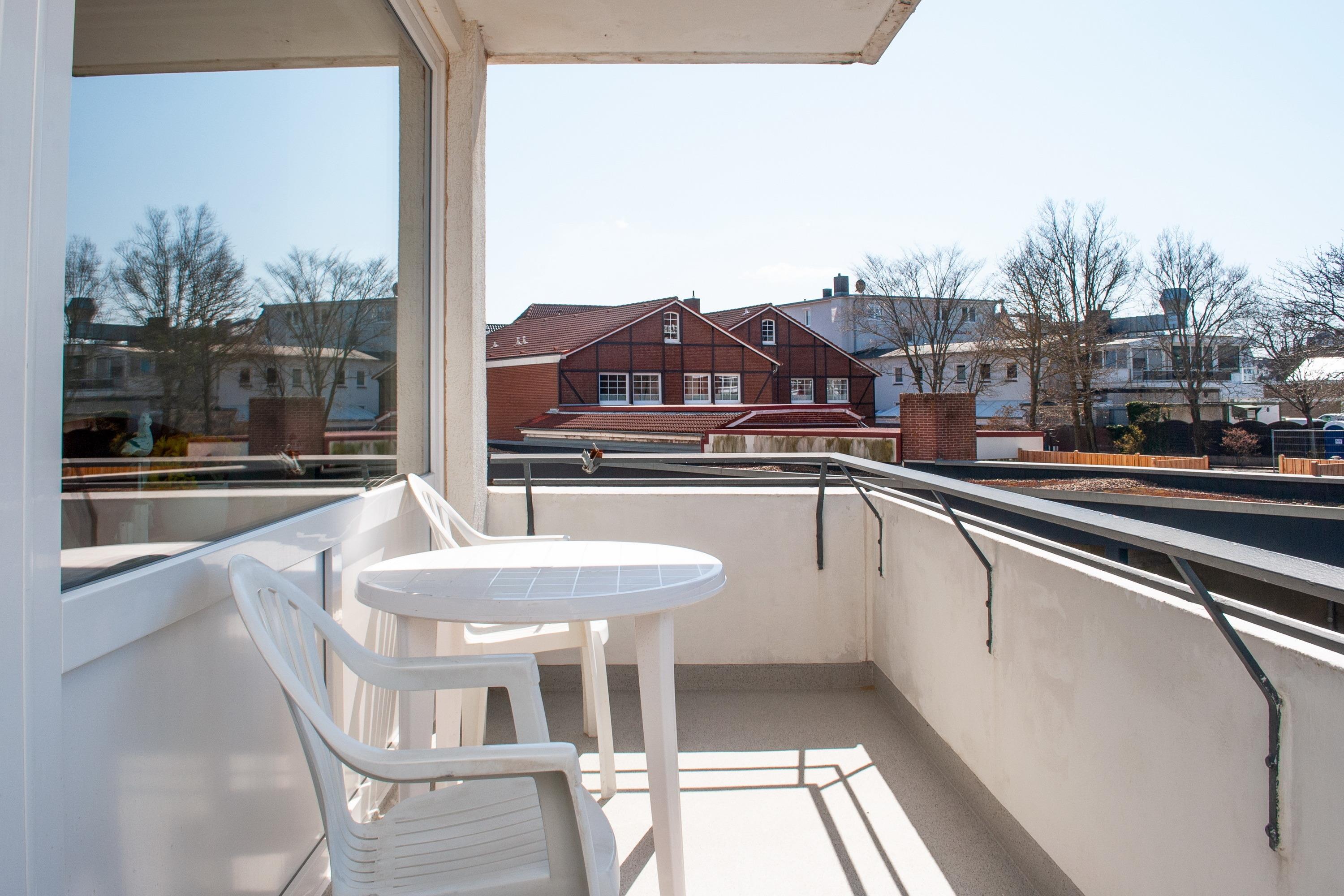 Das Apartment 105 ist ein 1-Raum-Apartment im 1. Obergeschoss für bis zu 2 Personen mit 40 qm. Der Westbalkon mit Meerblick bietet Ihnen vormittags Schatten und nachmittags Sonne .