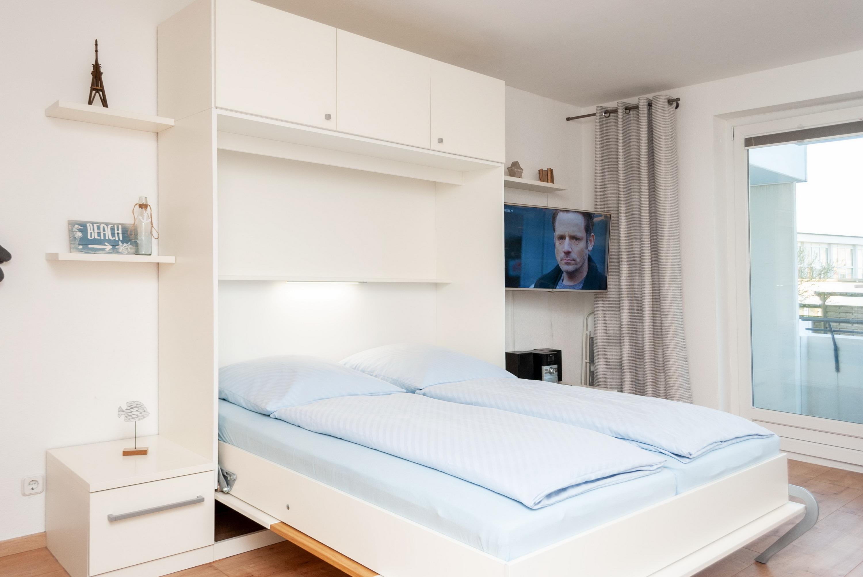 Das Apartment 111 ist ein 1-Raum-Apartment im 1. Obergeschoss für bis zu 4 Personen mit 40 qm. Der Ostbalkon mit Meerblick bietet Ihnen vormittags Sonne und nachmittags Schatten.