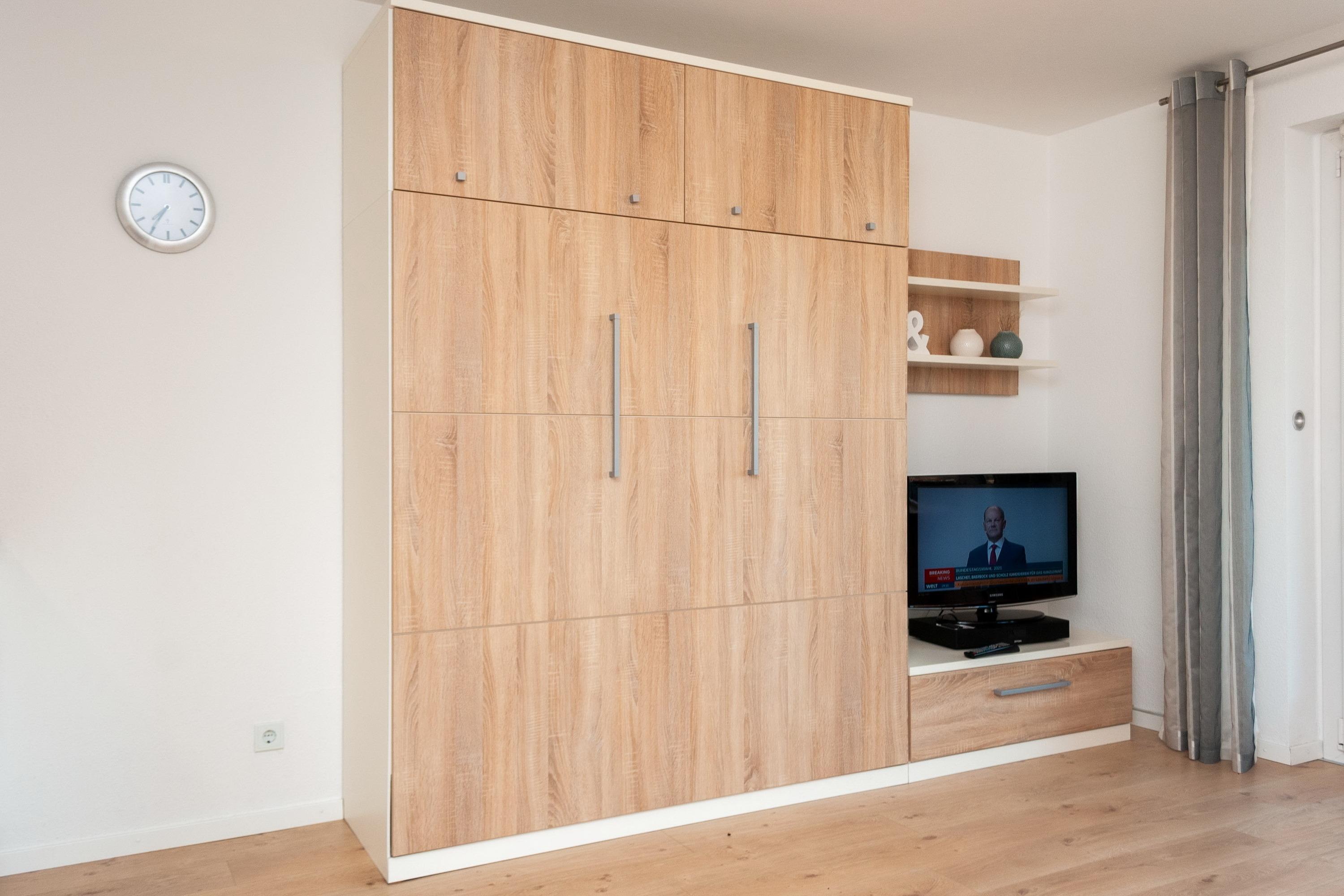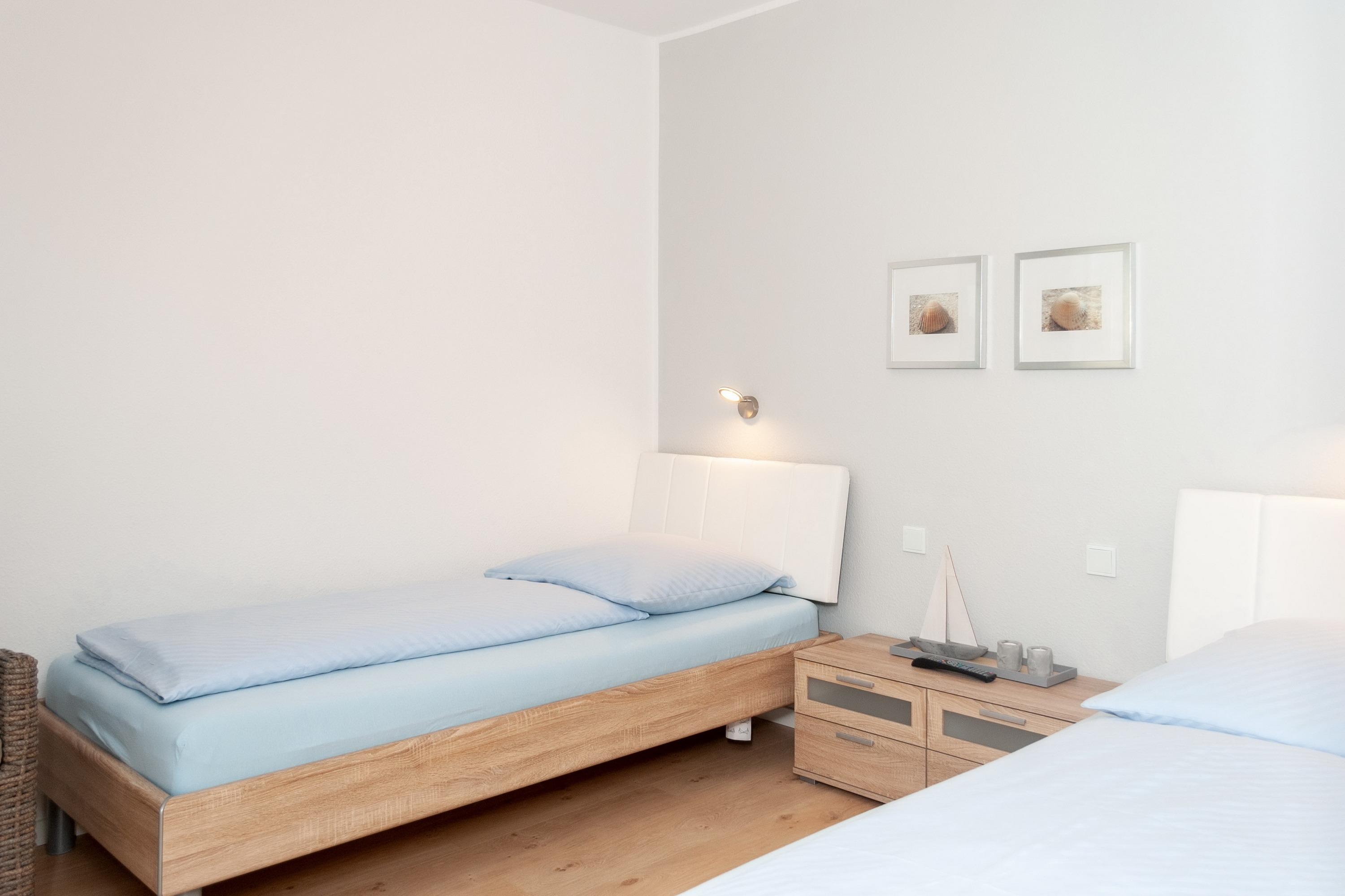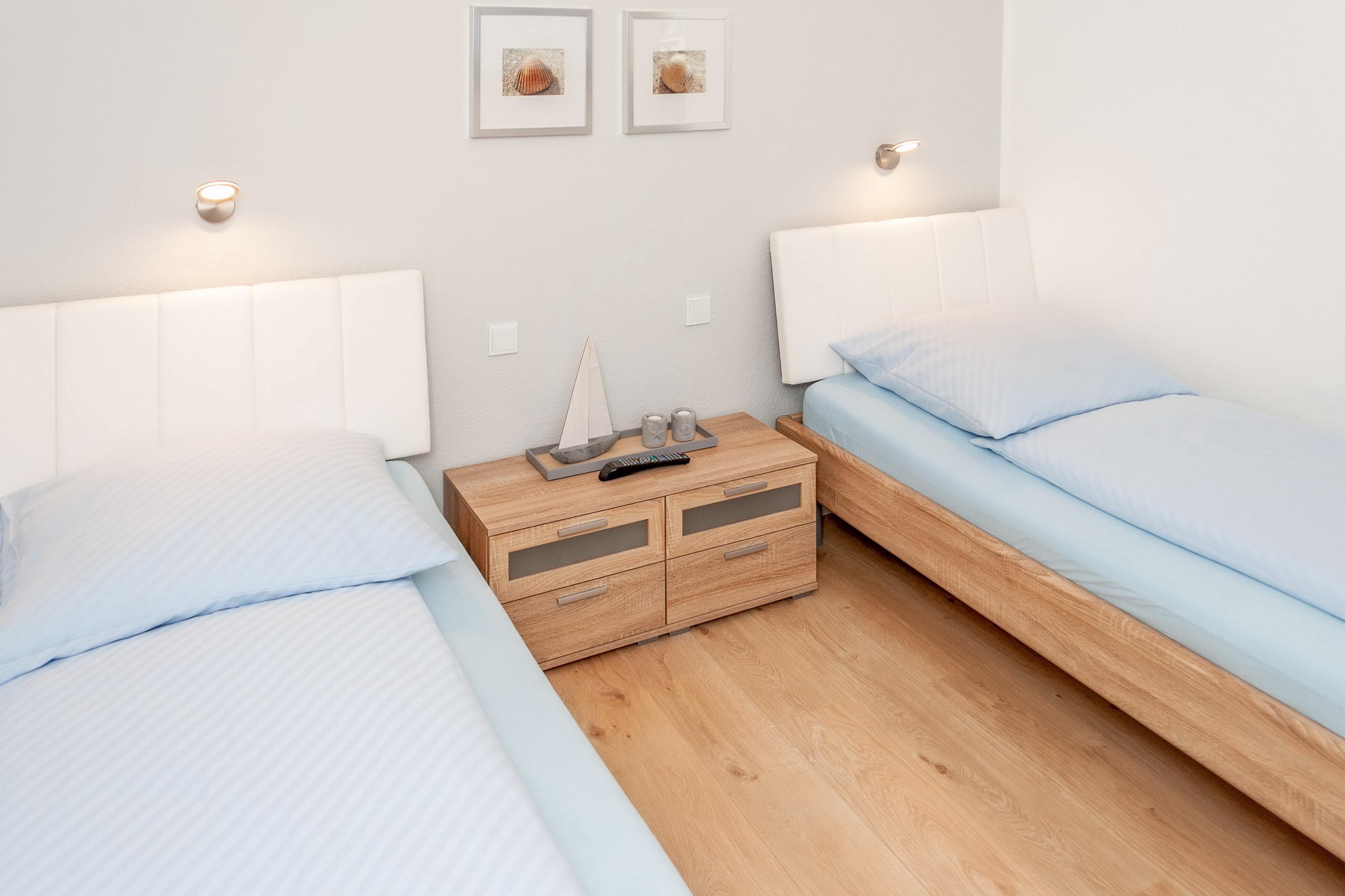 Das Apartment besteht aus einem Schlafzimmer mit 2 Einzelbetten, einem Wohnbereich mit zusätzlichem Schrankbett für 2 Personen und einem Badezimmer mit Dusche sowie WC. Die Ferienwohnung beinhaltet eine voll ausgestattete offene Küche.
