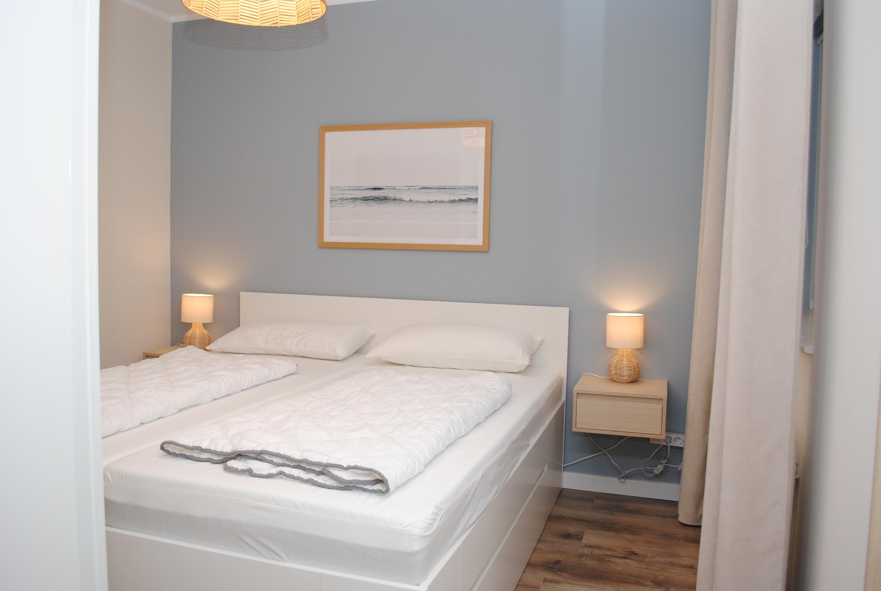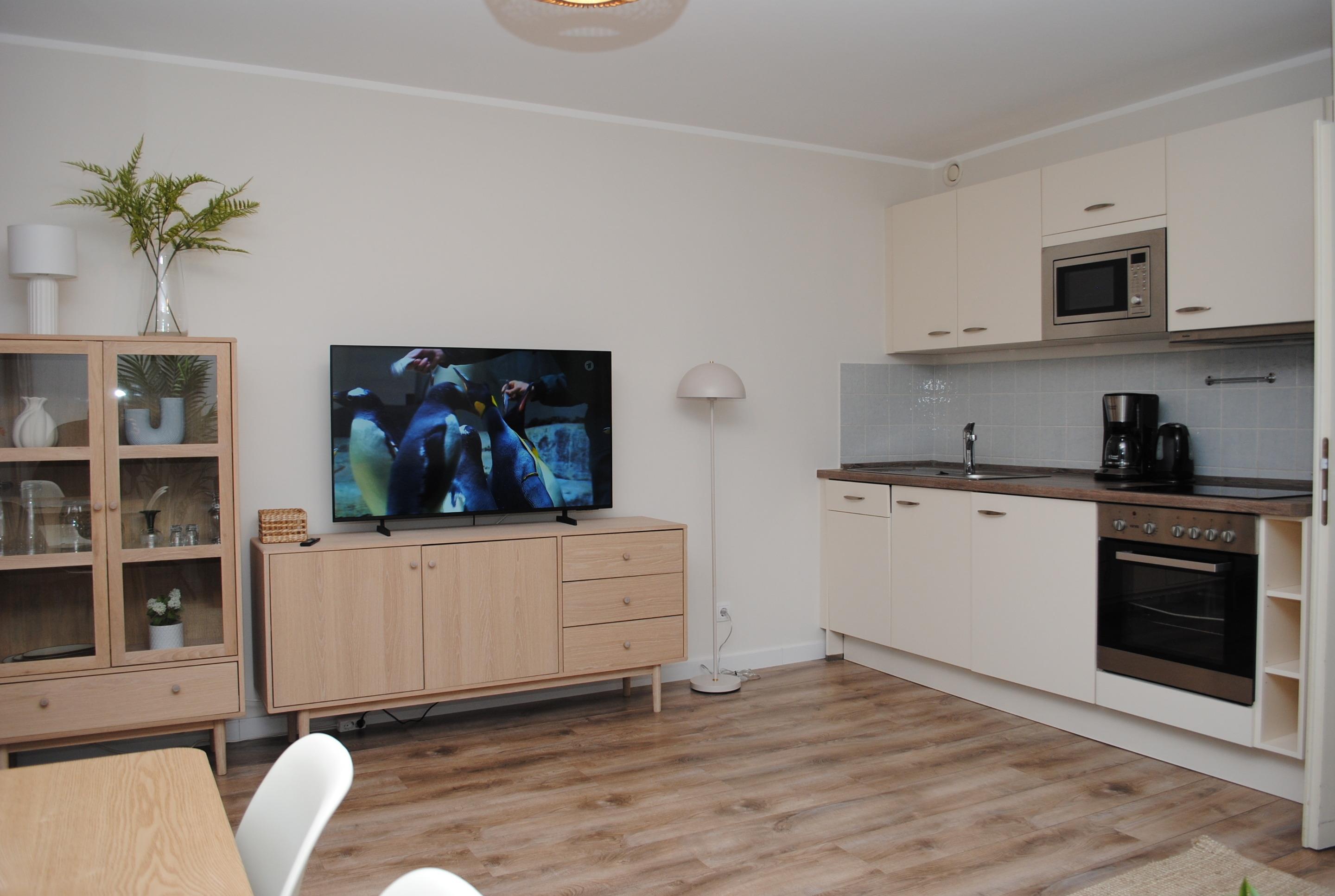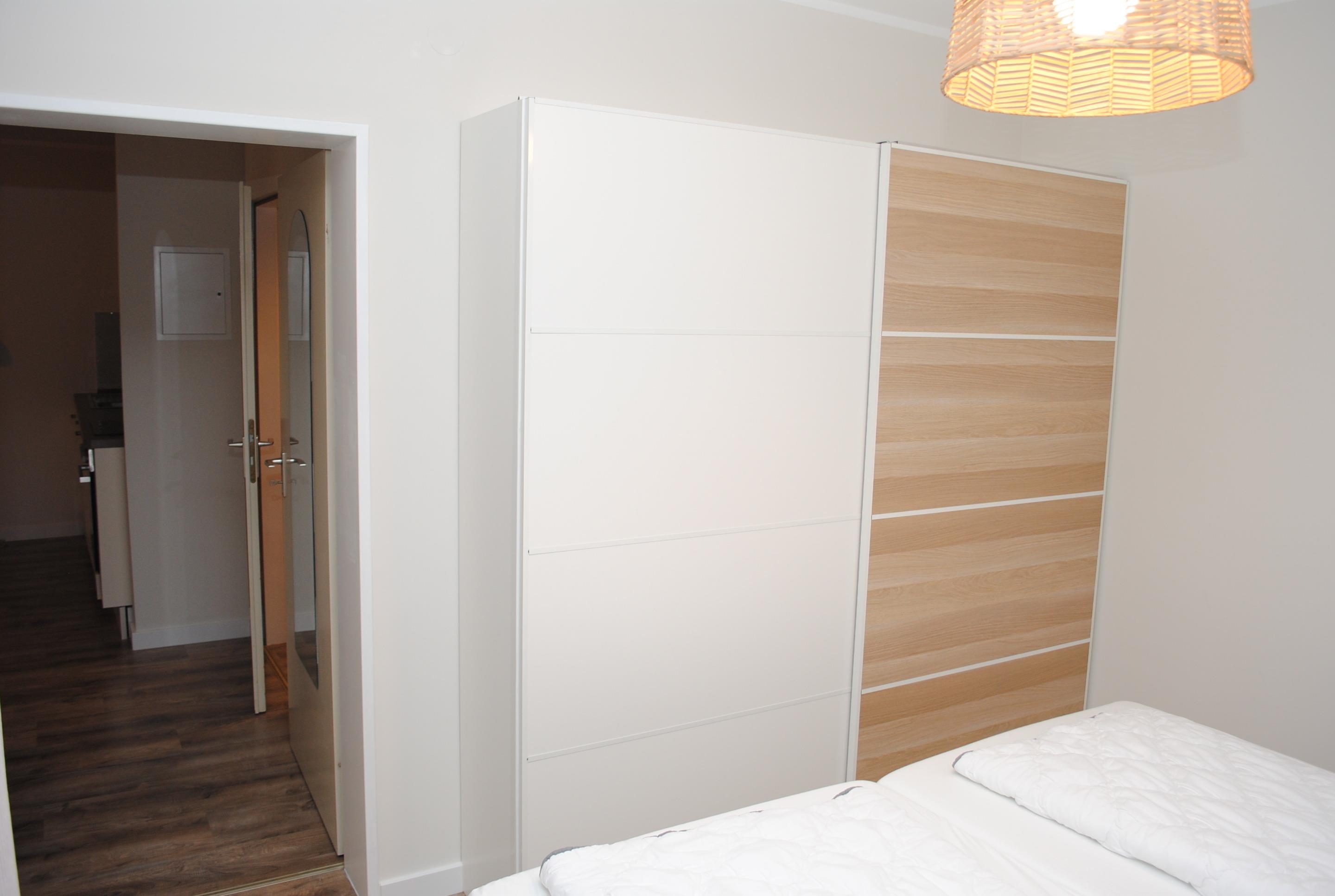 Das Apartment besteht aus einem Schlafzimmer mit 1 Doppelbett, einem Wohnbereich , einem zusätzlichem Etagenbett in einer Nische im Flur und einem Badezimmer mit Dusche sowie WC. Die Ferienwohnung beinhaltet eine voll ausgestattete offene Küche.