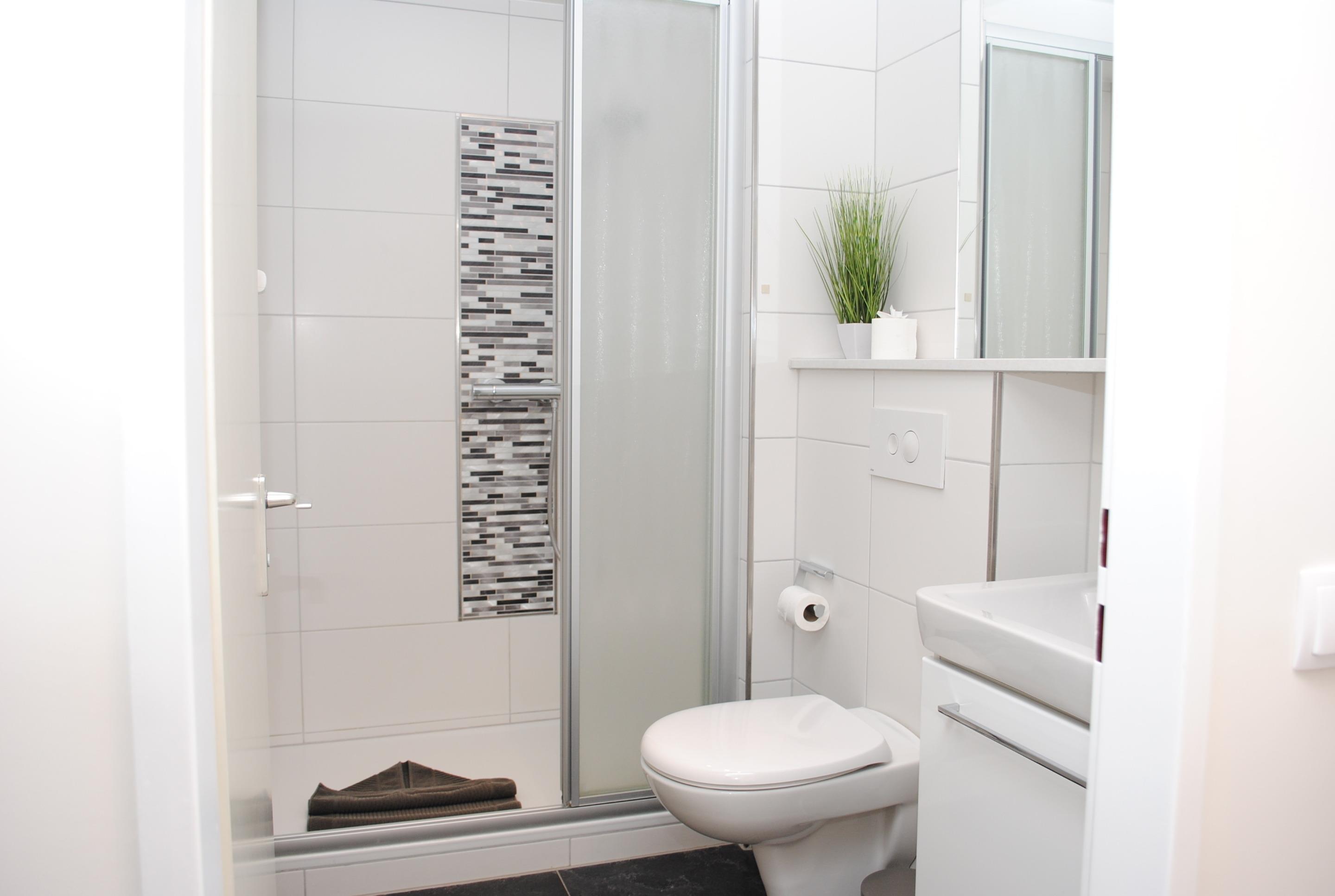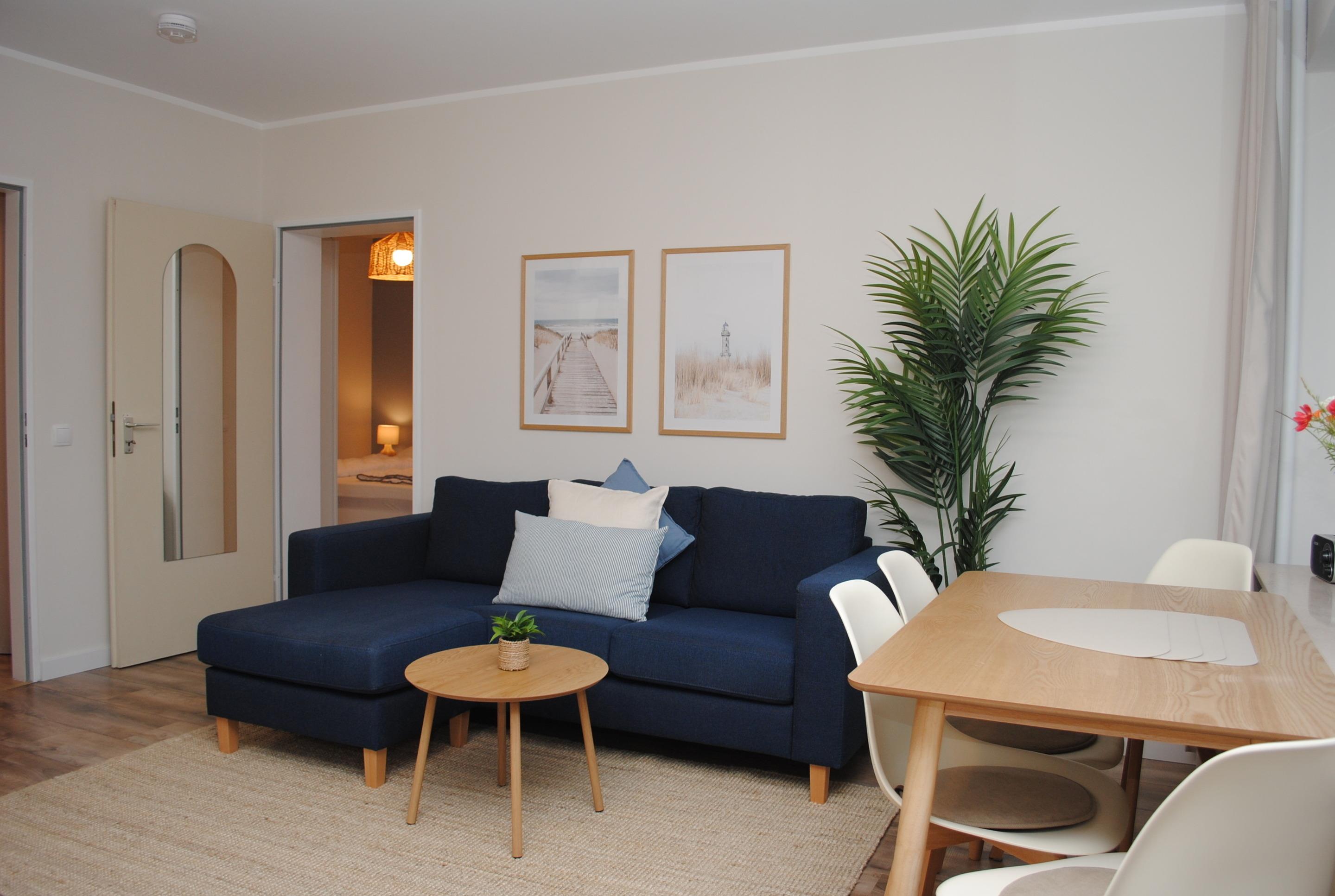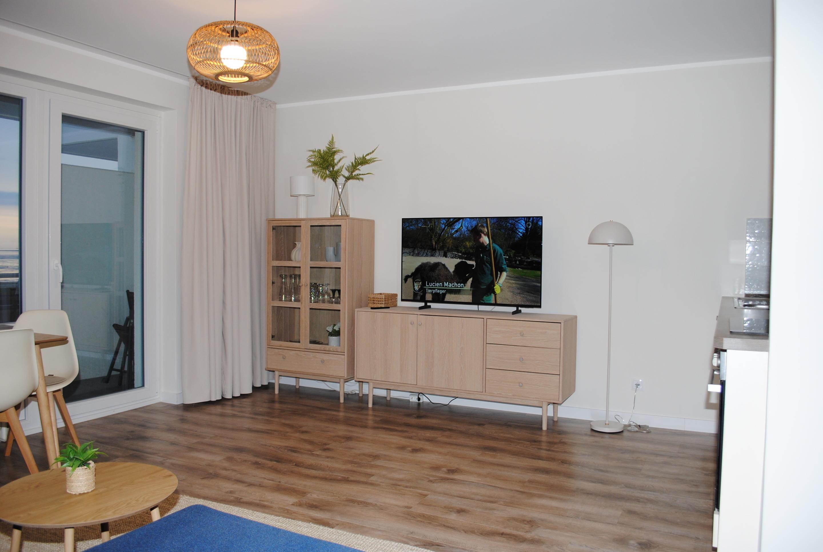 Das Apartment besteht aus einem Schlafzimmer mit 1 Doppelbett, einem Wohnbereich , einem zusätzlichem Etagenbett in einer Nische im Flur und einem Badezimmer mit Dusche sowie WC. Die Ferienwohnung beinhaltet eine voll ausgestattete offene Küche.
