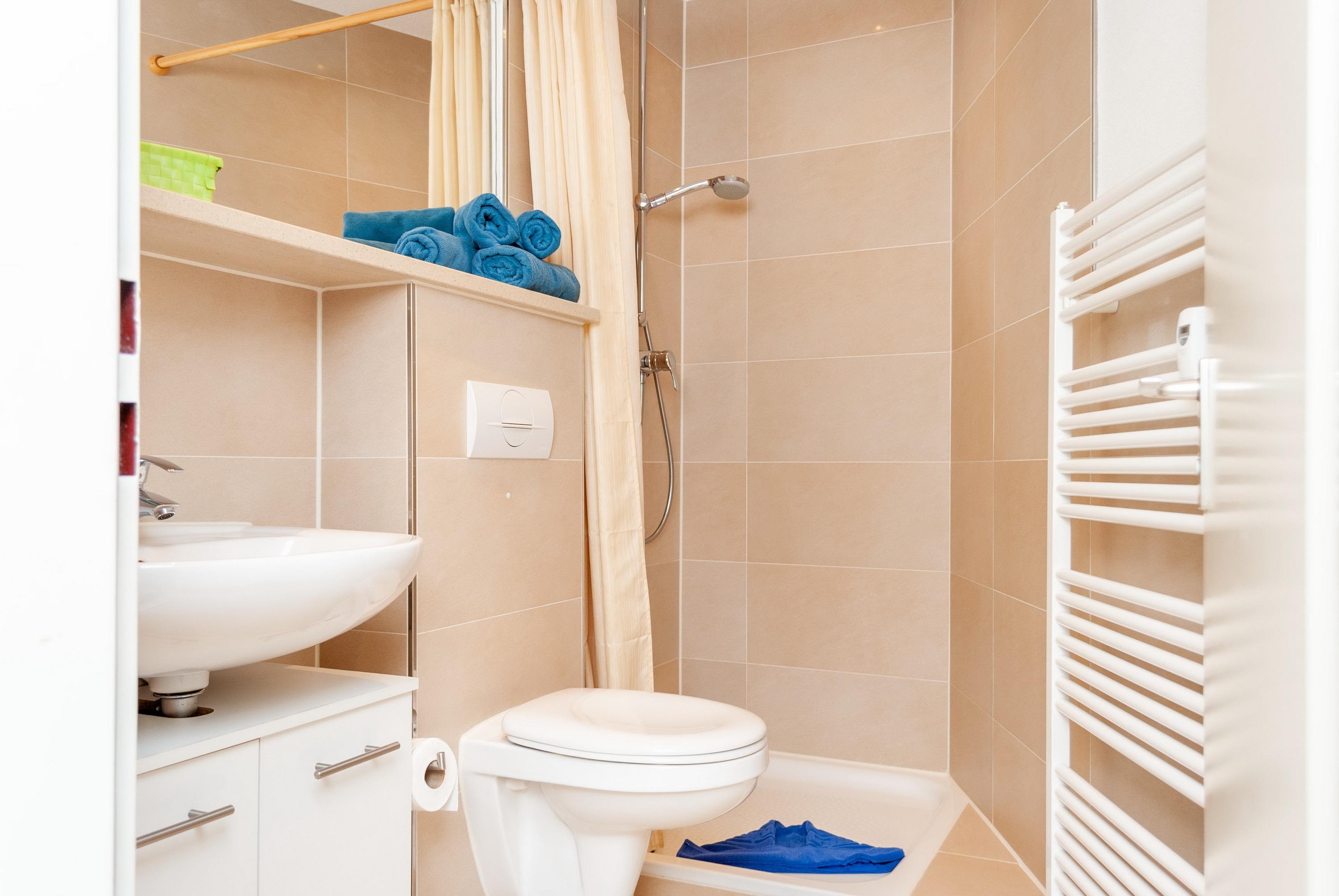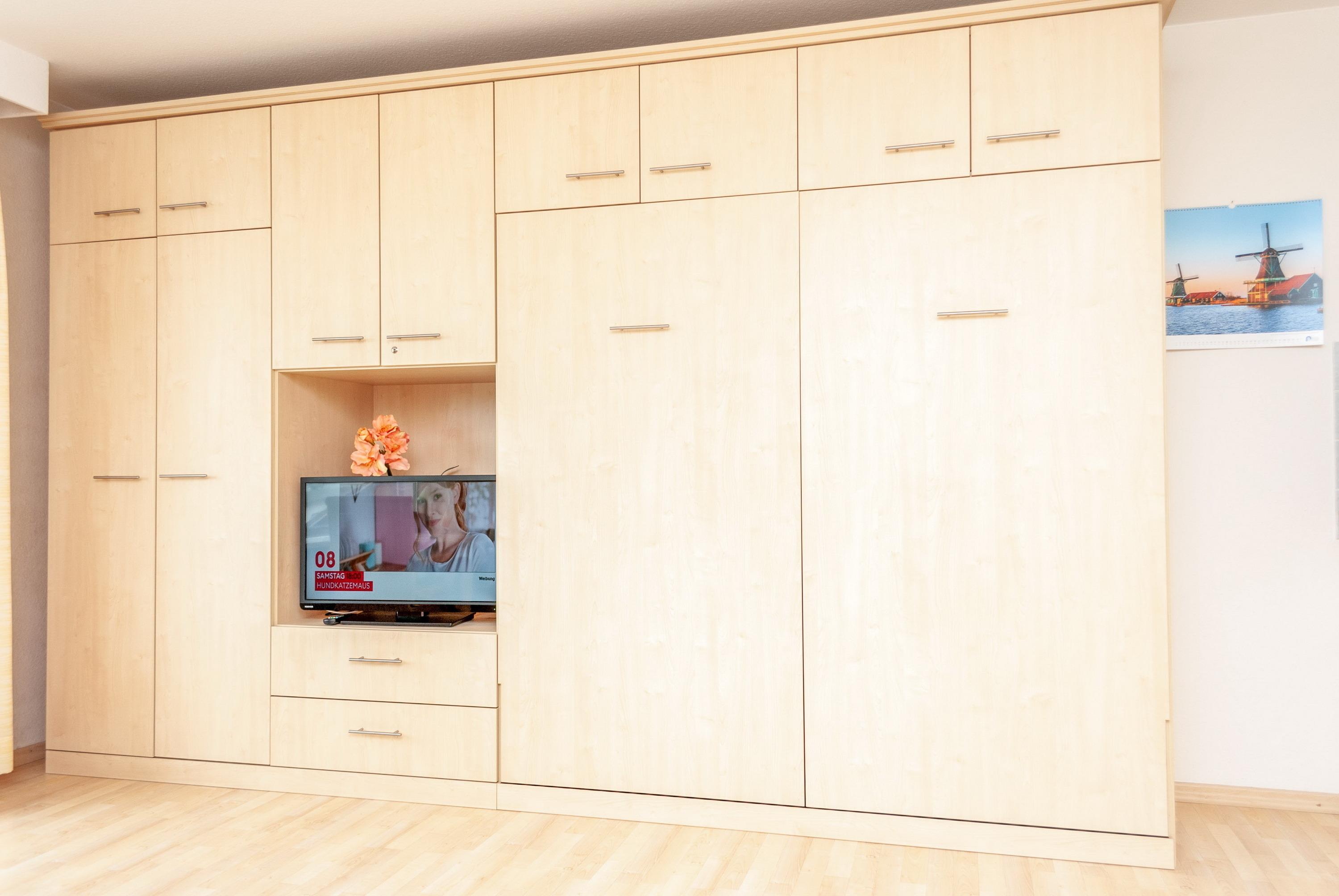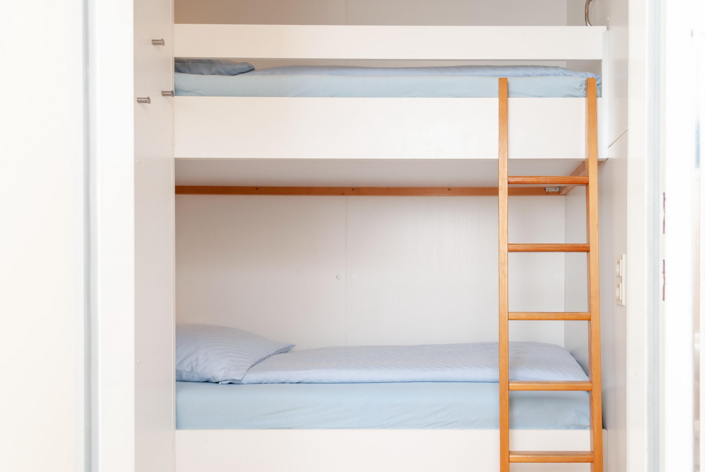 Das Apartment besteht aus einem Wohnbereich mit Schrankbett für 2 Personen, aus einem zusätzlichem Etagenbett in einer Nische im Flur und einem Badezimmer mit Dusche sowie WC. Die Ferienwohnung beinhaltet eine voll ausgestattete offene Küche.