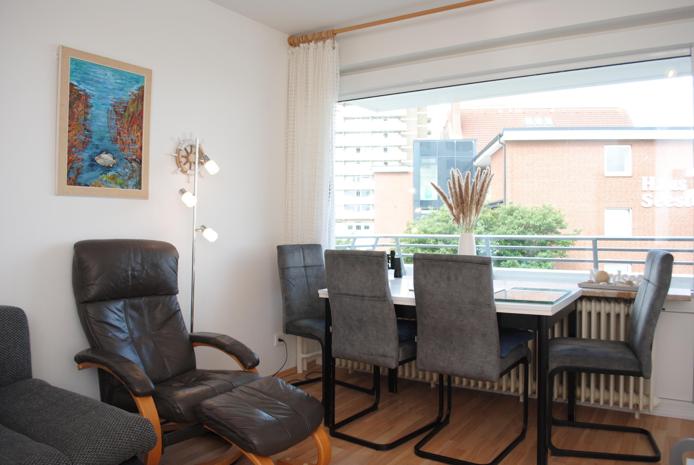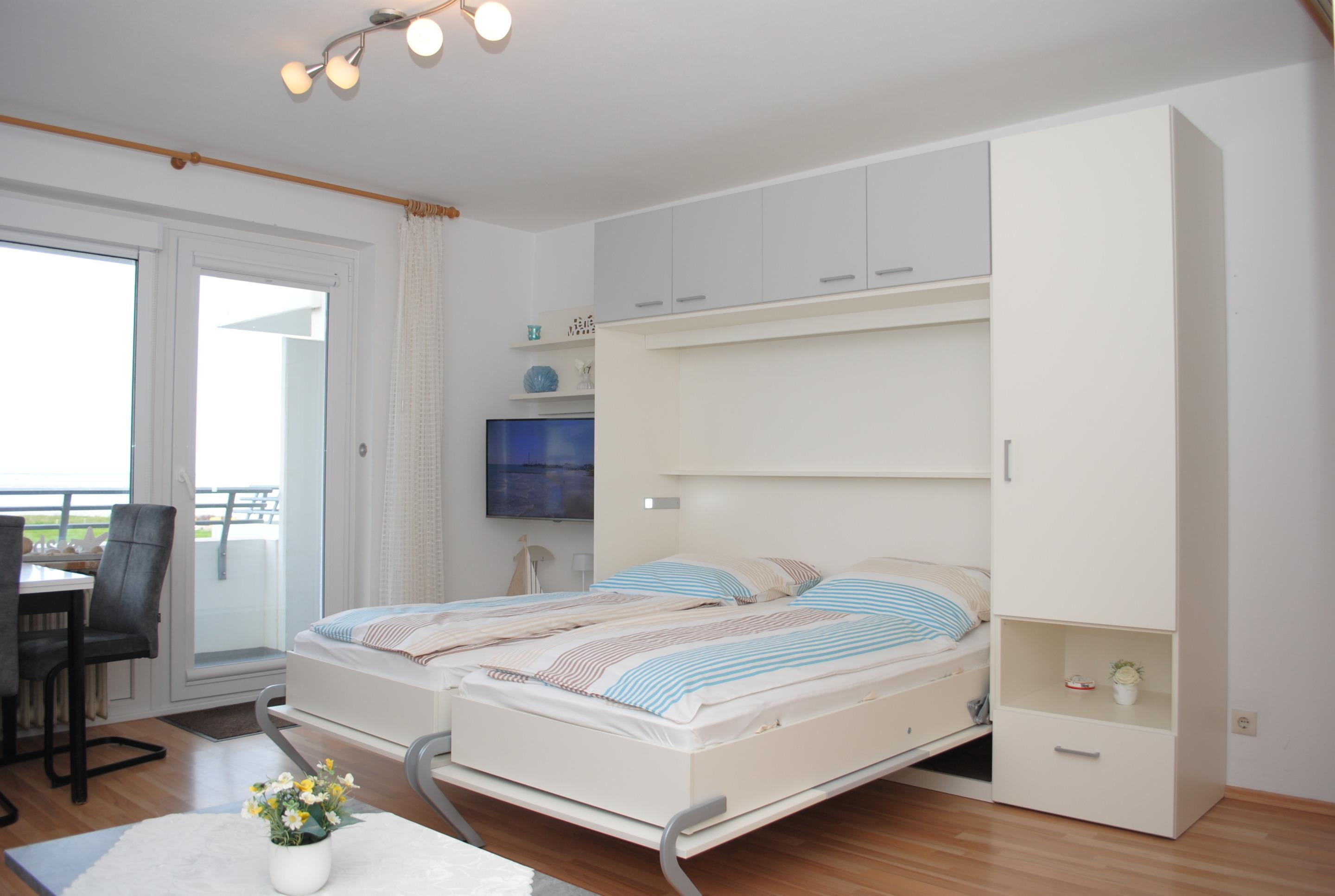 Das Apartment 204 ist ein 1-Raum-Apartment im 2. Obergeschoss für bis zu 4 Personen mit 40 qm. Der Westbalkon mit Meerblick bietet Ihnen vormittags Schatten und nachmittags Sonne .