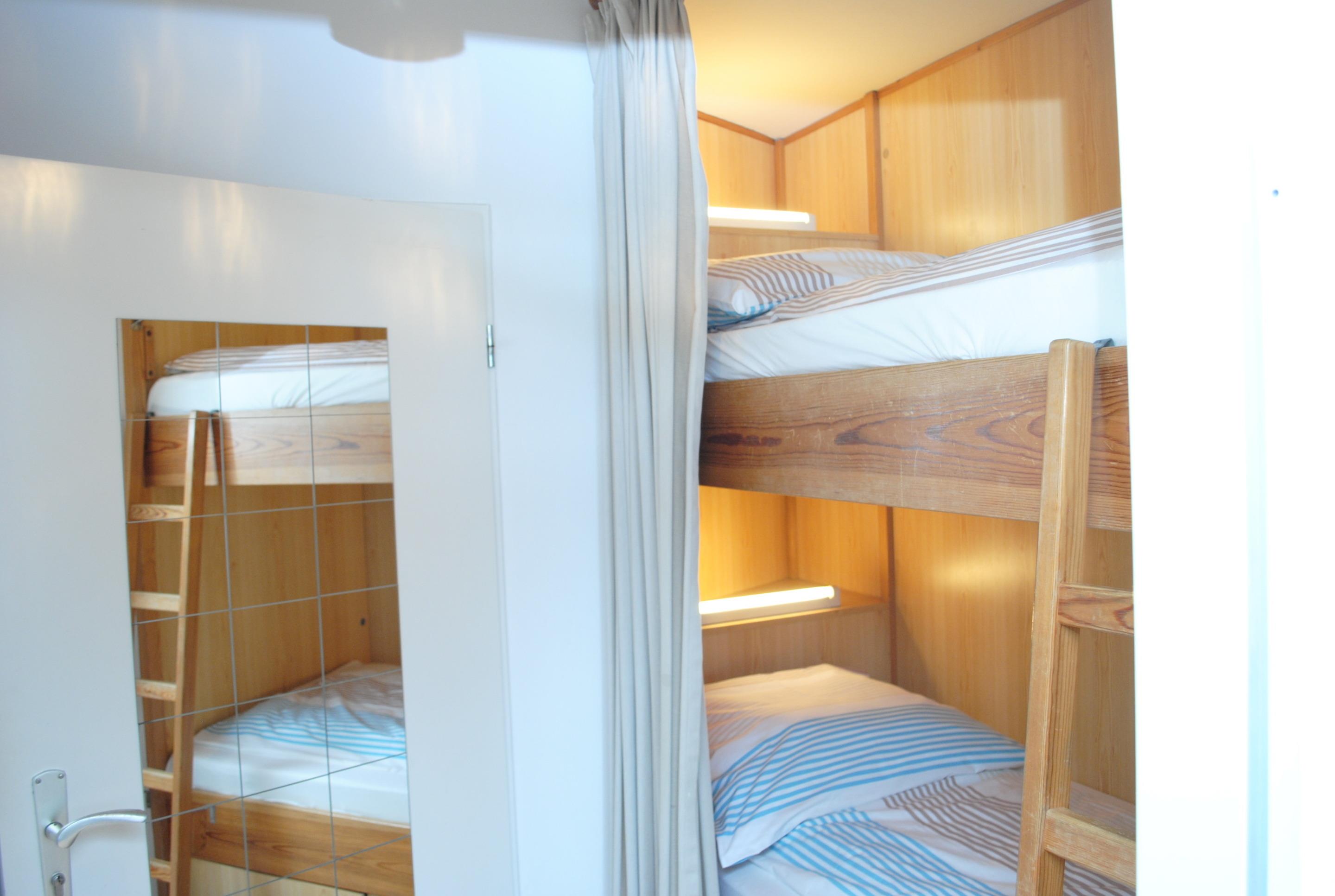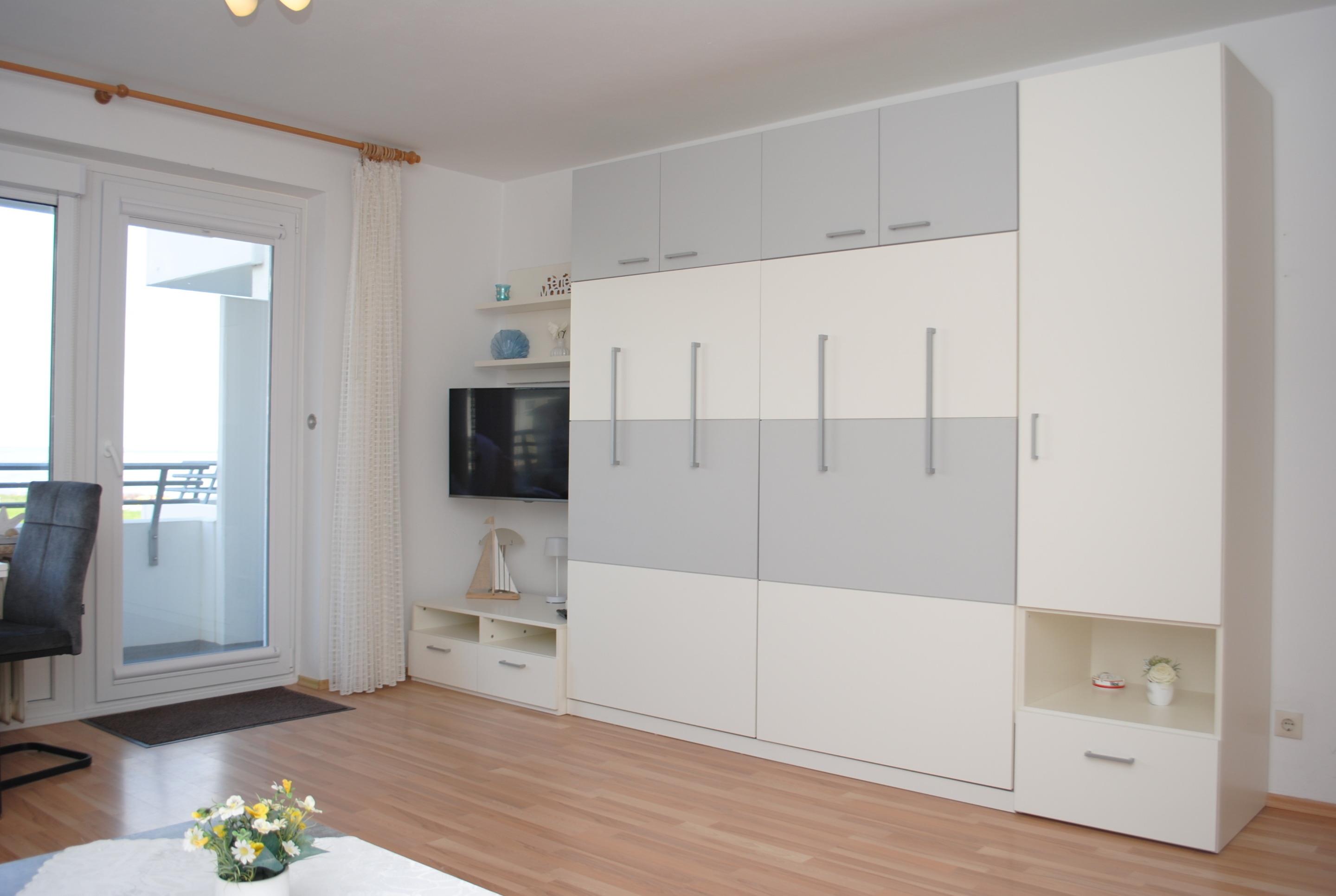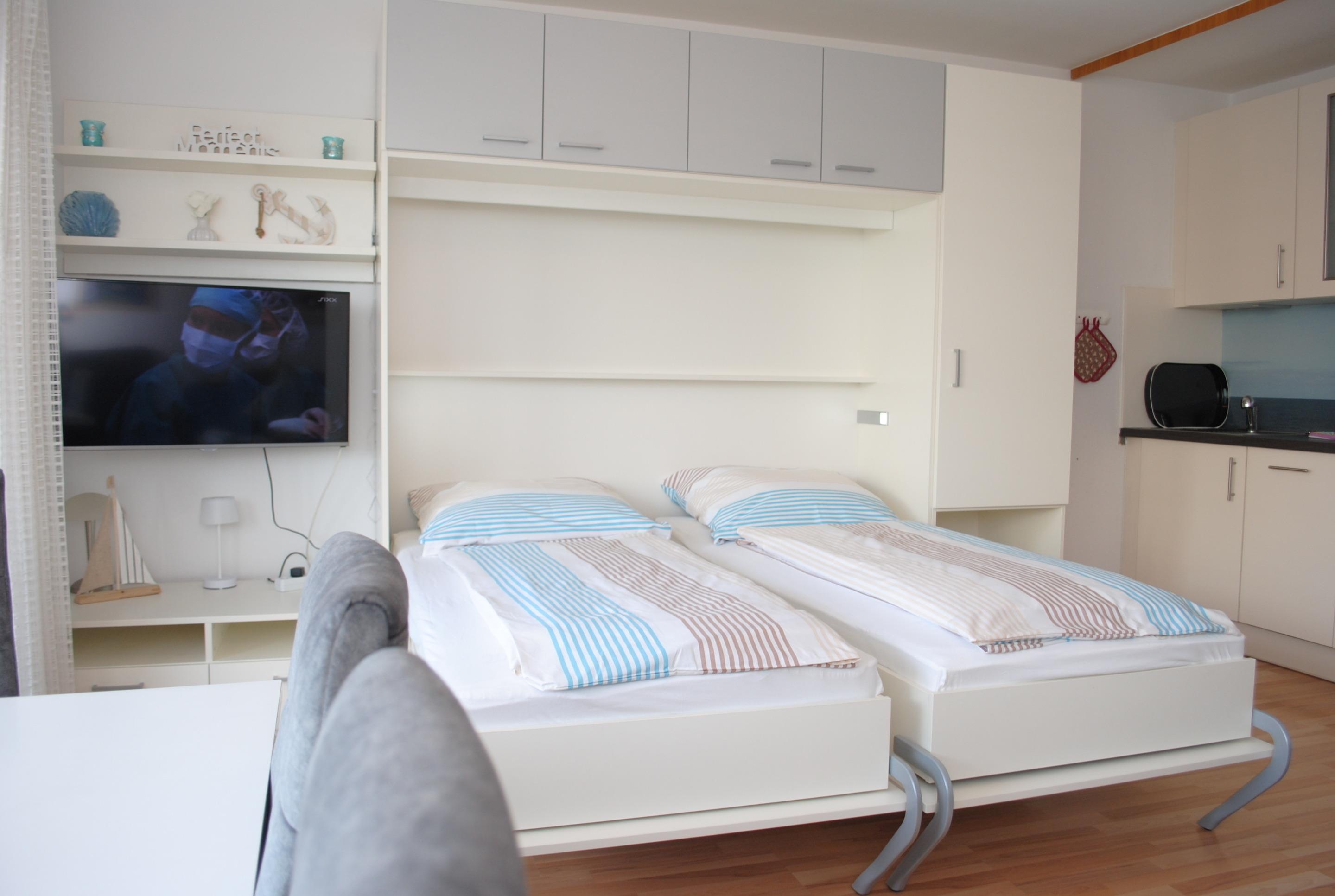 Das Apartment besteht aus einem Wohnbereich mit Schrankbett für 2 Personen, und einem zusätzlichem Etagenbett in einer Nische im Flur, Badezimmer mit Dusche sowie WC. Die Ferienwohnung beinhaltet eine voll ausgestattete offene Küche.
