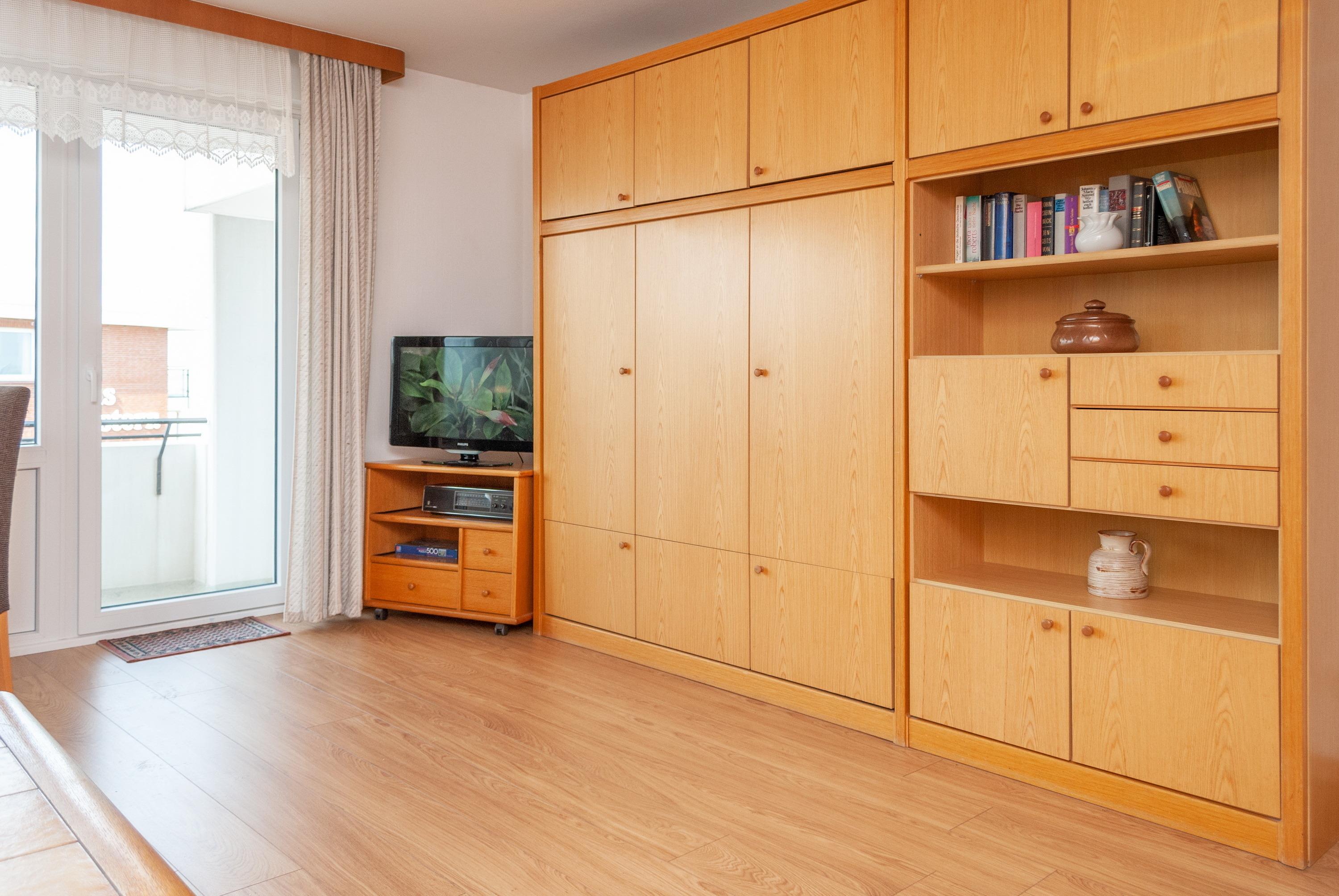 Das Apartment besteht aus einem Wohnbereich mit Schrankbett für 2 Personen, aus einem zusätzlichem Etagenbett in einer Nische im Flur und einem Badezimmer mit Dusche sowie WC. Die Ferienwohnung beinhaltet eine voll ausgestattete offene Küche.
