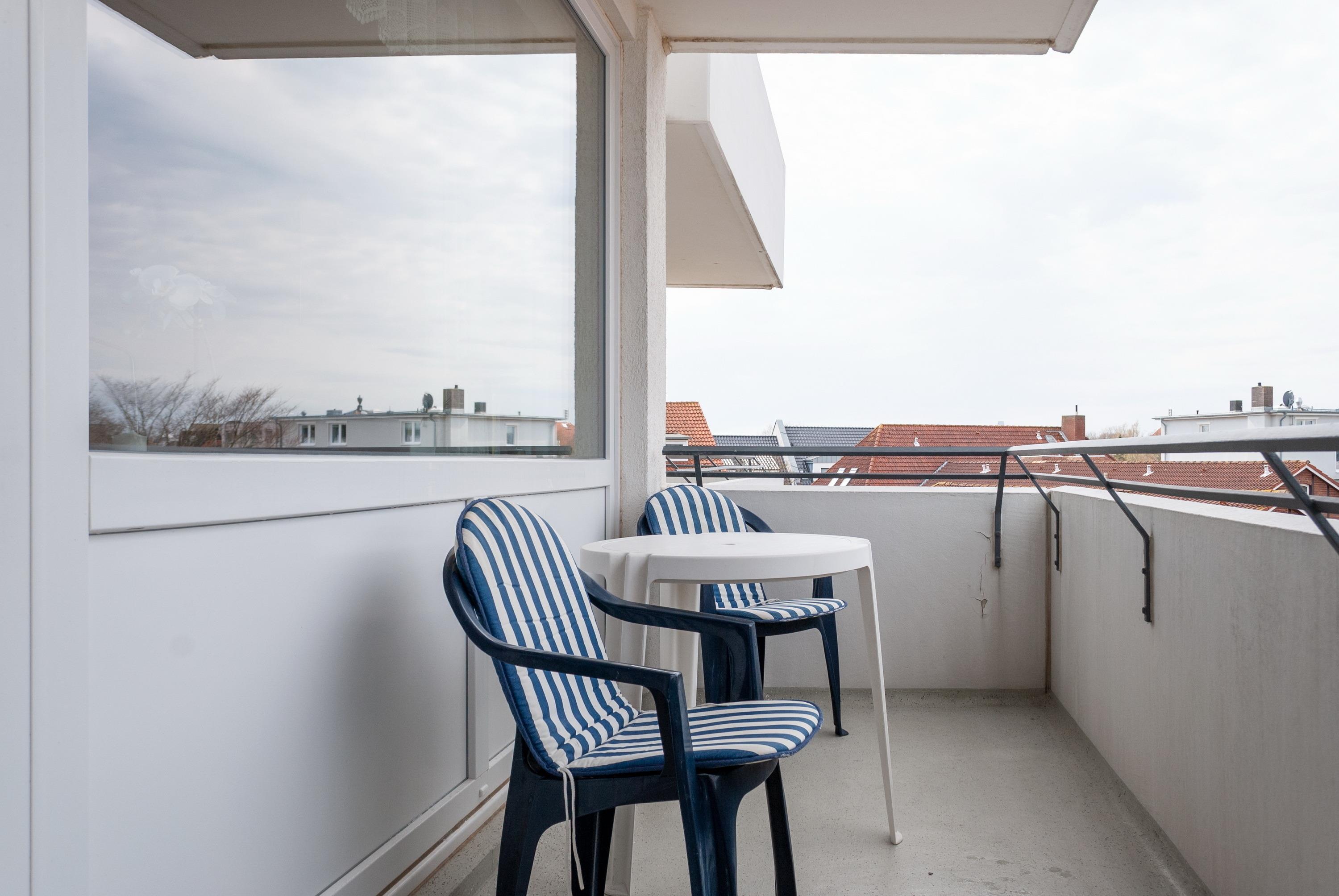 Das Apartment 302 ist ein 1-Raum-Apartment im 3. Obergeschoss für bis zu 4 Personen mit 40 qm. Der Westbalkon mit Meerblick bietet Ihnen vormittags Schatten und nachmittags Sonne.