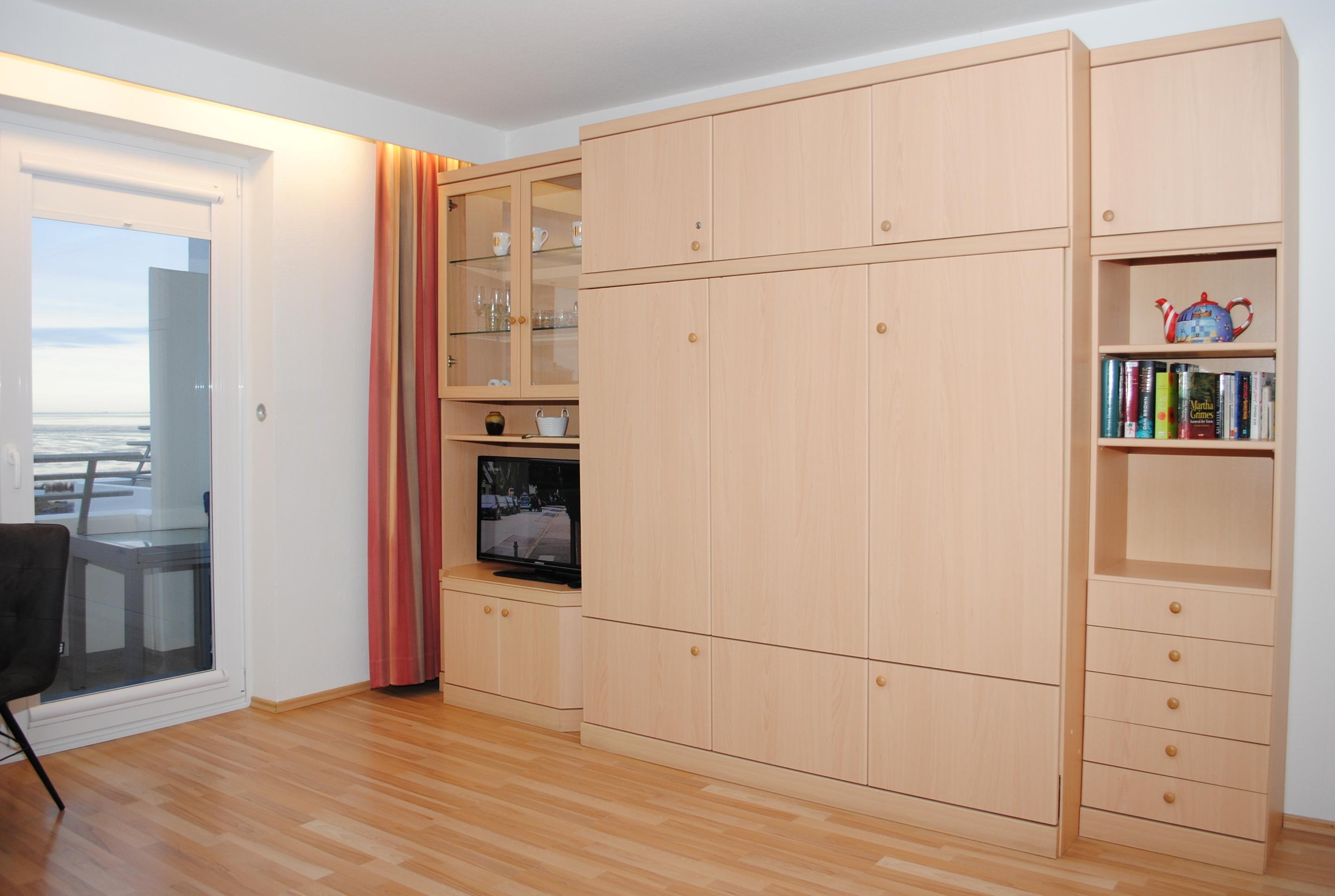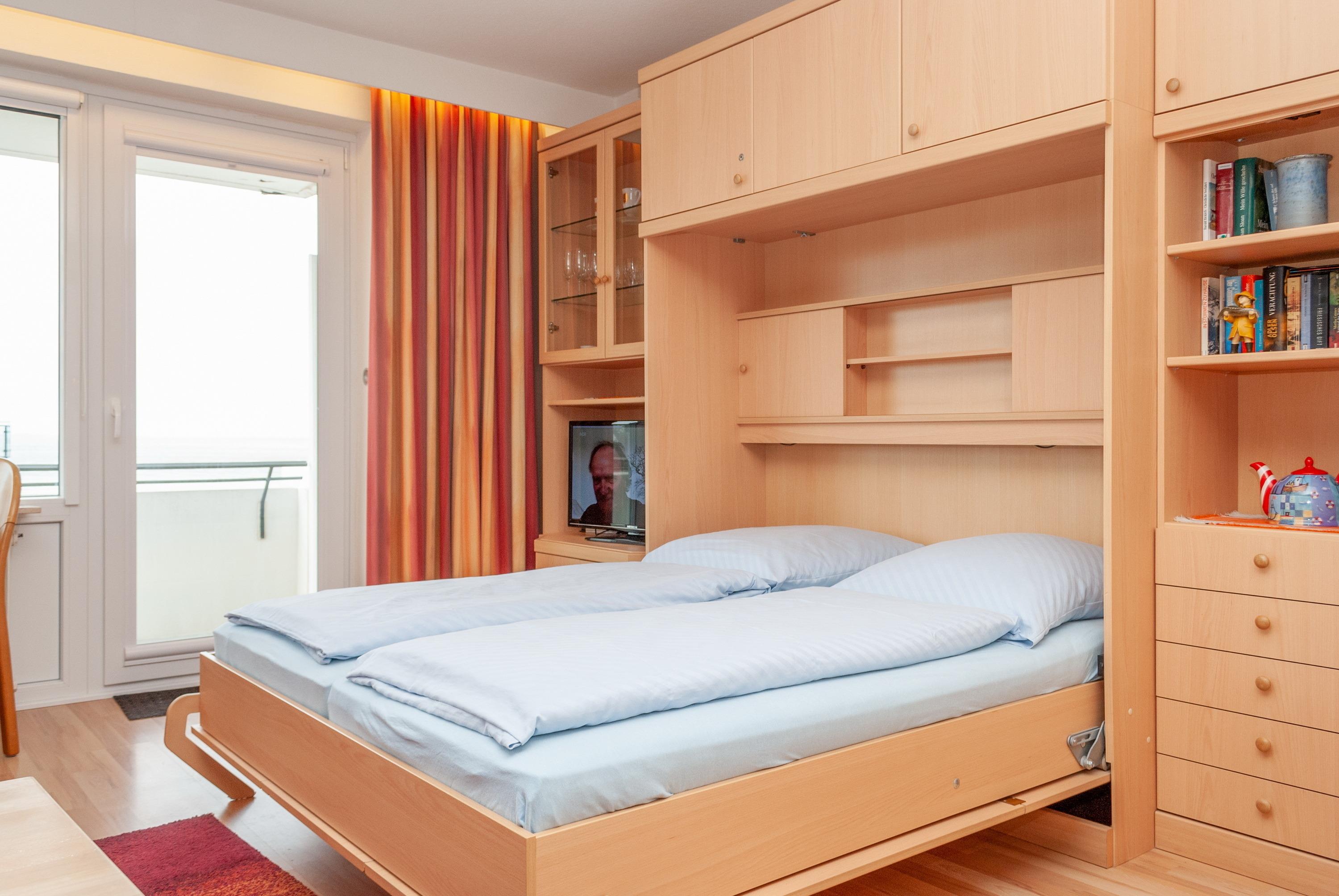 Das Apartment 304 ist ein 1-Raum-Apartment im 3. Obergeschoss für bis zu 4 Personen mit 40 qm. Der Westbalkon mit Meerblick bietet Ihnen vormittags Schatten und nachmittags Sonne .