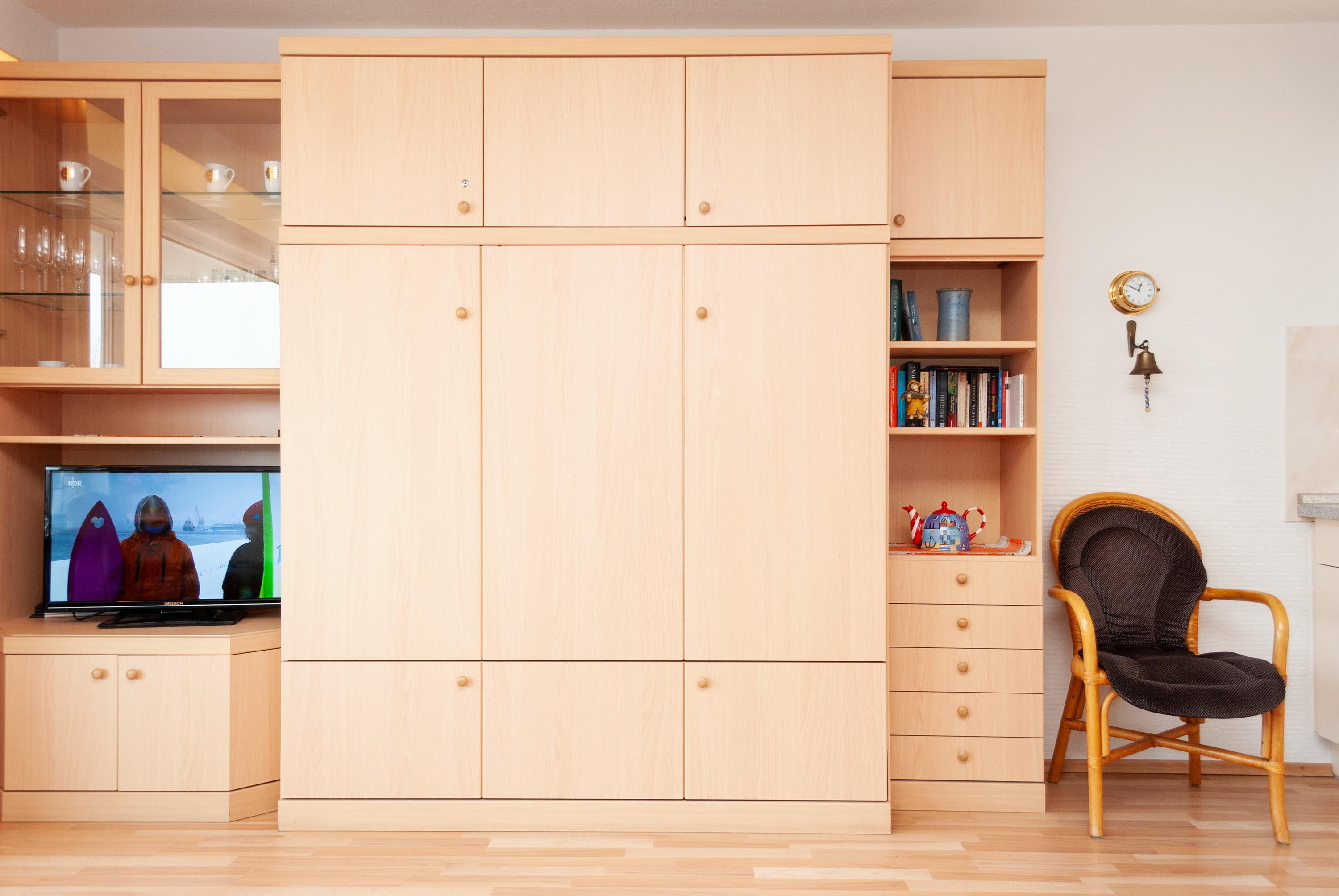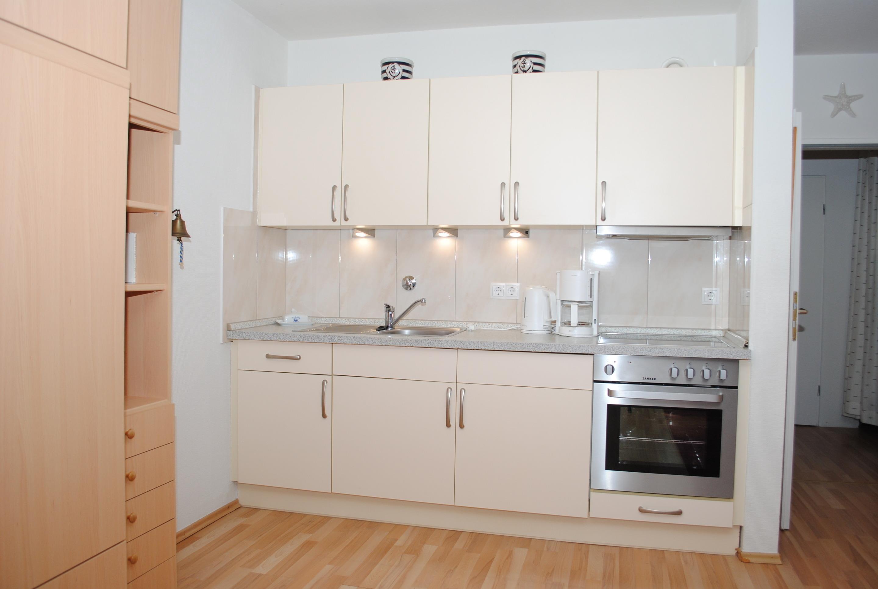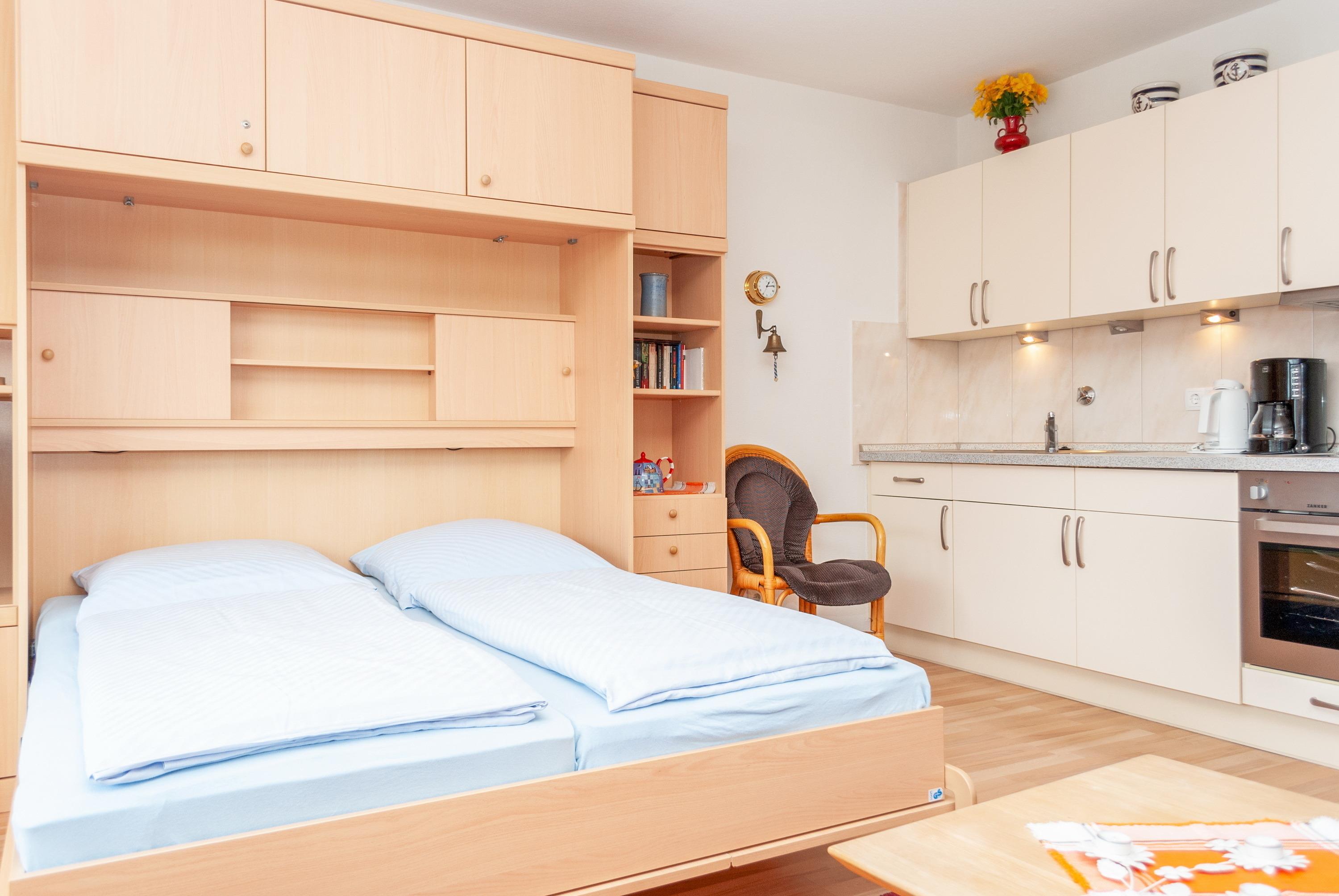 Das Apartment besteht aus einem Wohnbereich mit Schrankbett für 2 Personen ,einem zusätzlichem Etagenbett in einer Nische im Flur und einem Badezimmer mit Dusche sowie WC. Die Ferienwohnung beinhaltet eine voll ausgestattete offene Küche.