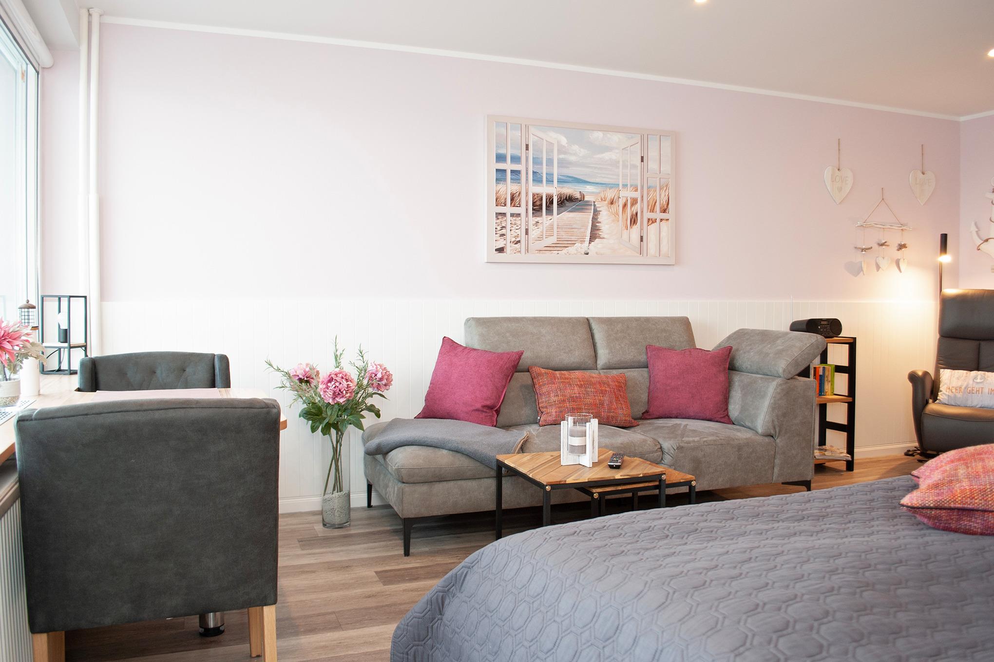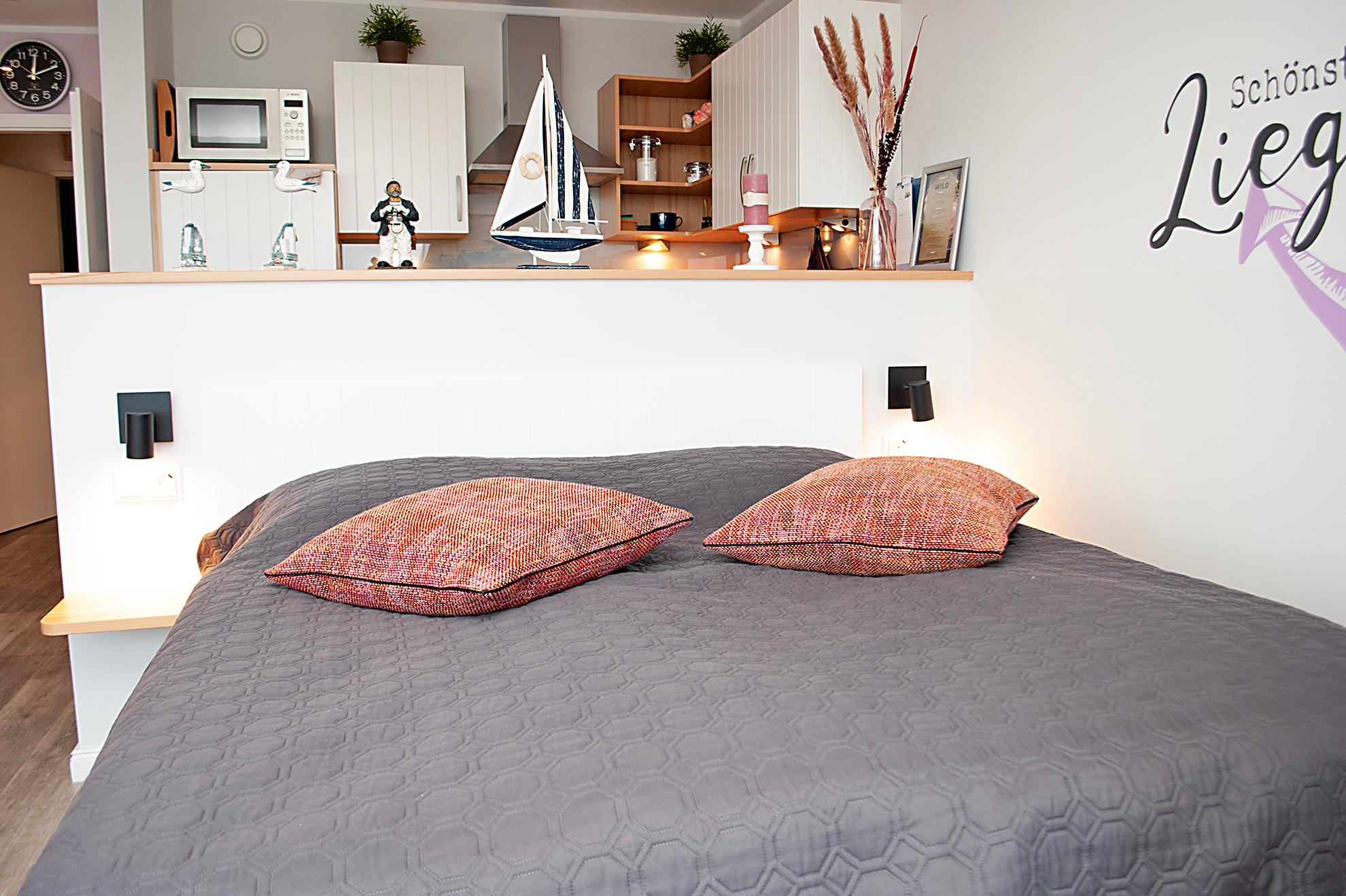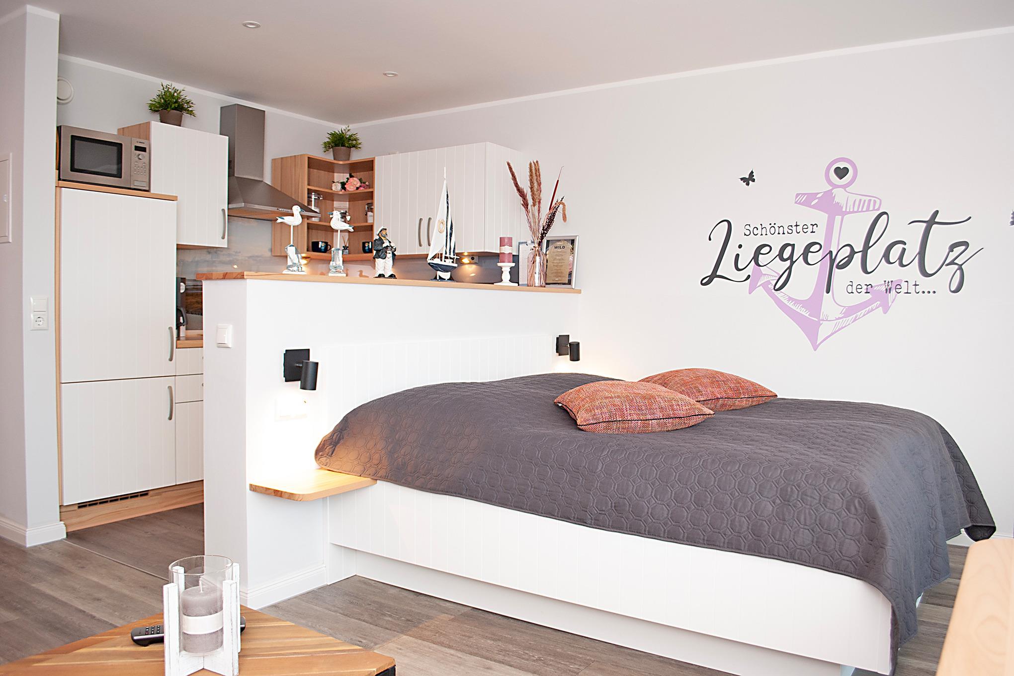 Das Apartment besteht aus einem Wohnbereich mit franz.bett für 2 Personen und einem Badezimmer mit Dusche sowie WC. Die Ferienwohnung beinhaltet eine voll ausgestattete offene Küche.
