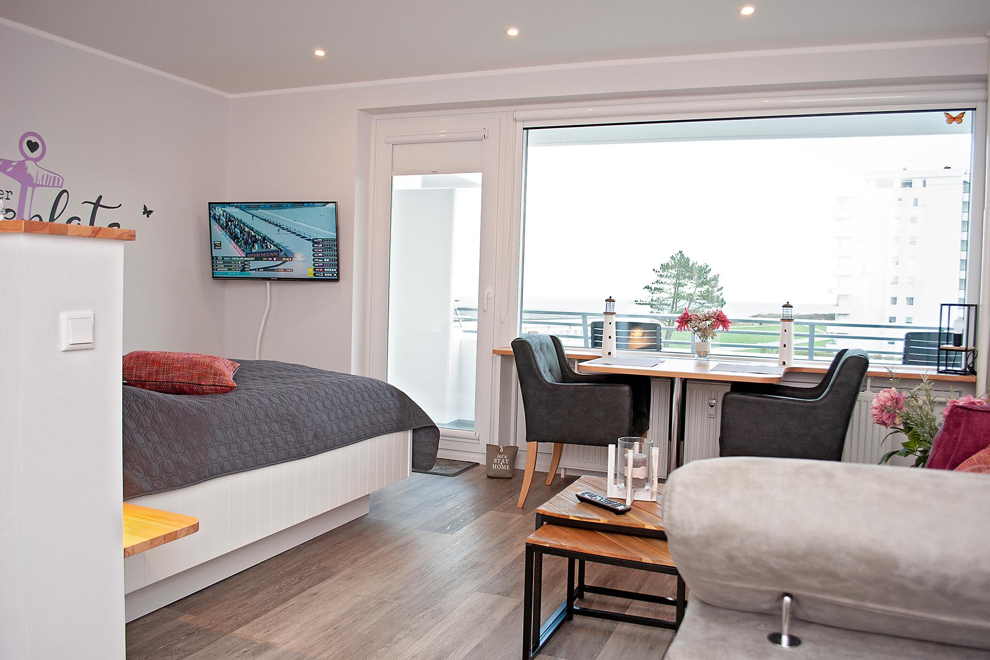 Das Apartment 311 ist ein 1-Raum-Apartment im 3. Obergeschoss für bis zu 2 Personen mit 40 qm. Der Ostbalkon mit Meerblick bietet Ihnen vormittags Sonne und nachmittags Schatten.