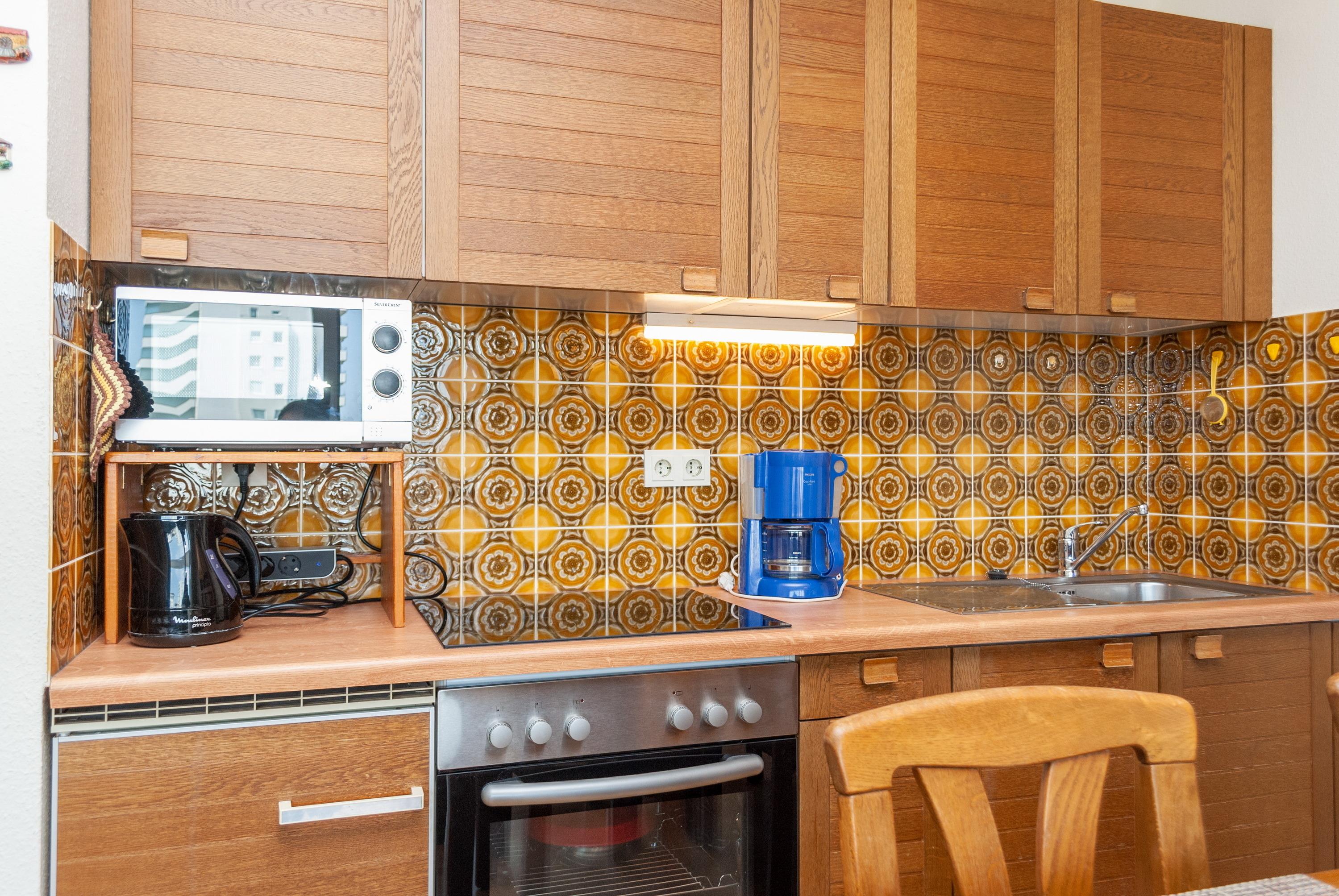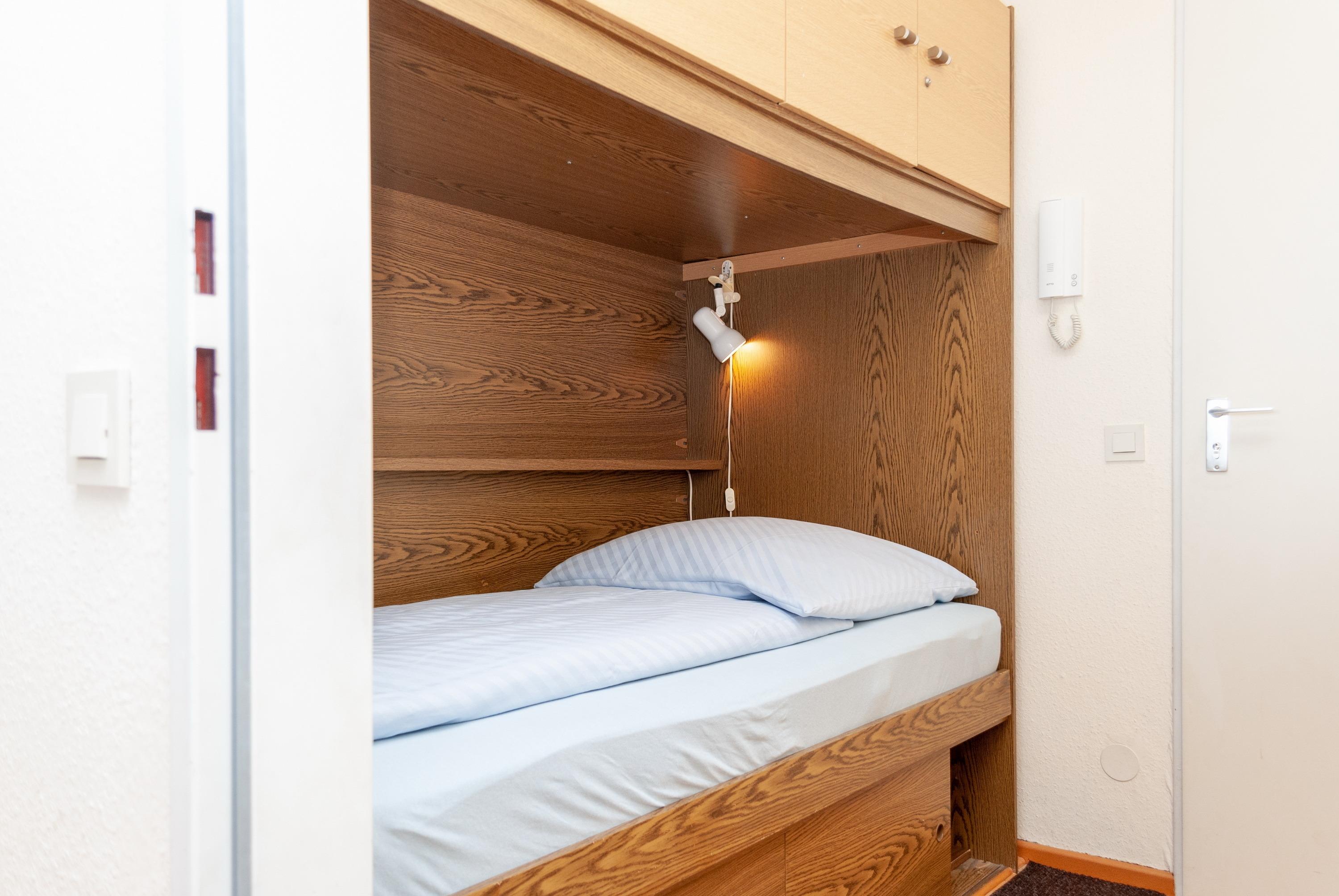 Das Apartment besteht aus einem Schlafzimmer mit 2 Einzelbetten, einem Wohnbereich mit zusätzlichem Schrankbett für 1 Person, einem Etagenbett für 1 Peson in einer Nische im Flur und einem Badezimmer mit Dusche sowie WC. Die Ferienwohnung beinhaltet eine gut ausgestattete offene Küche.