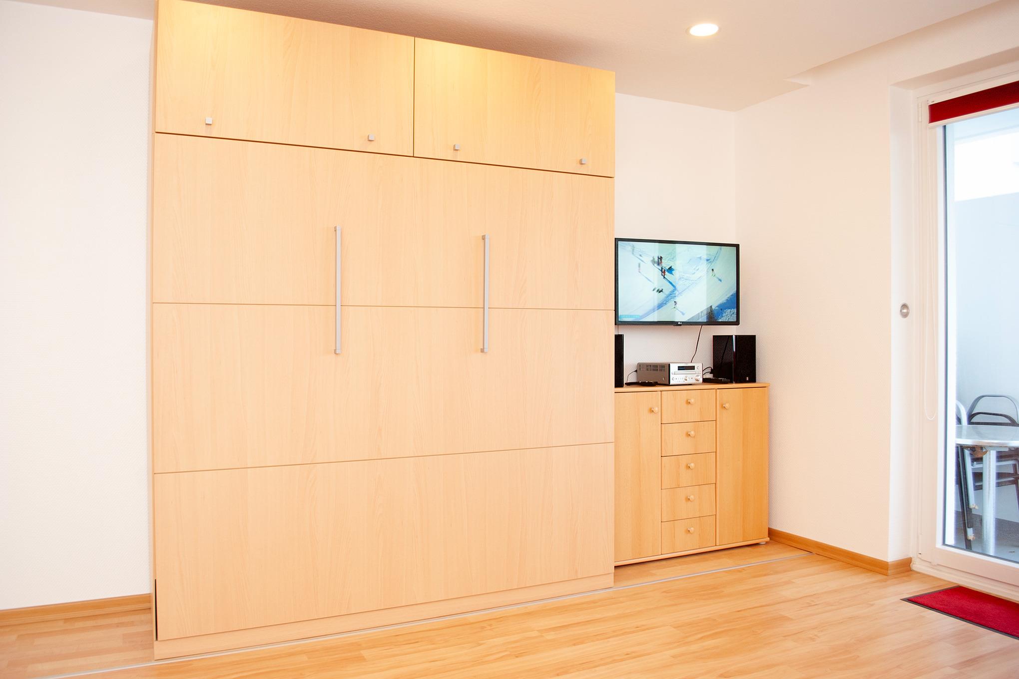 Das Apartment besteht aus einem Wohnbereich mit Schrankbett für 2 Personen, einem zusätzlichem Etagenbett in einer Nische im Flur und einem Badezimmer mit Dusche sowie WC. Die Ferienwohnung beinhaltet eine voll ausgestattete offene Küche.