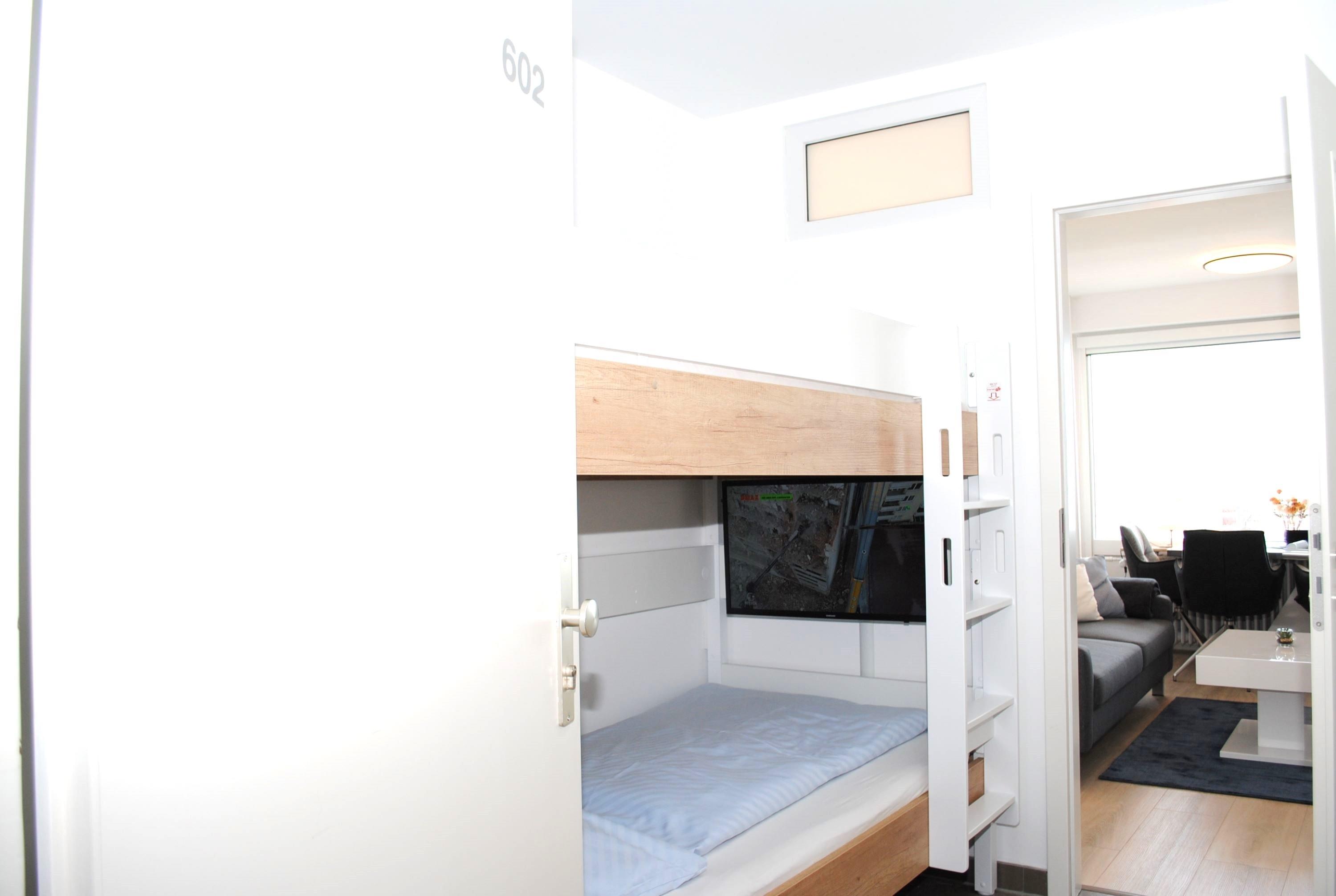 Das Apartment 602 ist ein 1-Raum-Apartment im 6. Obergeschoss für bis zu 4 Personen mit 40 qm. Der Westbalkon mit Meerblick bietet Ihnen vormittags Schatten und nachmittags Sonne .