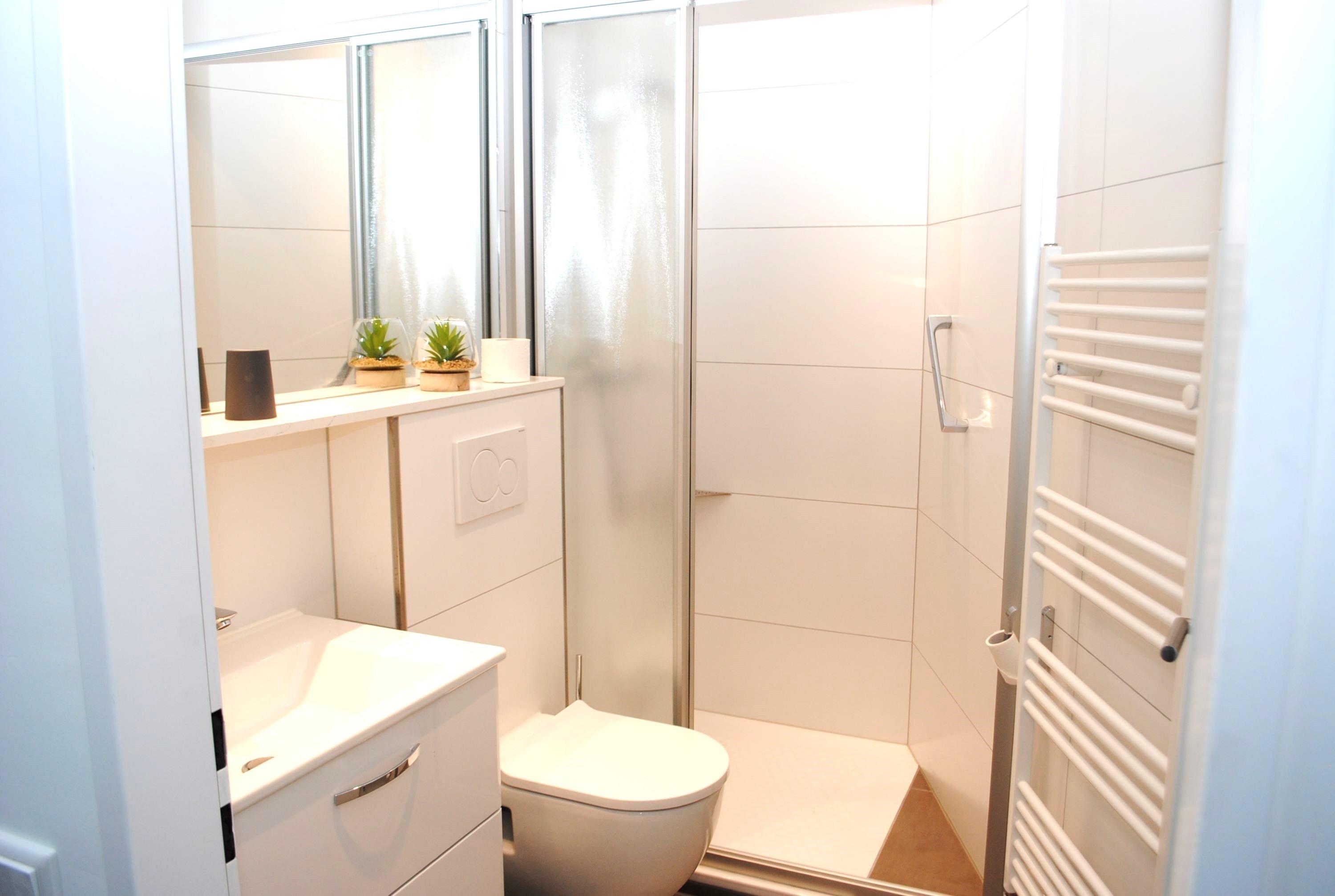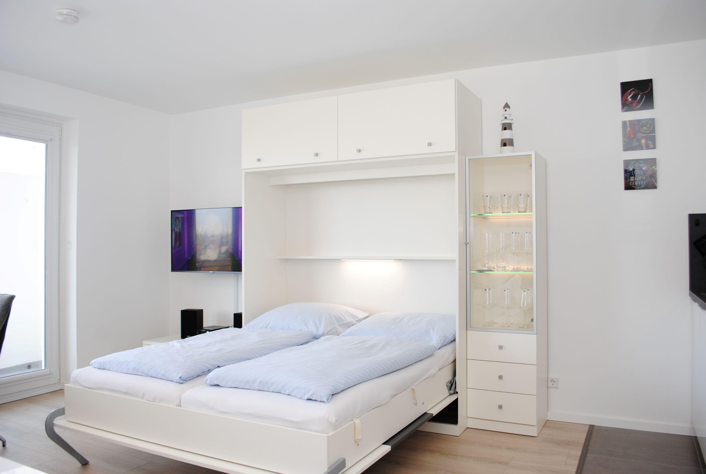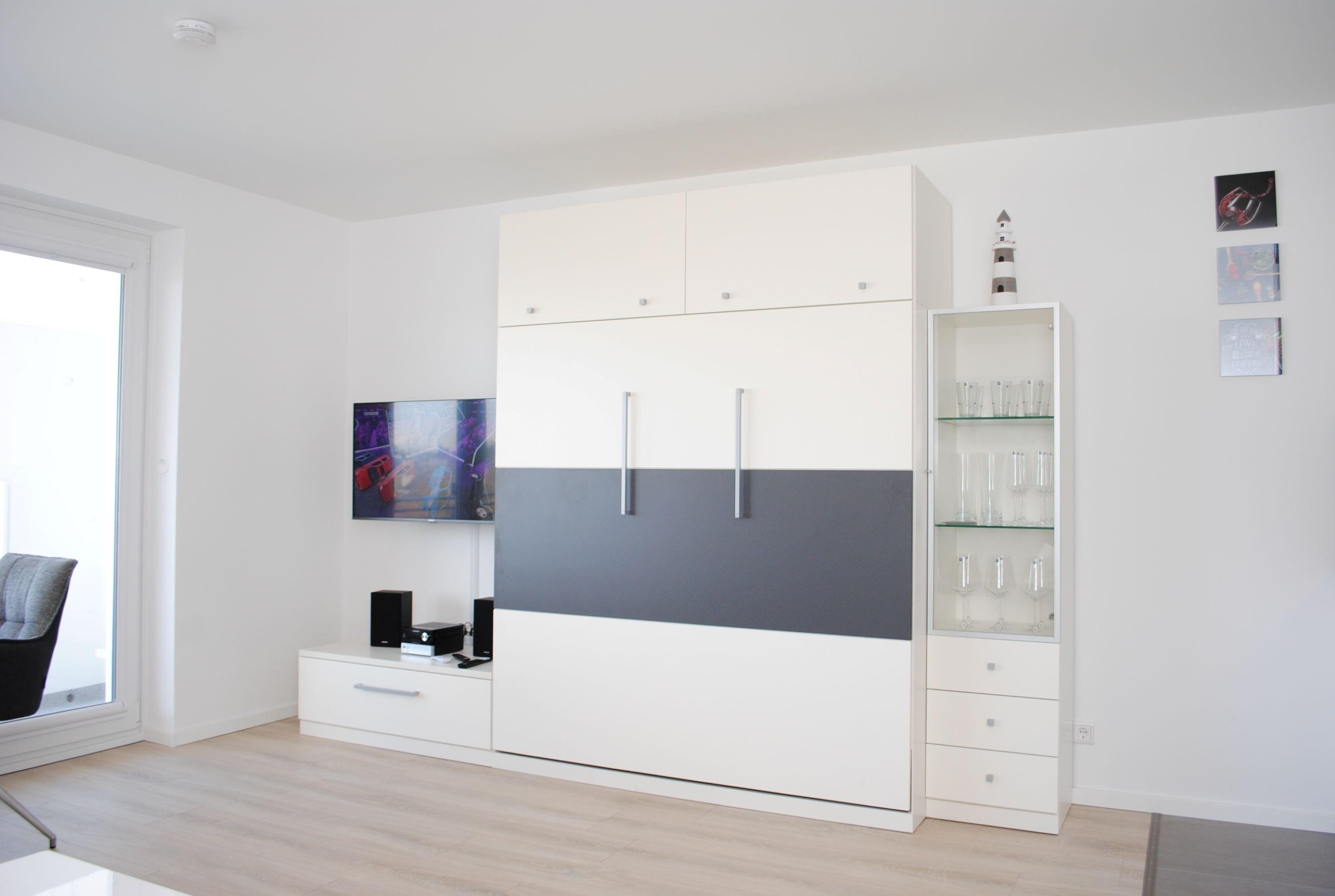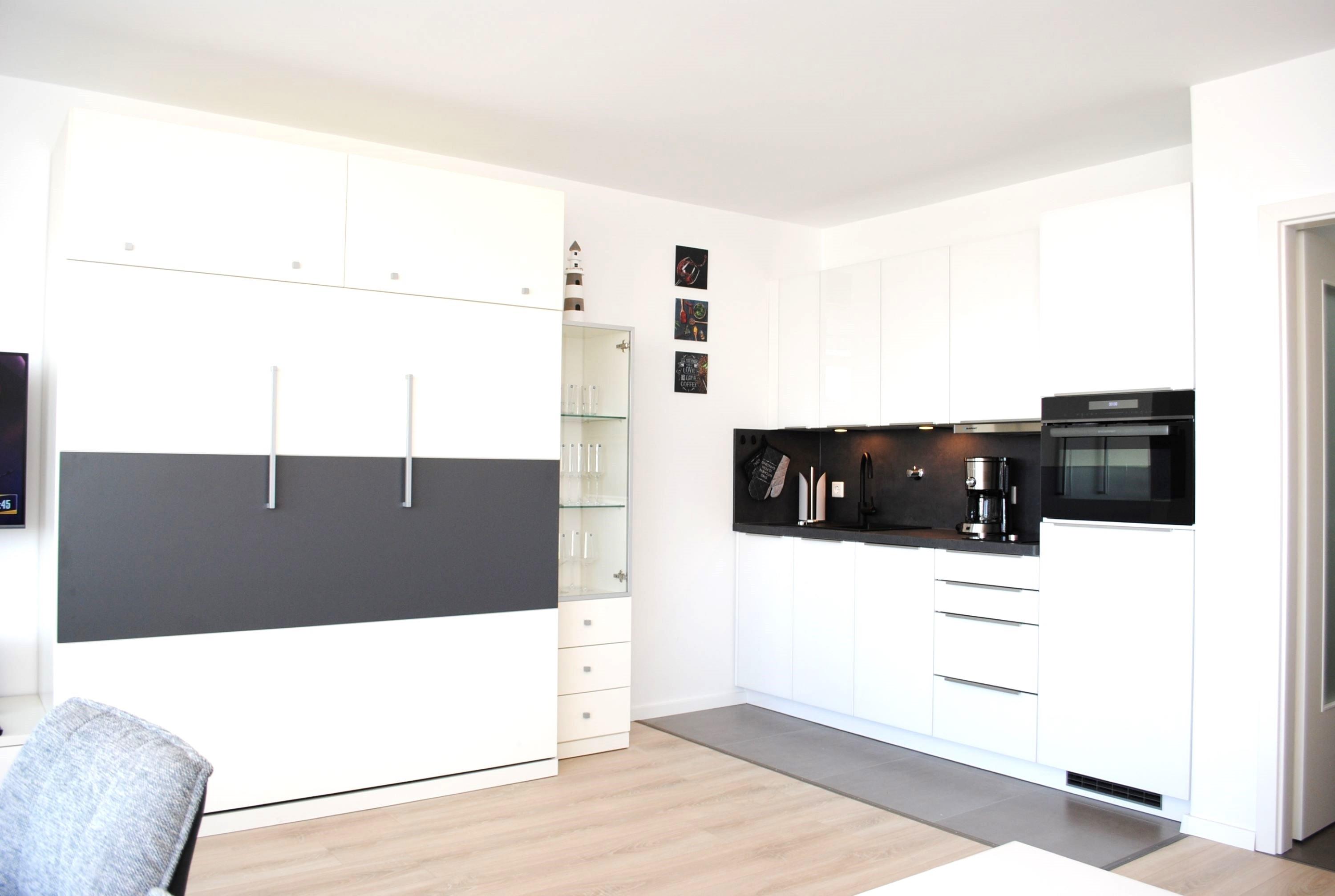 Das Apartment besteht aus einem Wohnbereich mit Schrankbett für 2 Personen, aus einem zusätzlichem Etagenbett in einer Nische im Flur und einem Badezimmer mit Dusche sowie WC. Die Ferienwohnung beinhaltet eine voll ausgestattete offene Küche.