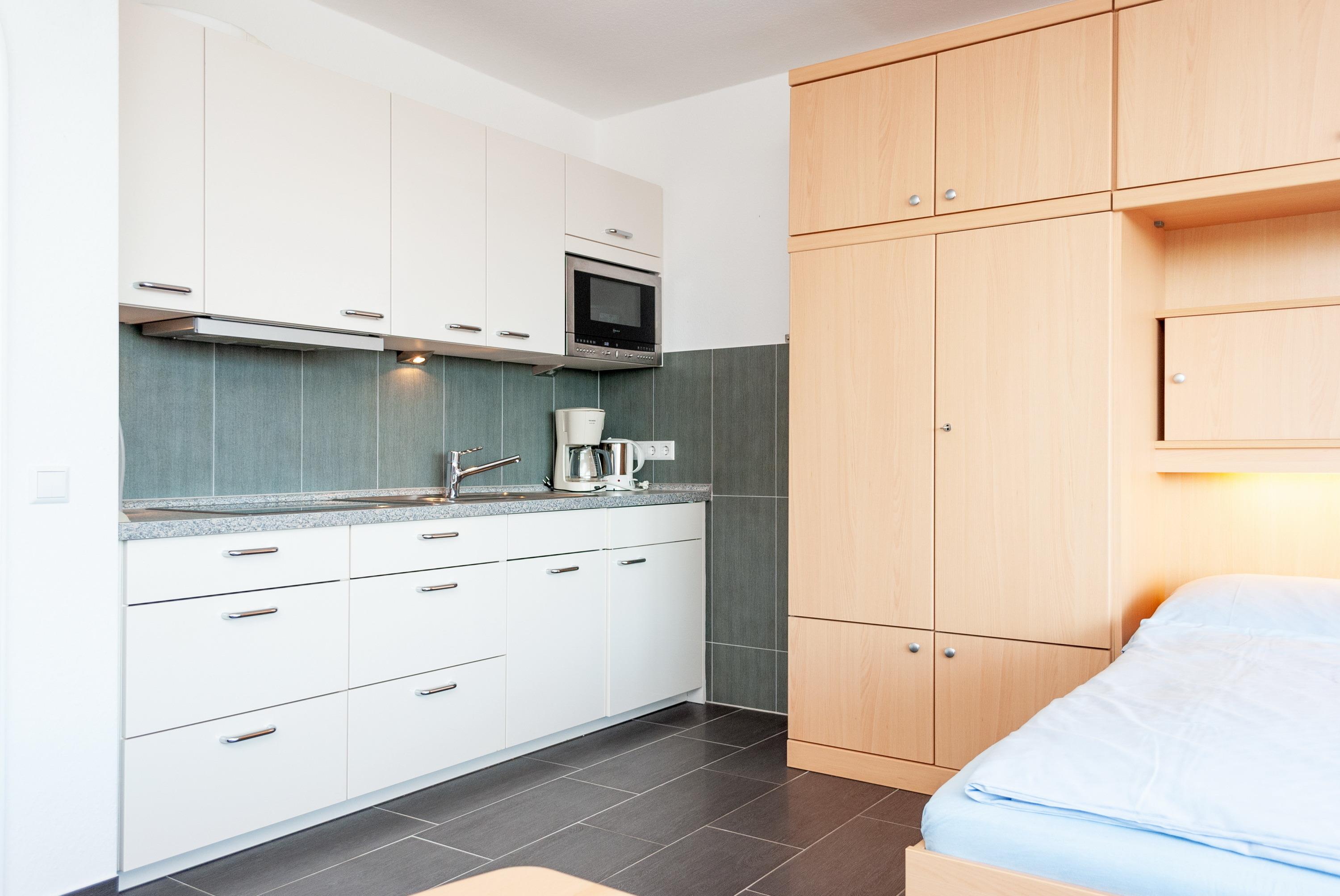 Das Apartment besteht aus einem Wohnbereich mit Schrankbett für 2 Personen, eine zusätzliche Schlafsofa in einer Mische im Flur und einem Badezimmer mit Dusche sowie WC. Die Ferienwohnung beinhaltet eine voll ausgestattete offene Küche.
