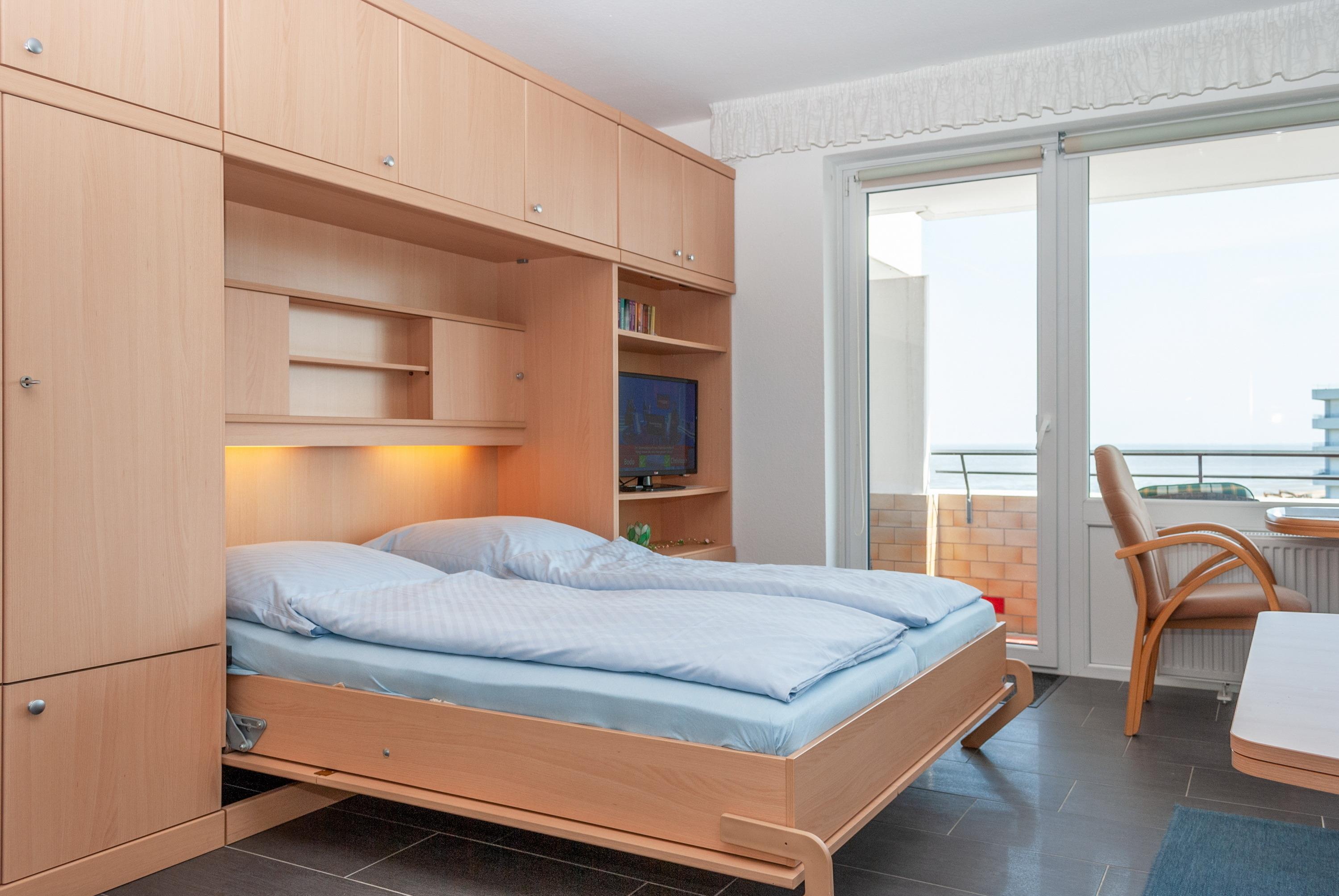 Das Apartment 711 ist ein 1-Raum-Apartment im 7. Obergeschoss für bis zu 3 Personen mit 40 qm. Der Ostbalkon mit Meerblick bietet Ihnen vormittags Sonne und nachmittags Schatten.