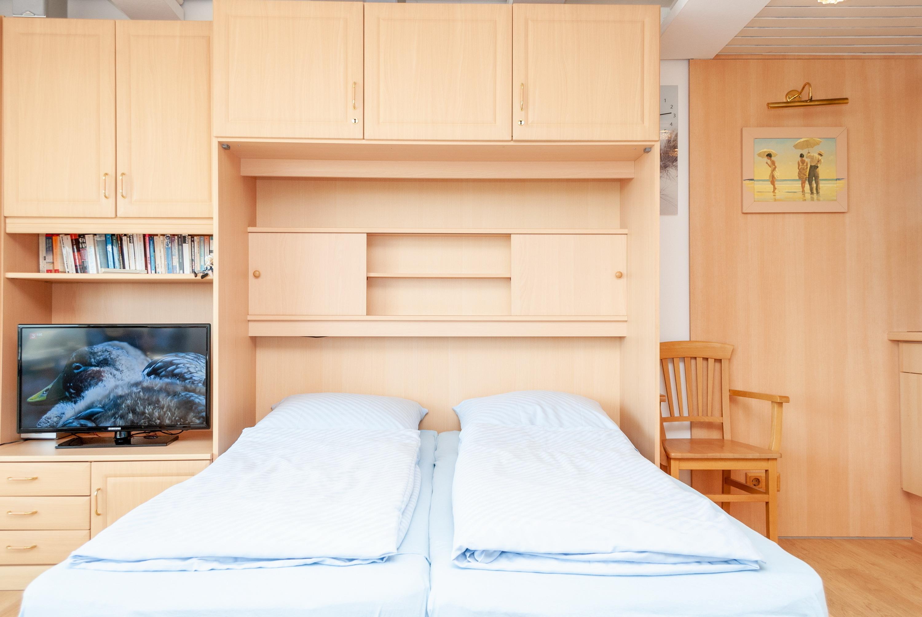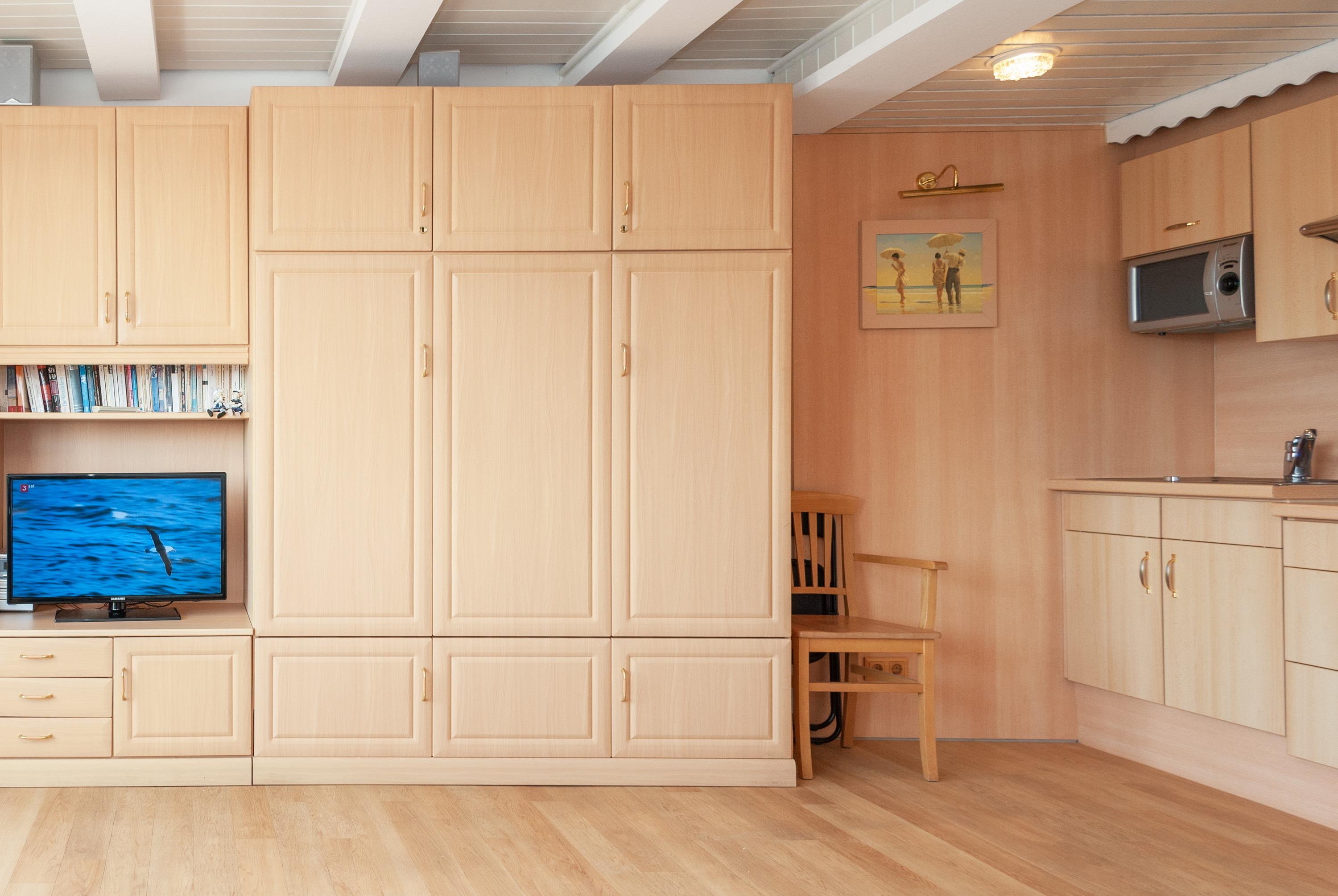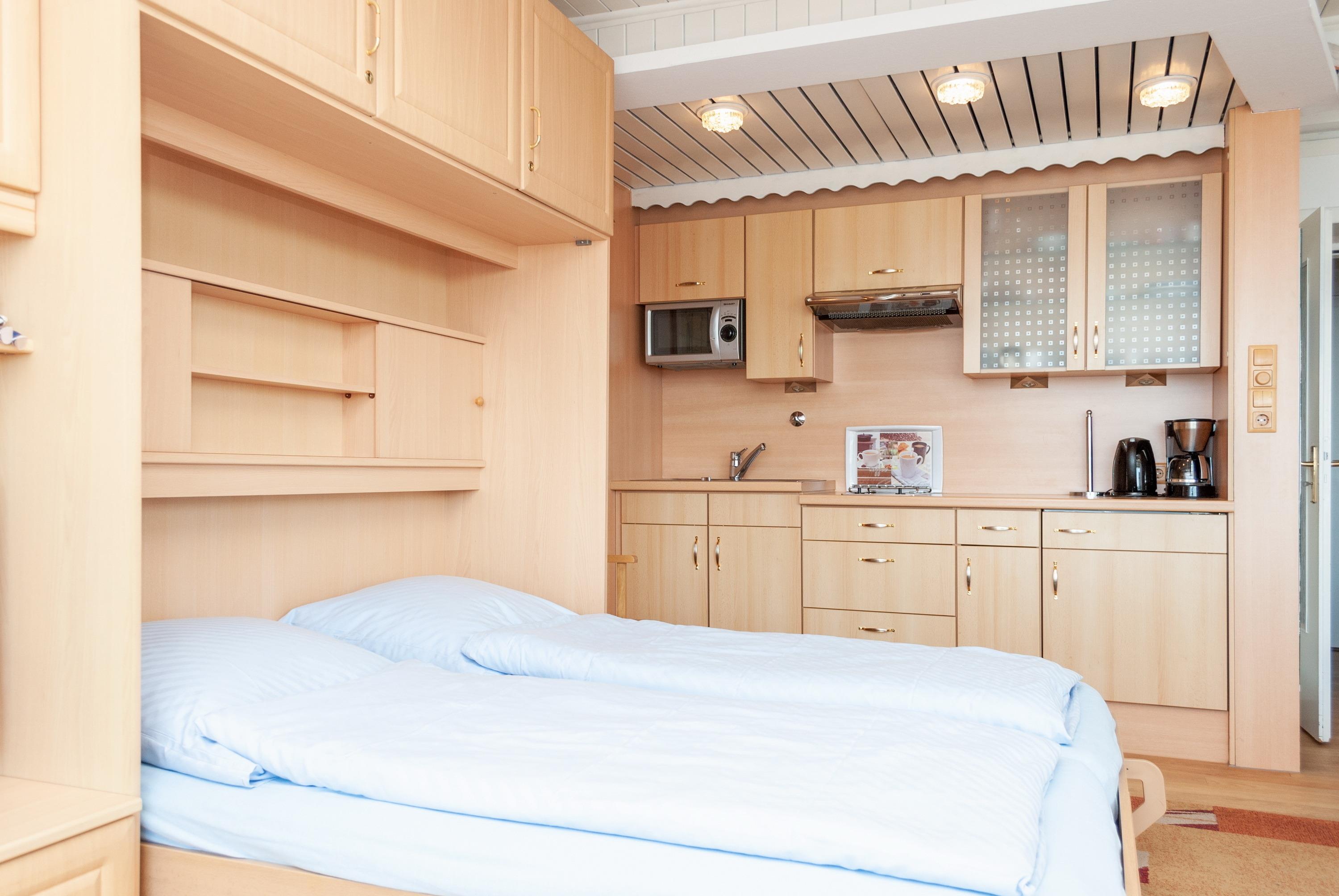 Das Apartment besteht aus einem Wohnbereich mit Schrankbett für 2 Personen, und einem Badezimmer mit Dusche sowie WC. Die Ferienwohnung beinhaltet eine voll ausgestattete offene Küche.