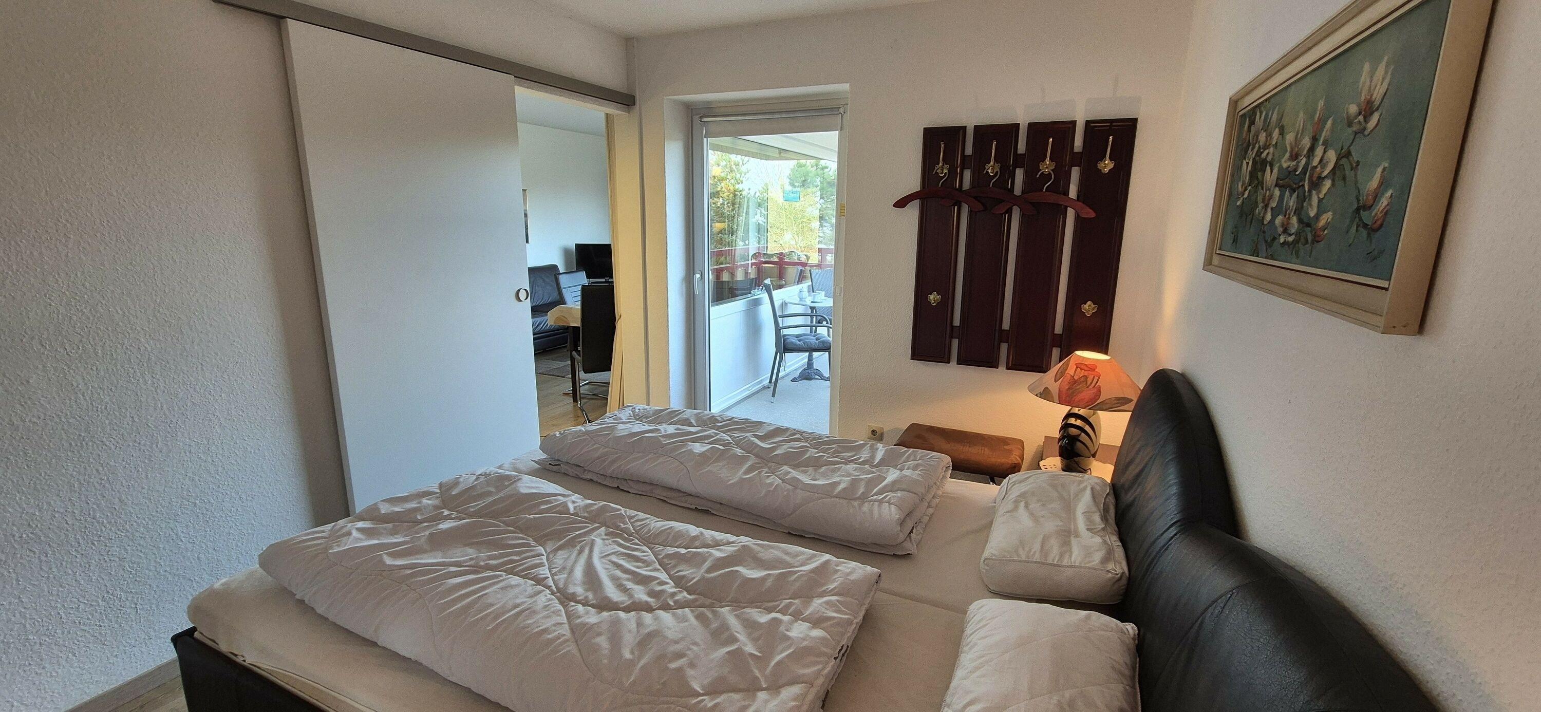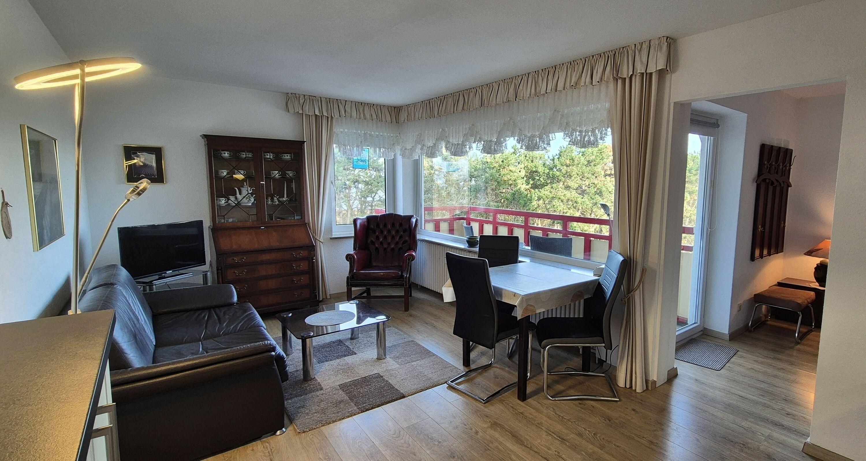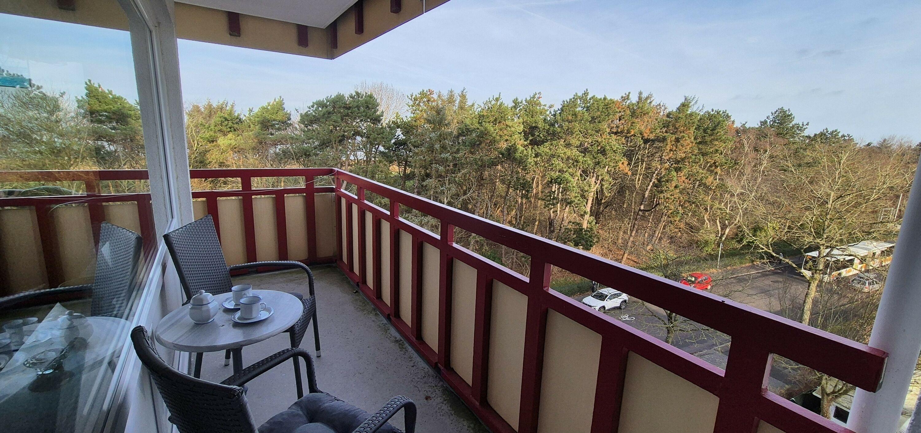 Das Appartement 63 ist ein 2-Raum-Appartement im 5. Obergeschoss für bis zu 4 Personen mit 39 qm. Der möblierte Ostbalkon mit Meerblick bietet morgens Sonne und nachmittags Schatten.