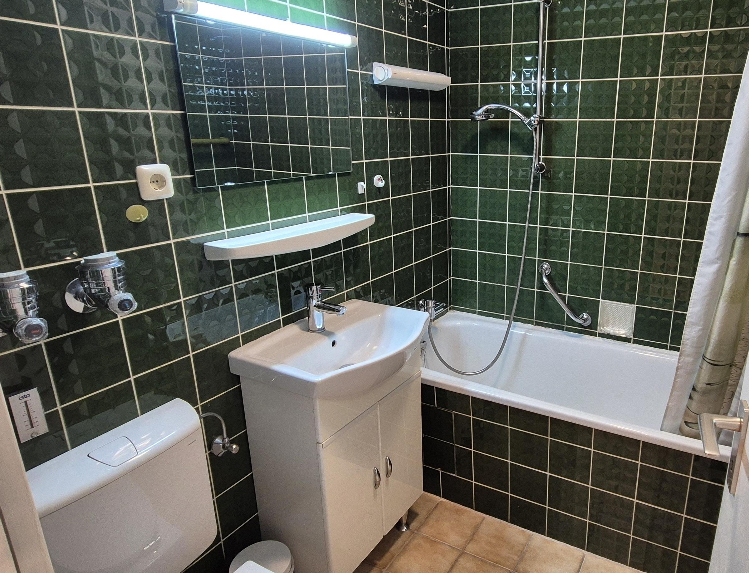 Das Appartement besteht aus einem Schlafzimmer mit Doppelbett, einem Wohnbereich mit ausziehbarem Schlafsofa, eine voll ausgestattete integrierte Küche, einem Badezimmer mit Badewanne sowie WC.