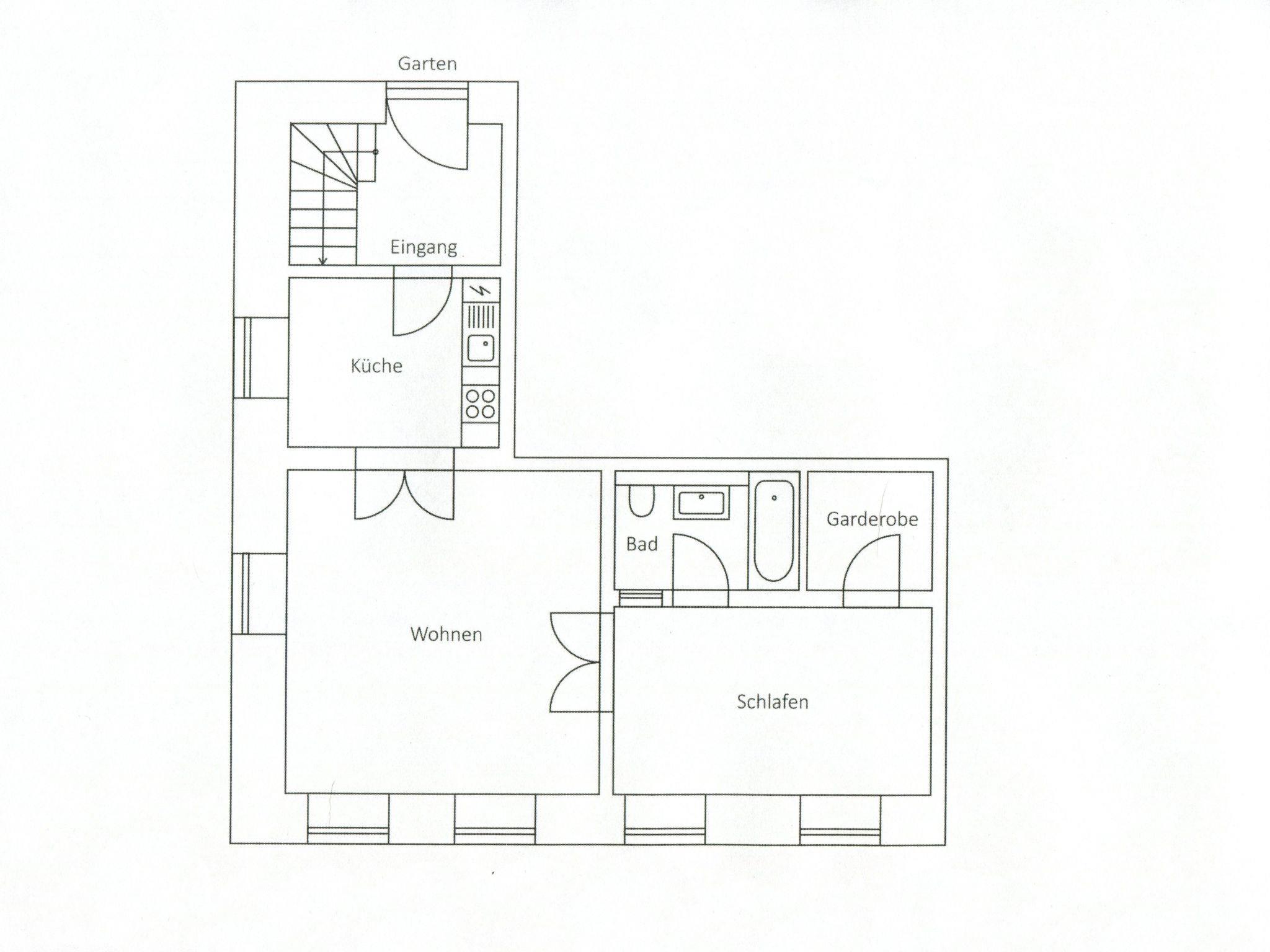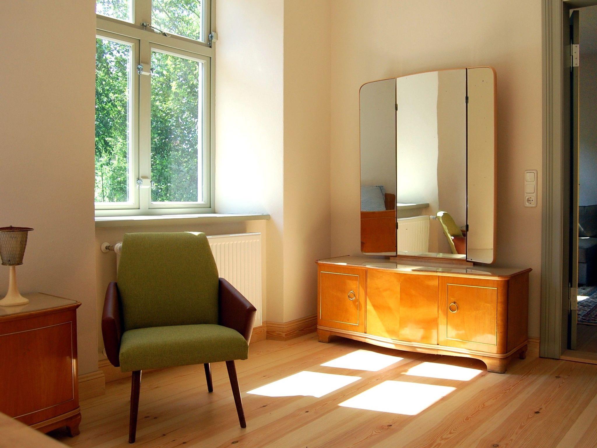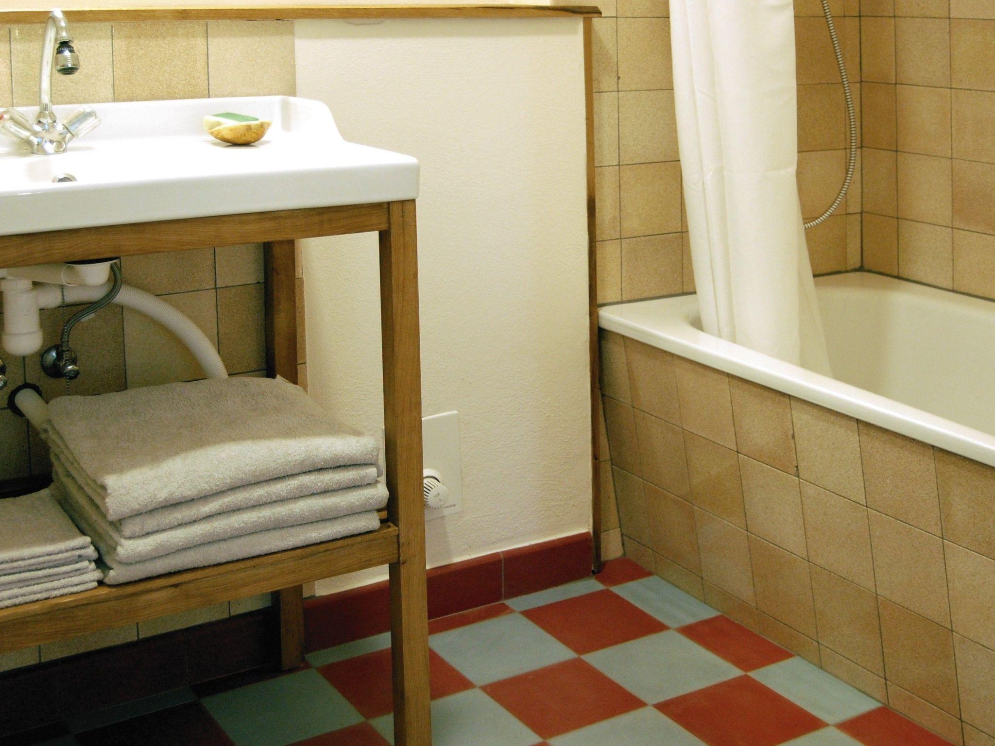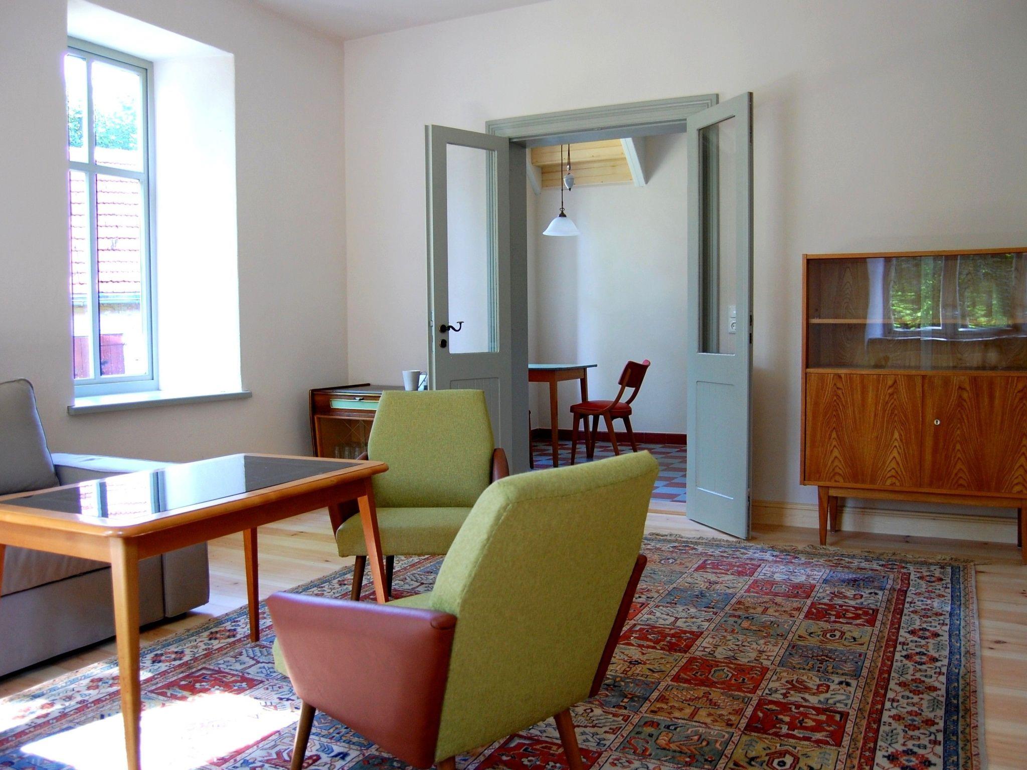 The non-smoking apartment is furnished in a 1950s/60s style and is on the ground floor. The kitchen and bathroom have cement tile floors and underfloor heating. The living room and bedroom have traditional wooden floorboards. The sofa in the living room can be used as a sofa bed for two people. The bedroom is furnished with a double bed (180 x 200cm). A child’s bed (up to 2 years old) and a highchair can be provided.