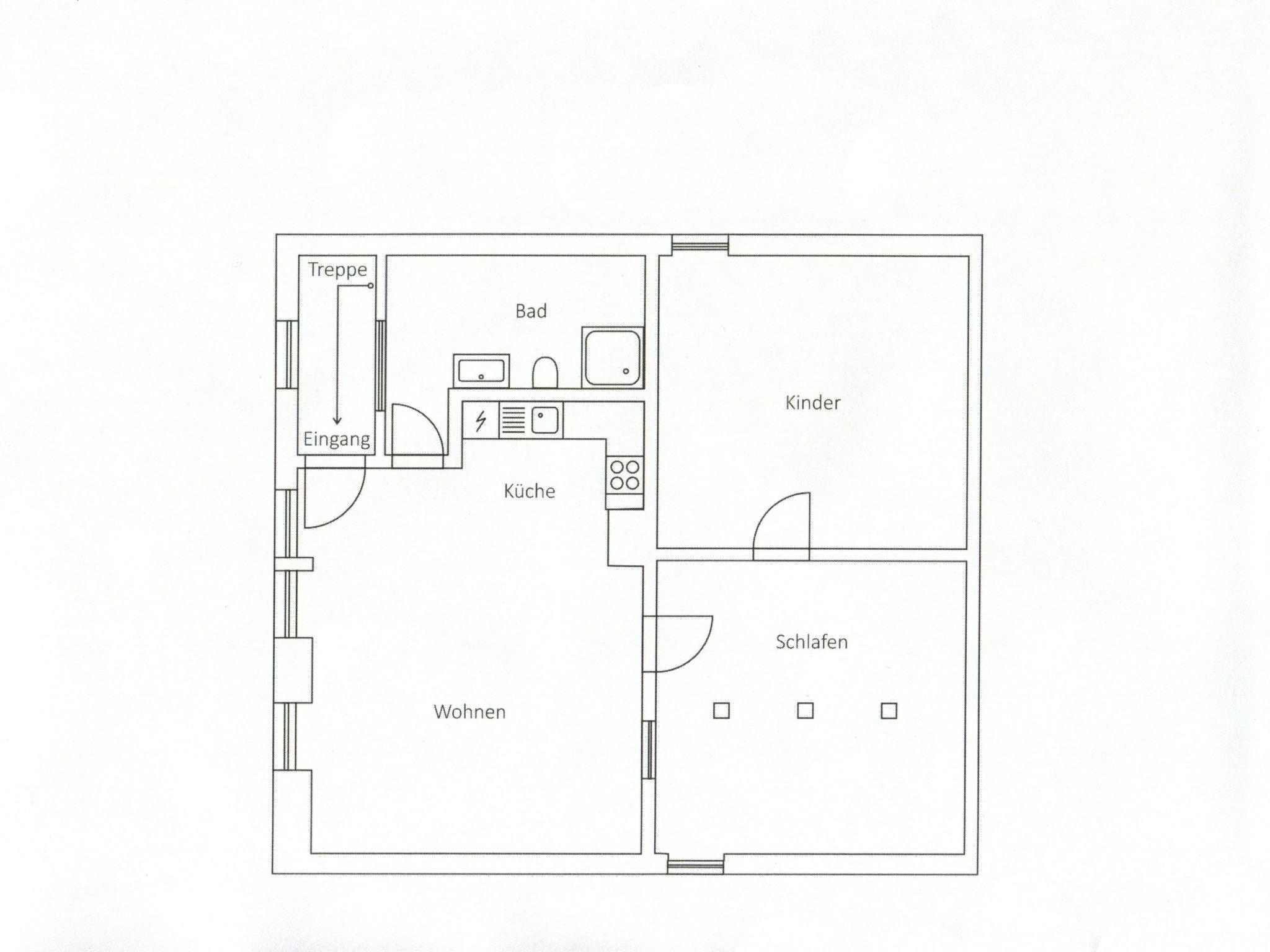 The non-smoking apartment measures 85m² and can accommodate four people in two bedrooms. A child’s bed (for a toddler up to 2 years old) and a highchair can be provided. All the rooms have traditional wooden floorboards. One bedroom is furnished with a double bed (180 x 200cm), the other with two single beds (100 x 200cm). The kitchen is integrated into the very spacious living room.