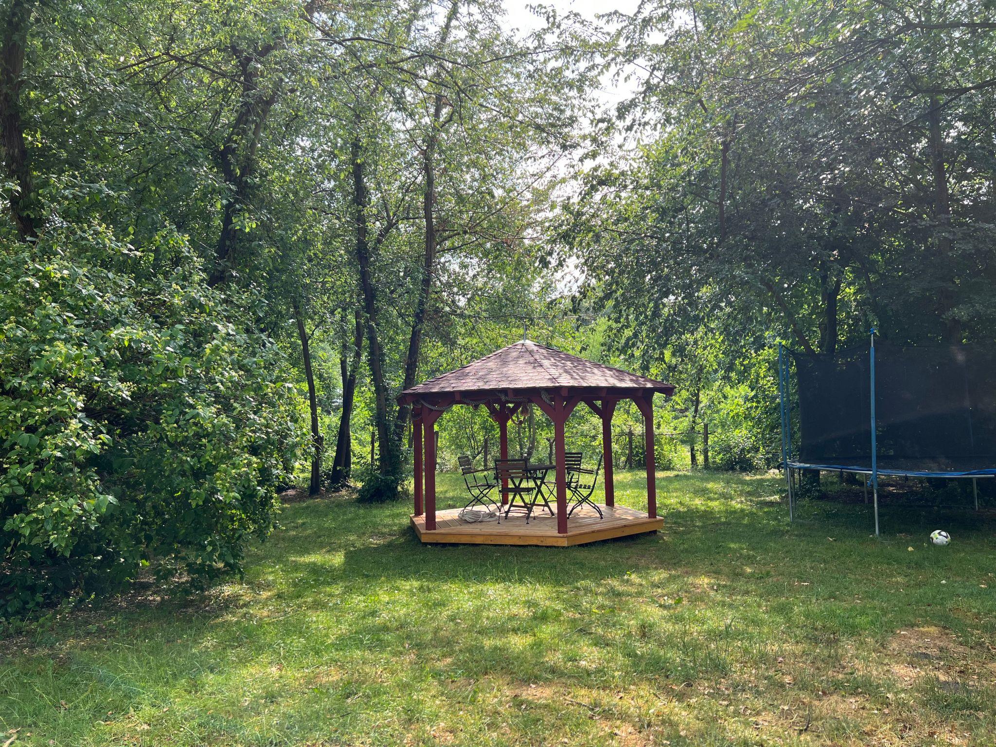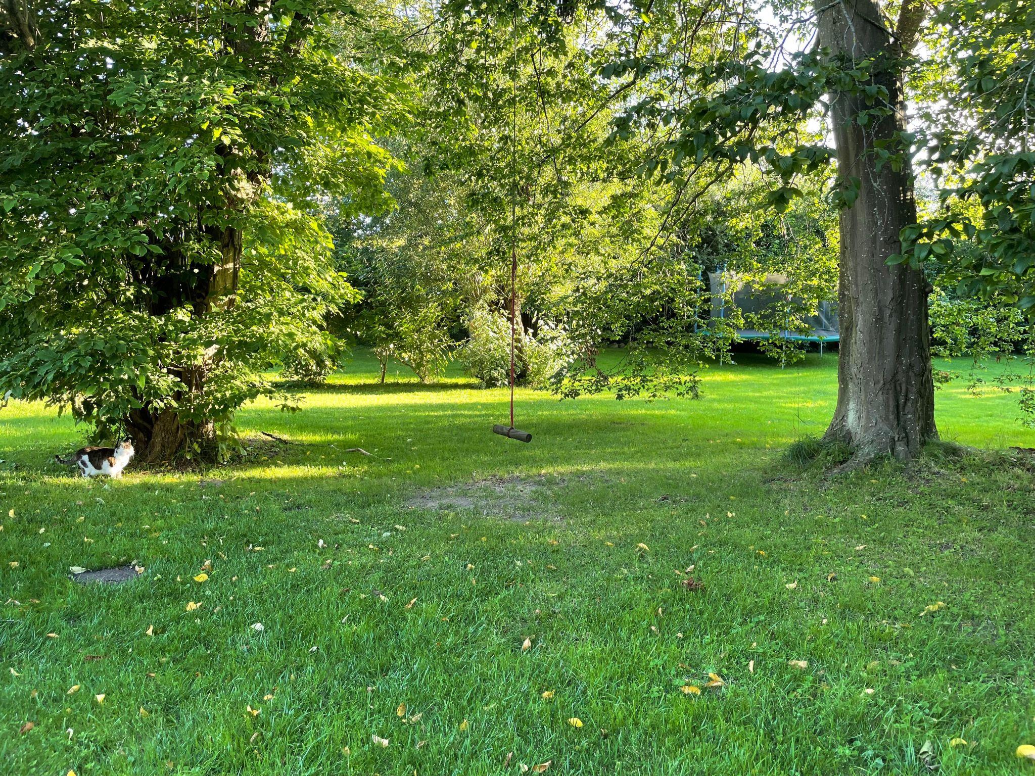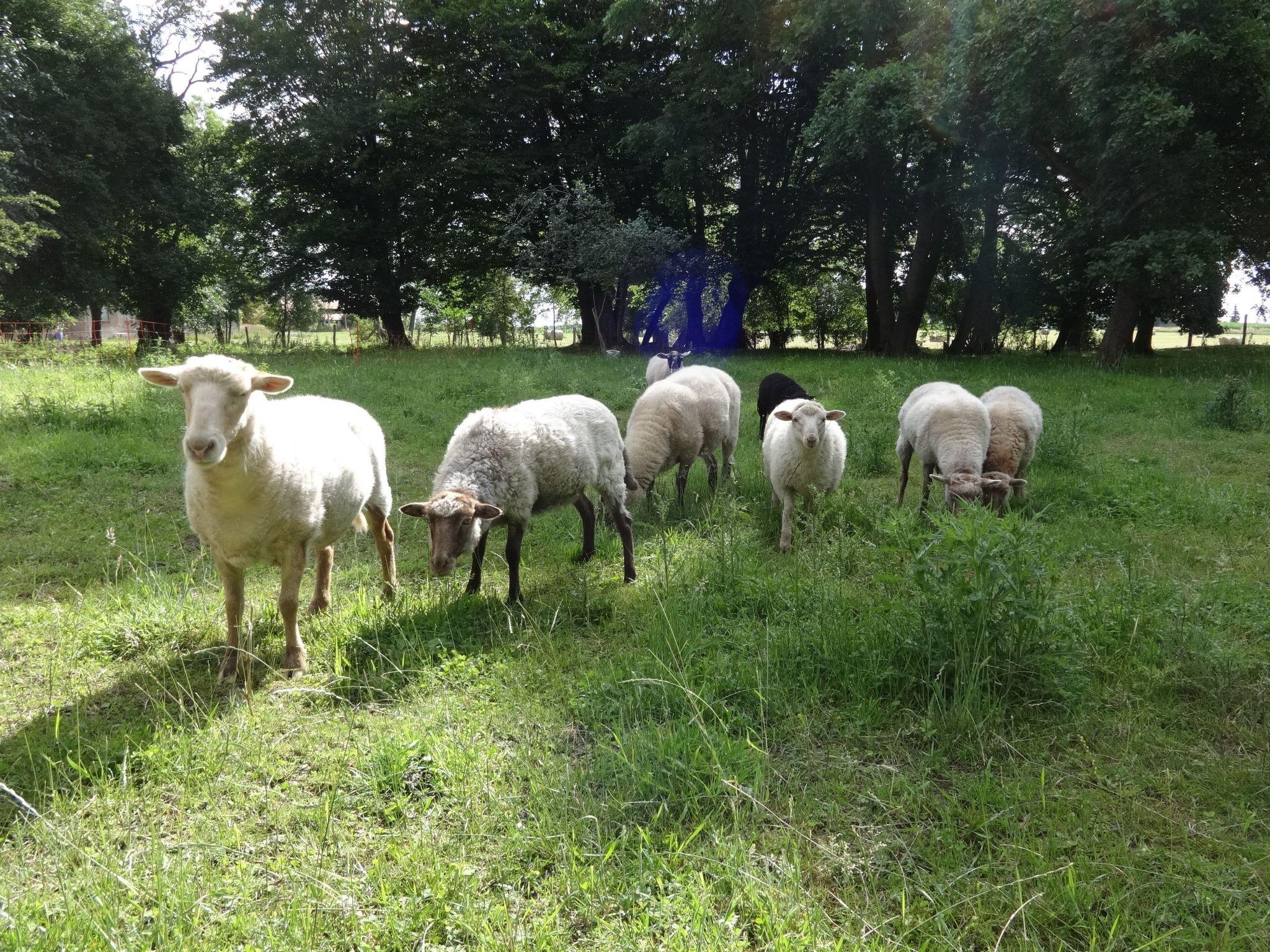 The completely fenced property is 10000 square metres large and has park character. In a fenced-off area there is a small flock of sheep that can be fed with bread (!). There are several shady or sunny seating and sunbathing areas. A charcoal barbecue is available.