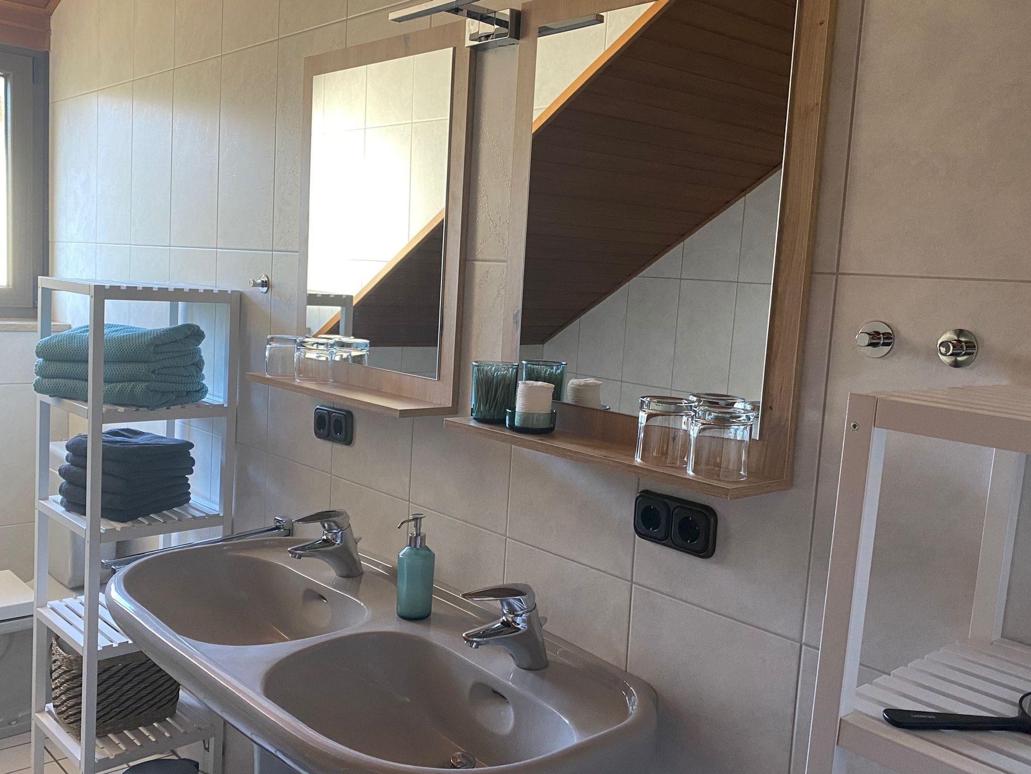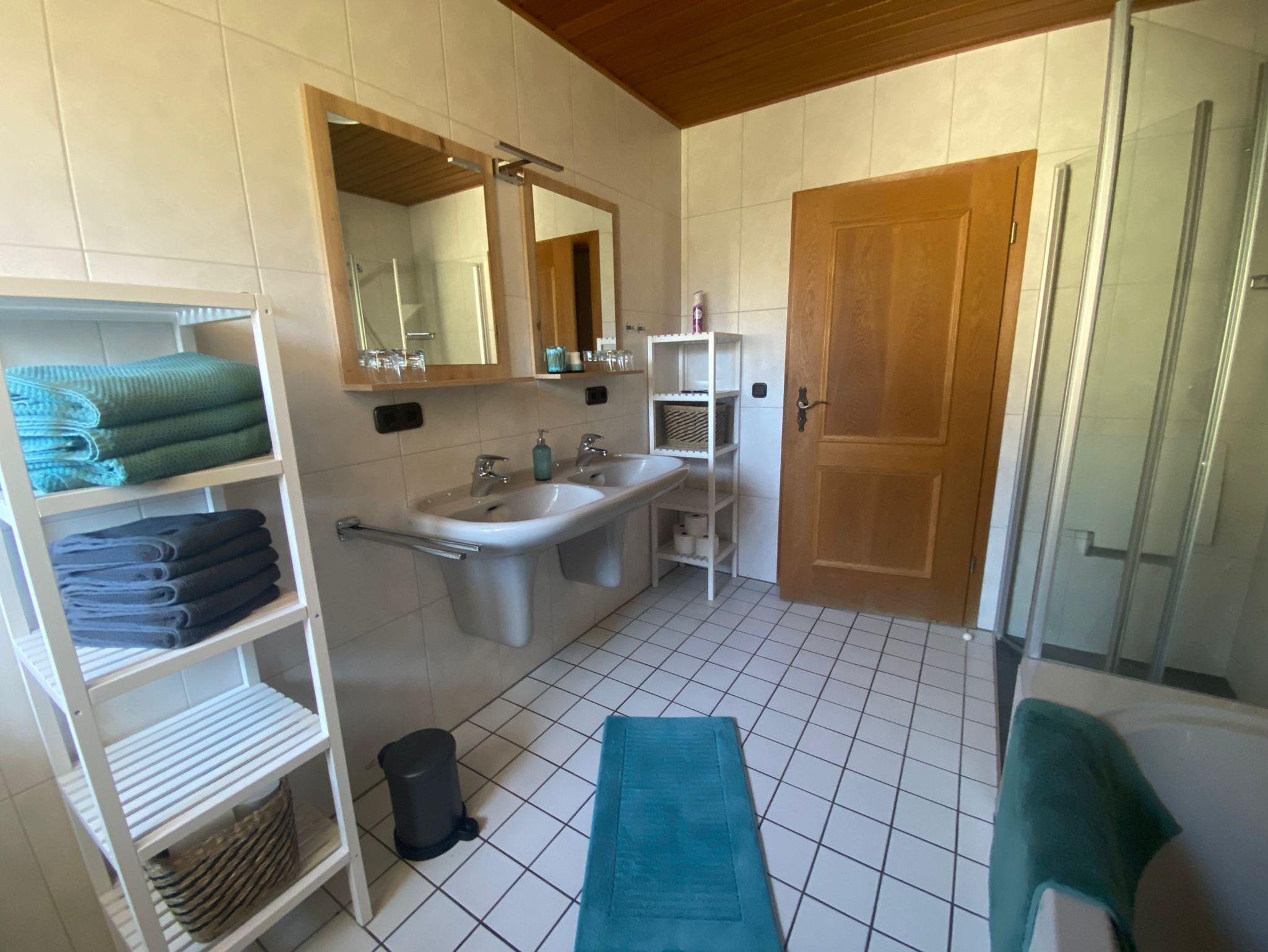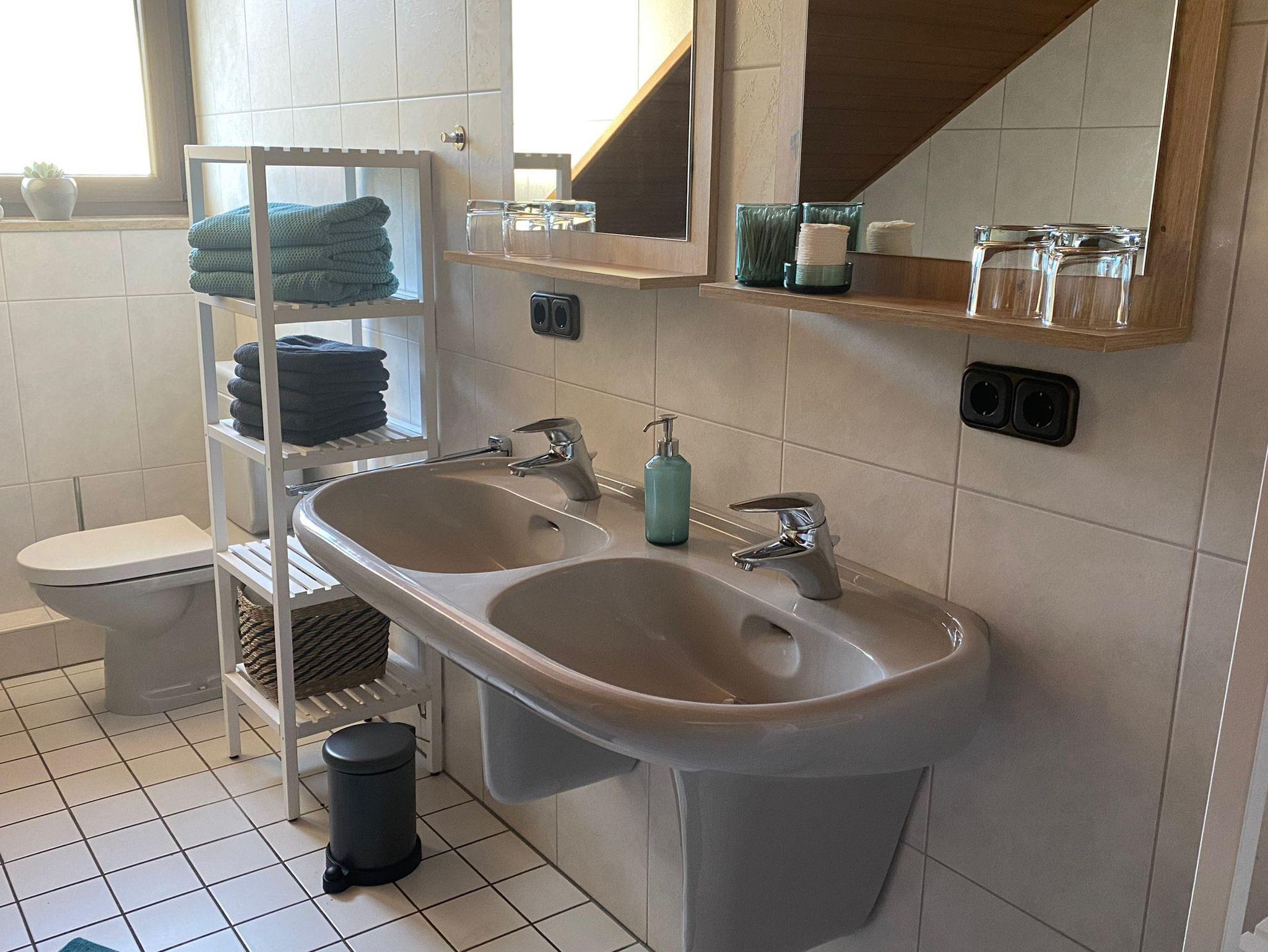 Das Bad verfügt über eine begehbare Dusche, eine Badewanne, ein Doppelwaschbecken und eine Toilette. Außerdem gibt es noch eine separate Gästetoilette. Seife und Klopapier stehen bereit, ebenfalls Handtücher, Badetücher und ein Fön.