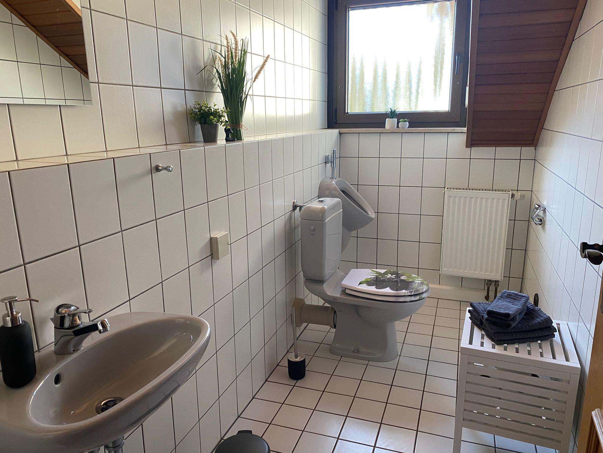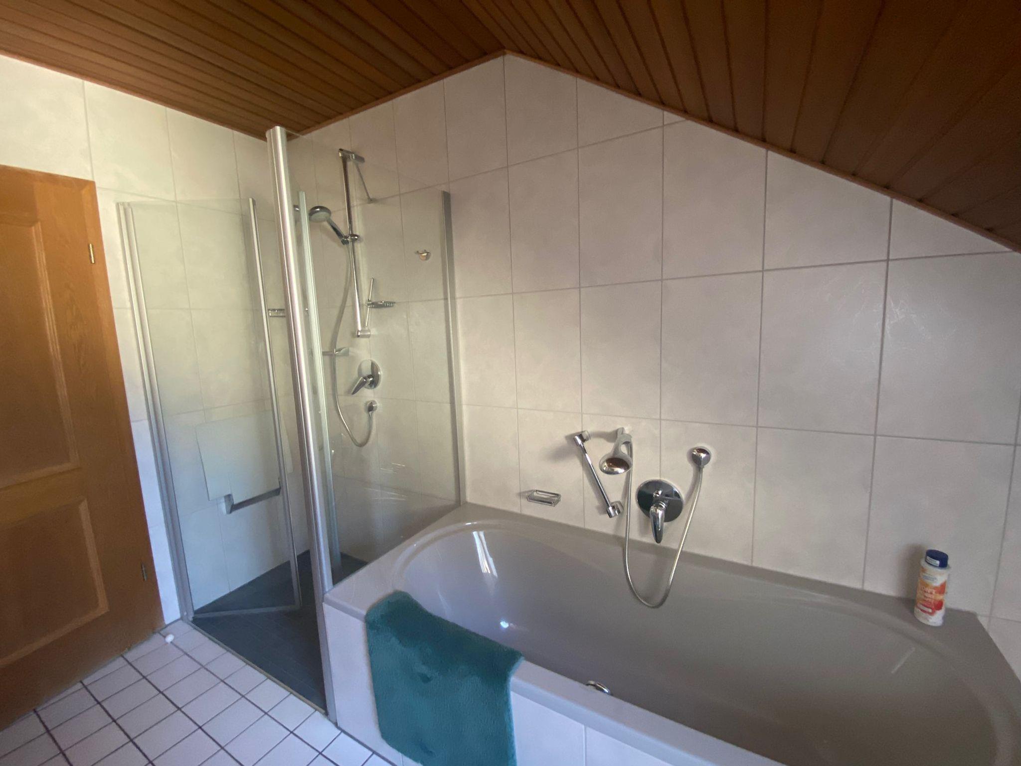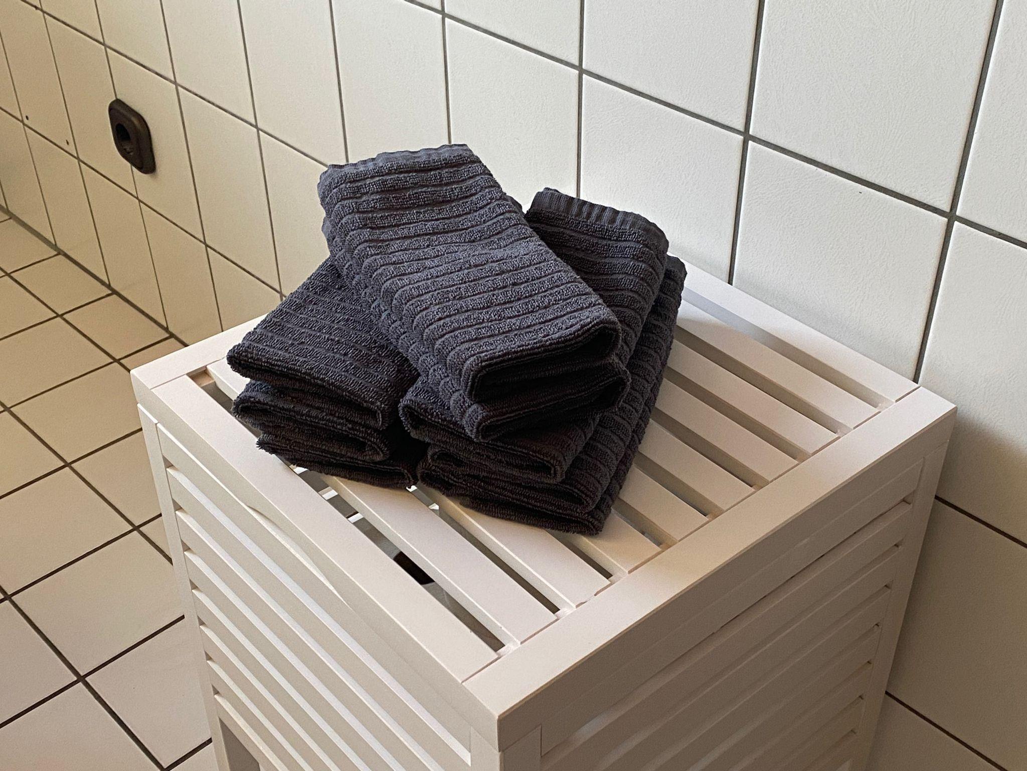 Das Bad verfügt über eine begehbare Dusche, eine Badewanne, ein Doppelwaschbecken und eine Toilette. Außerdem gibt es noch eine separate Gästetoilette. Seife und Klopapier stehen bereit, ebenfalls Handtücher, Badetücher und ein Fön.