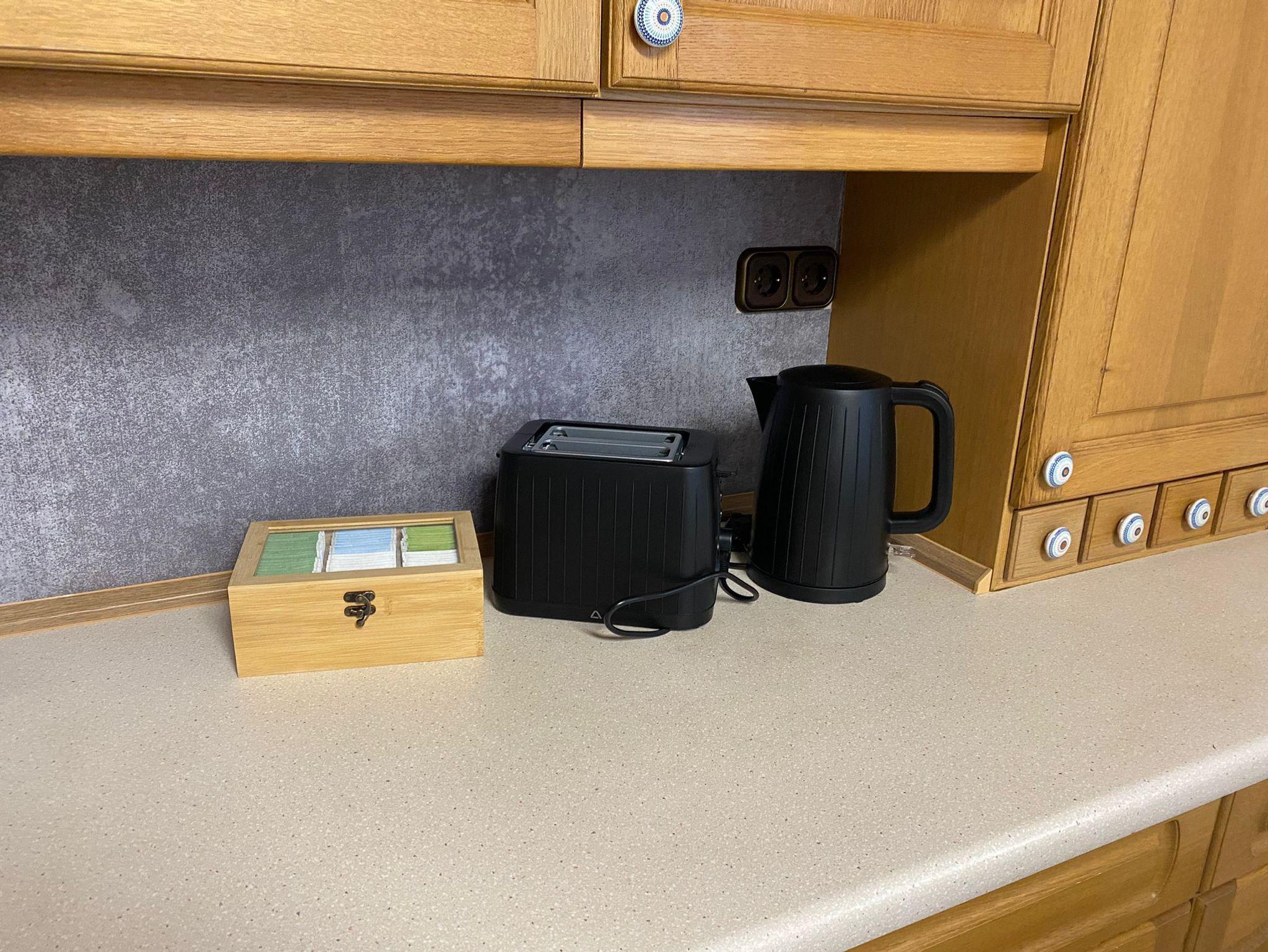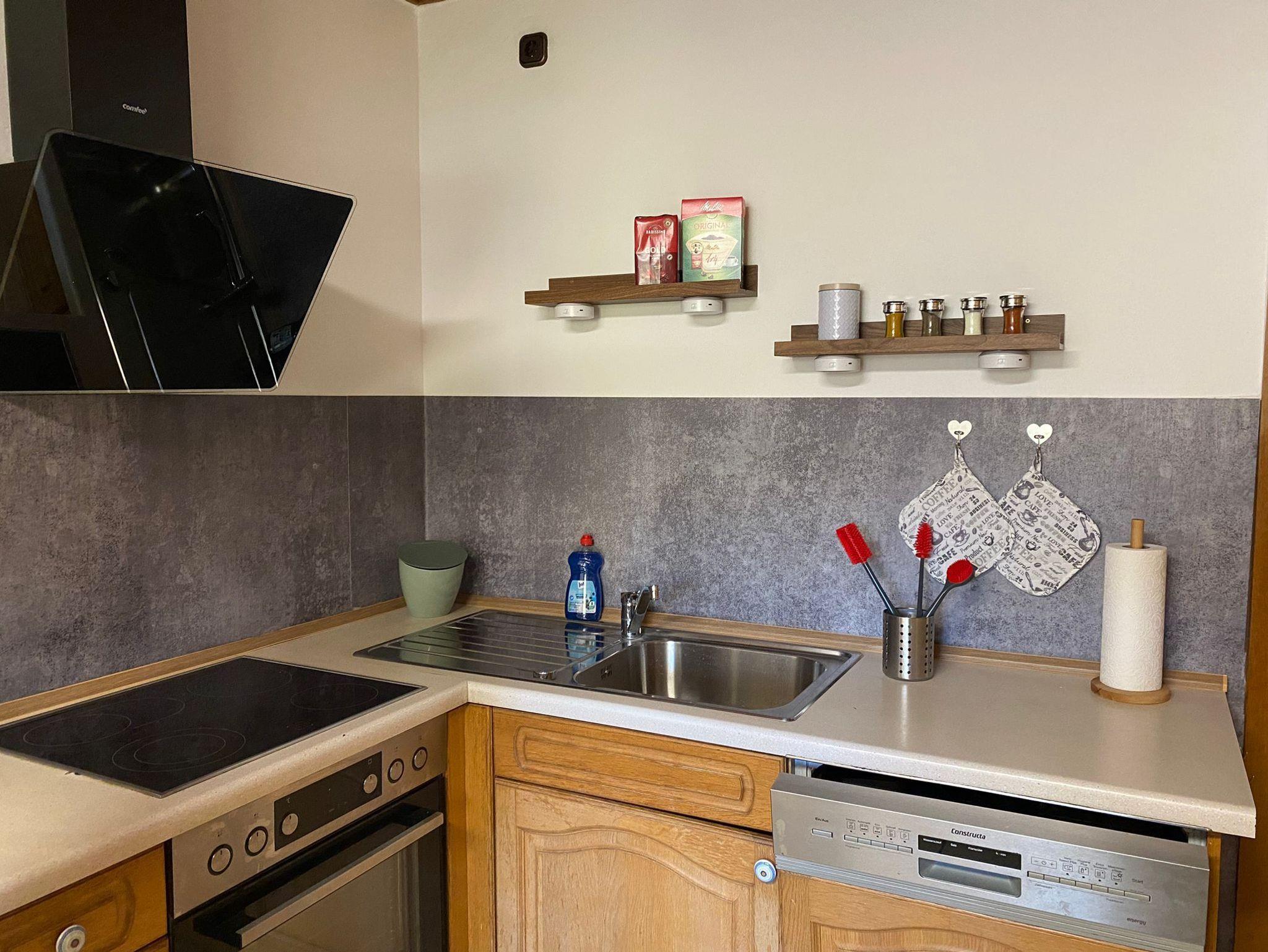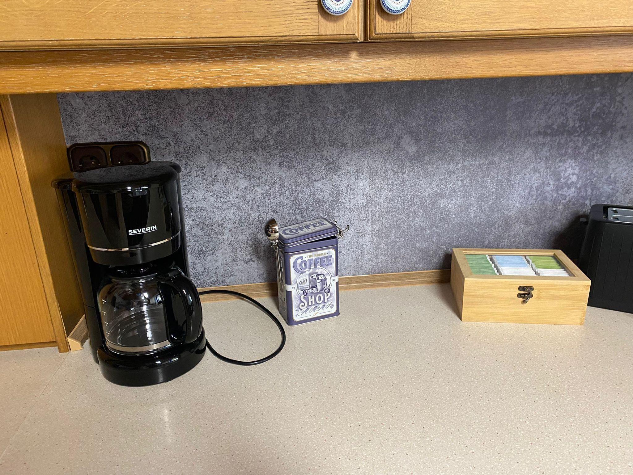 In der geräumigen Küche befindet sich neben einem Herd mit Backofen und einem Esstisch alles, was zum Kochen benötigt wird: Toaster, Eierkocher, Wasserkocher, Kaffeemaschine, Spülmaschine, Geschirrtücher, Wischlappen, sowie Reinigungsmittel sind ebenfalls vorhanden.