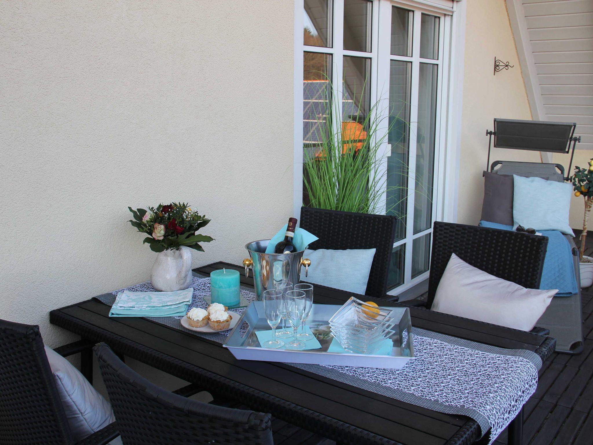 In unserer großzügigen und hellen Ferienwohnung (separate Etage, 88 m²) erwartet Sie ein großer offener Wohn-, Ess- und Kochbereich (35 m²) mit zwei doppelflügeligen Glastüren zum überdachten Süd-Ost-Balkon (18 m²) mit Sitzgruppe, Liegen, Sonnenschirm und Wäscheständer.