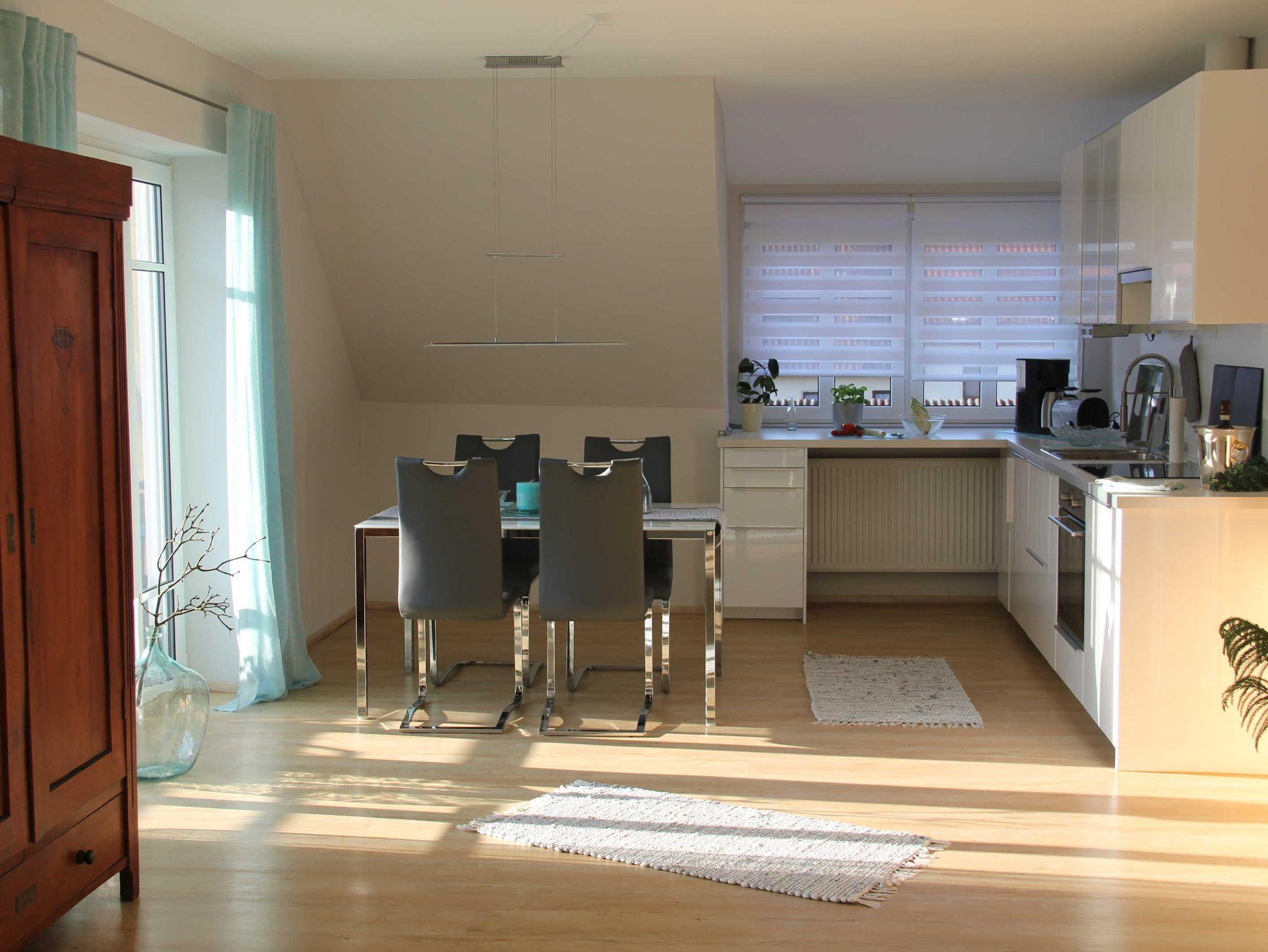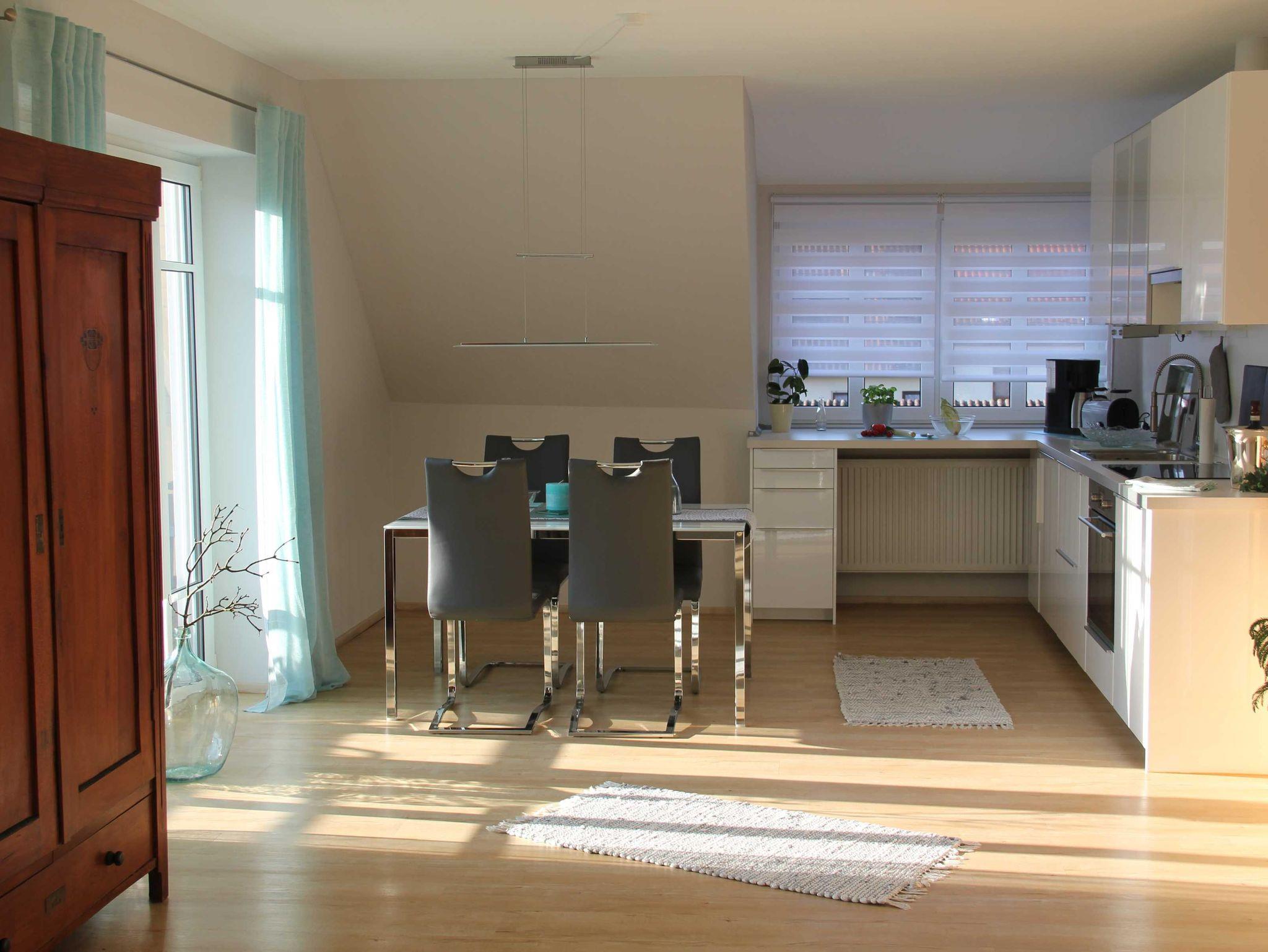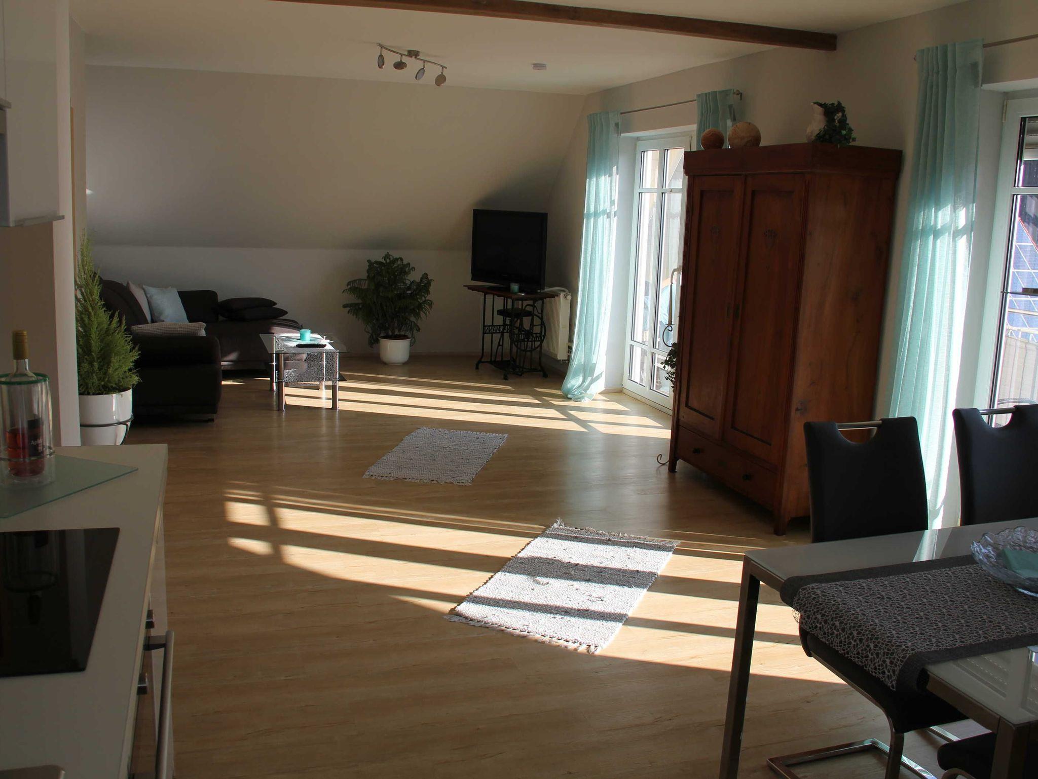 Mit einer lichtdurchfluteten, großzügigen und geschmackvoll eingerichteten 3-Zimmer-Ferienwohnung im Dachgeschoss bieten wir bis zu 4 Erwachsenen und 1 Kleinkind viel Raum zum Entspannen und Wohlfühlen in ungestörter Privatsphäre auf einer separaten Etage.