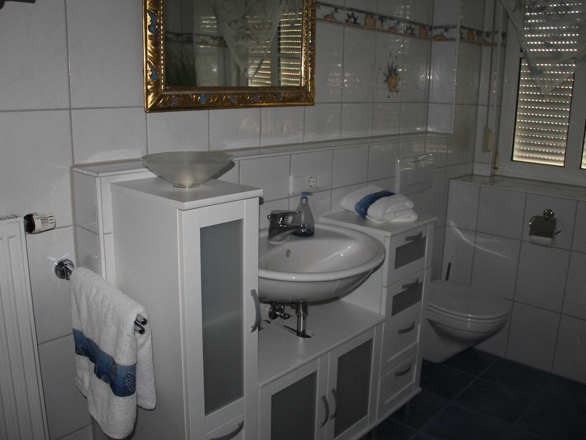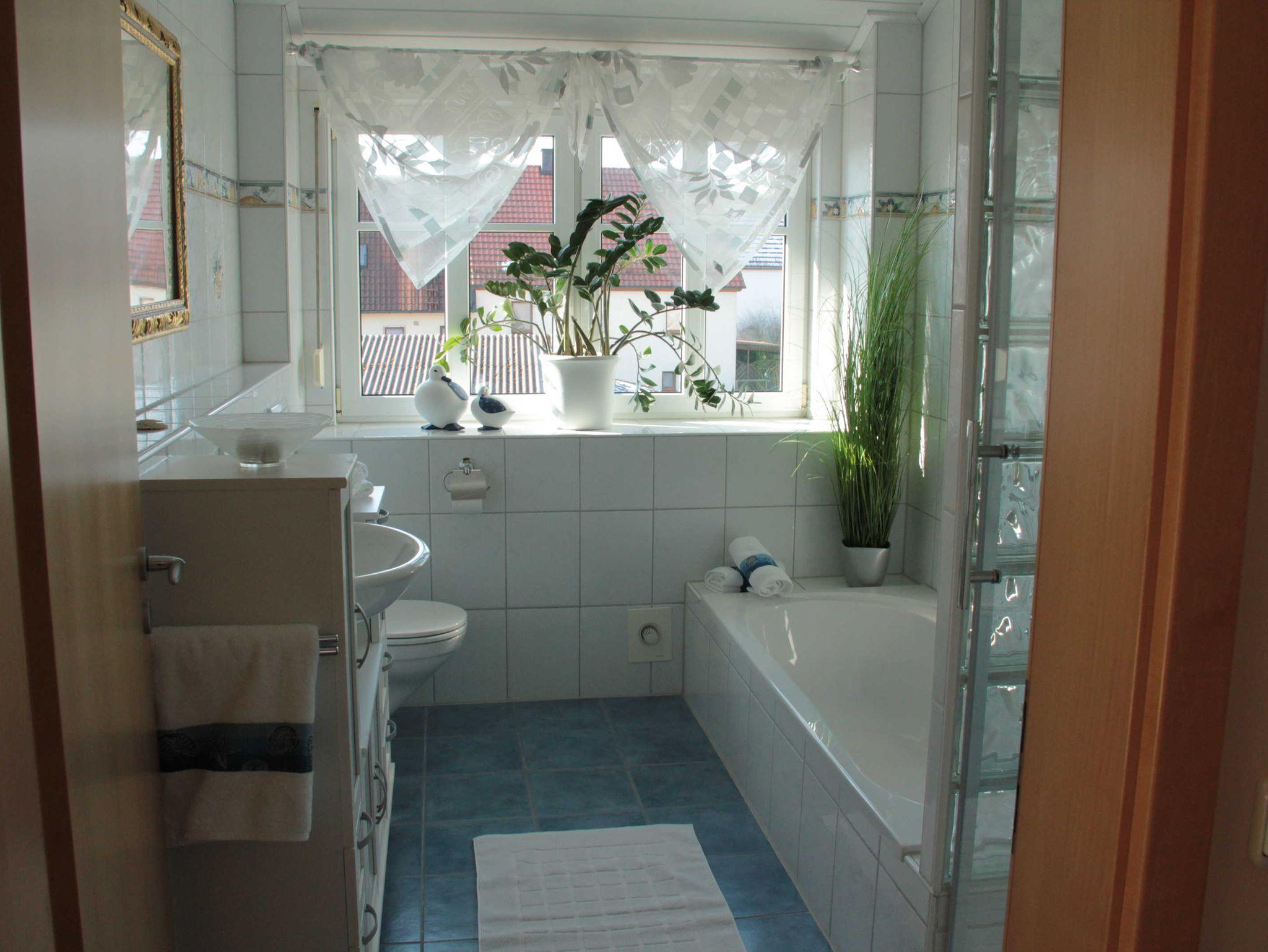 Das Tageslichtbad (7 m²) verwöhnt mit Badewanne, Dusche, Badmöbel mit Waschbecken, Kosmetikspiegel, Föhn, Handseife und WC.