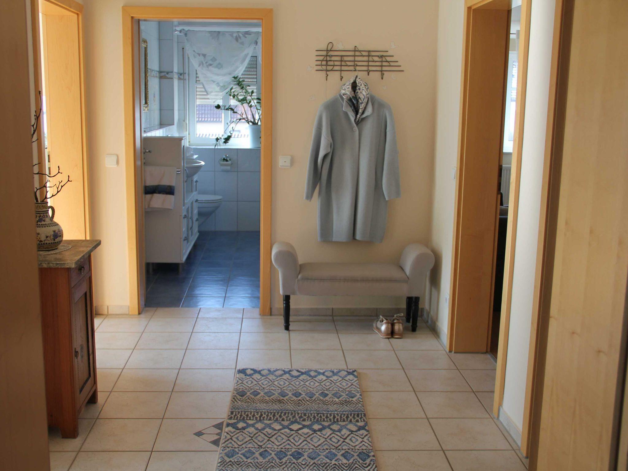 Ein Garderobenständer und eine Sitzbank sowie ein großer Spiegel vervollständigen in der Diele (8 m²) die Ferienwohnung.