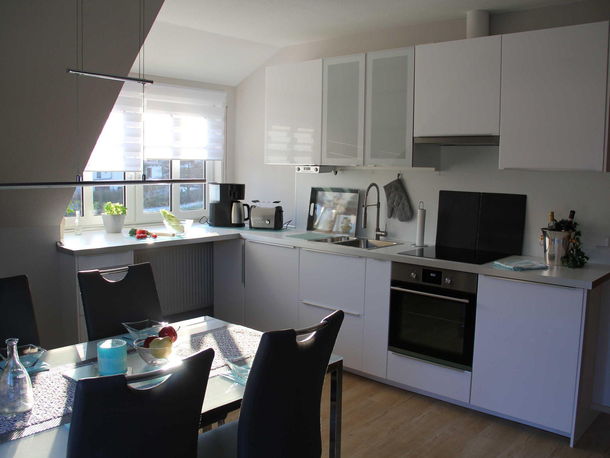 Die Küche ist mit Geschirrspüler, Kühlschrank mit Gefrierfach, Induktionskochfeld und Backröhre, Mikrowelle, Kaffeemaschine, Wasserkocher und Toaster bestens ausgestattet., so dass Sie sich bei Bedarf mühelos selbst versorgen können. Koch- und Essgeschirr sowie eine Grundausstattung an Gewürzen sind großzügig vorhanden.